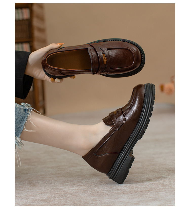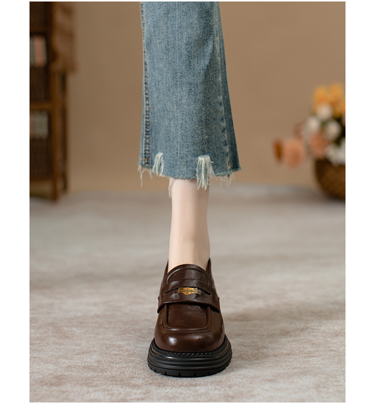 영국 스타일 슬립 온 골드 코인 로퍼 여성 올 매치 두꺼운 밑바닥 라운드 머리 내부 높이 올리는 작은 가죽 신발스토어 가기