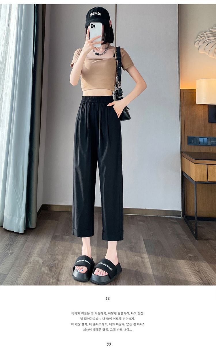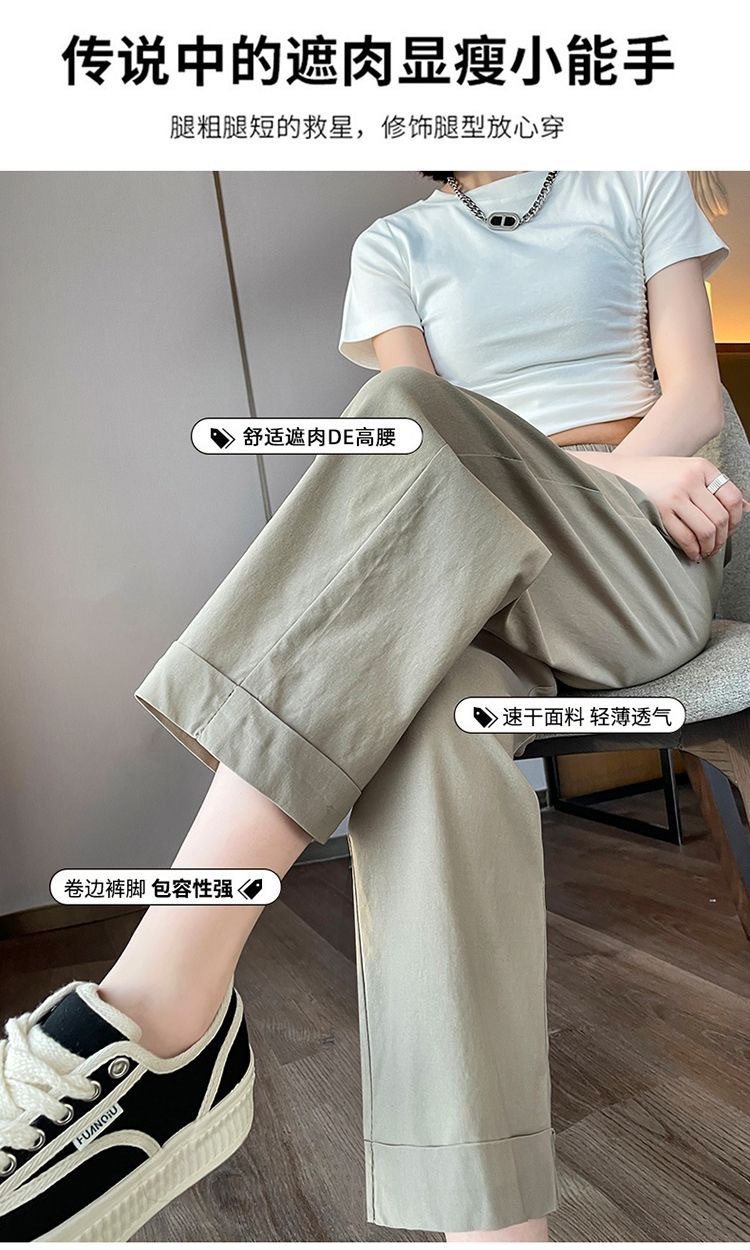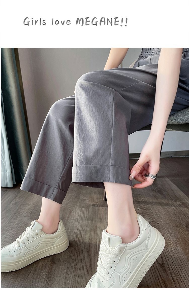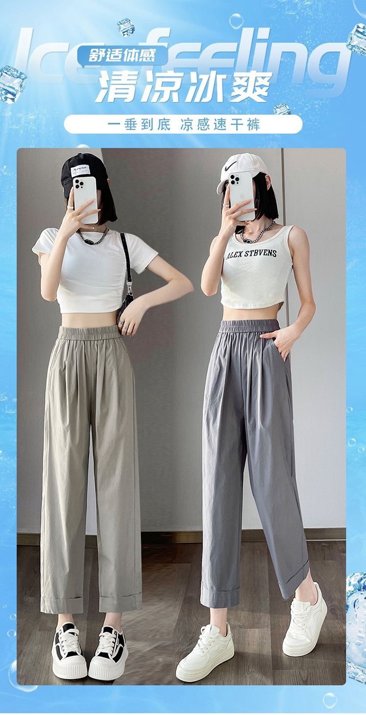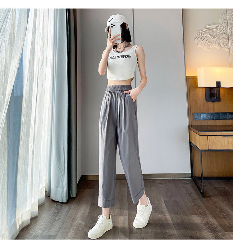여름 높은 허리 아이스 실크 캐주얼 바지 여성용 느슨한 스트레이트 튜브 슬리밍 빠른 건조 자른 넓은 다리 작업복 하렘 바지스토어 가기
