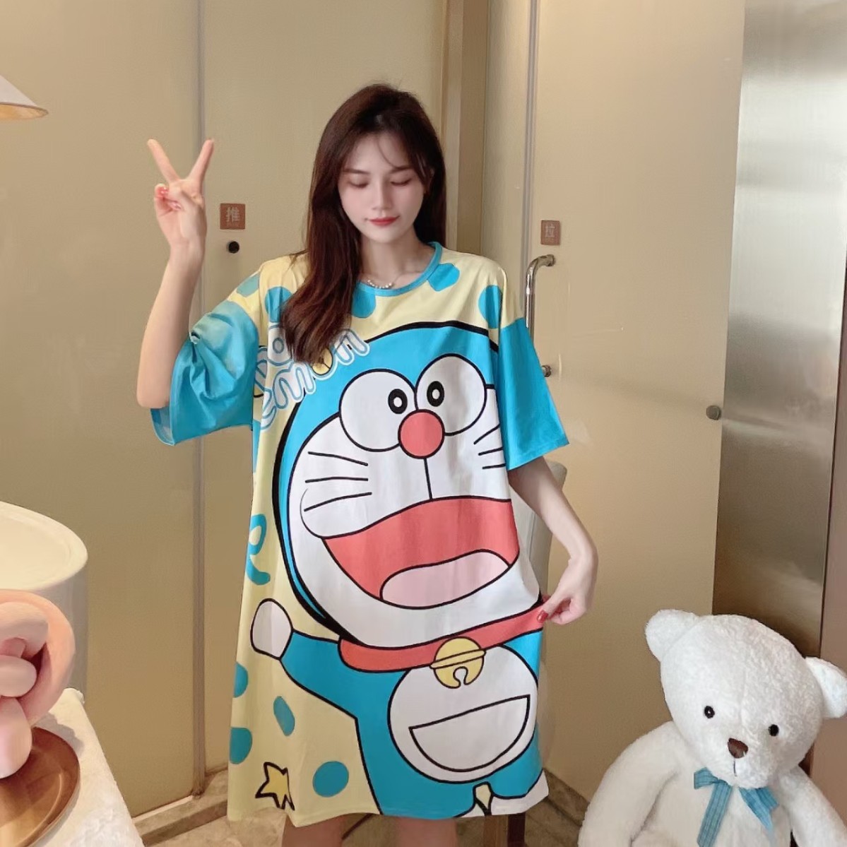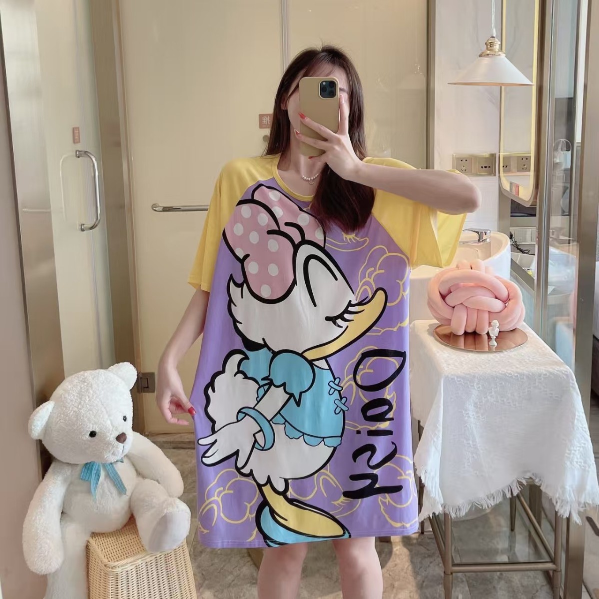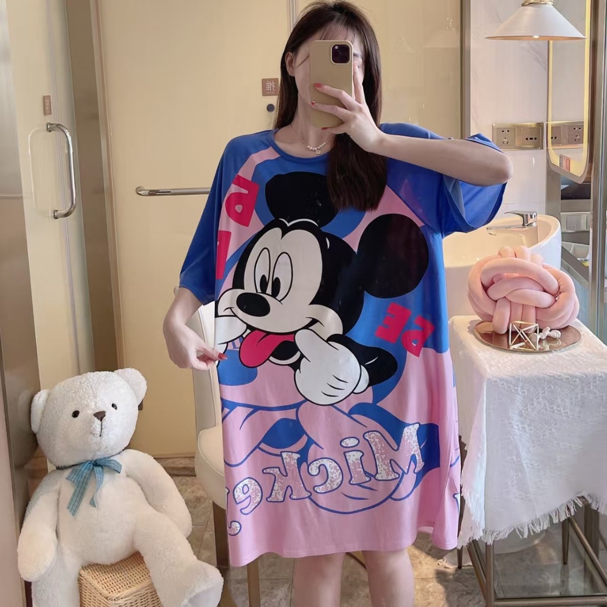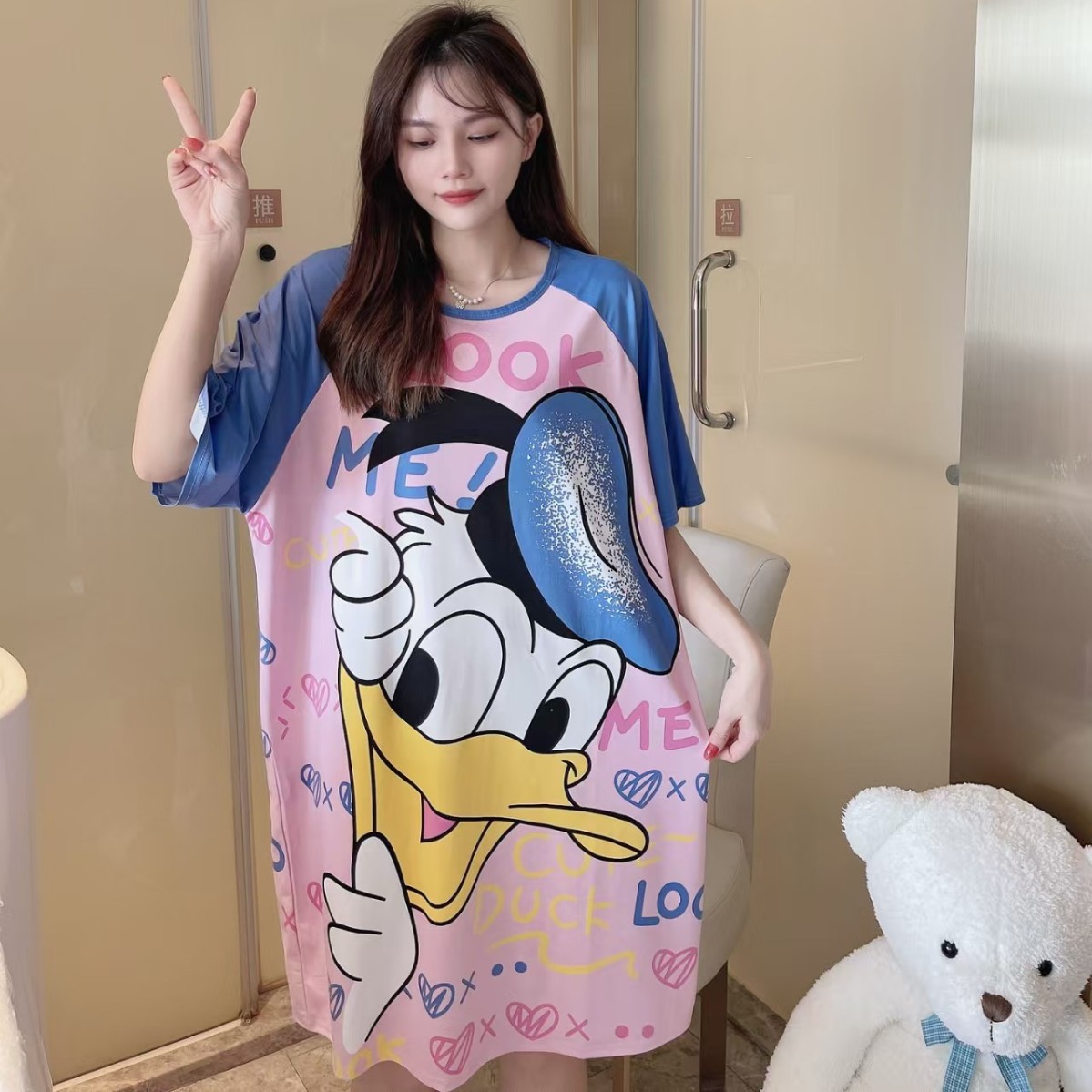 새로운 스타일 잠옷 여름 여성의 반팔 귀여운 만화 그물 빨간 잠옷 여성의 여름 느슨한 여성의 봄과 가을 홈 옷스토어 가기