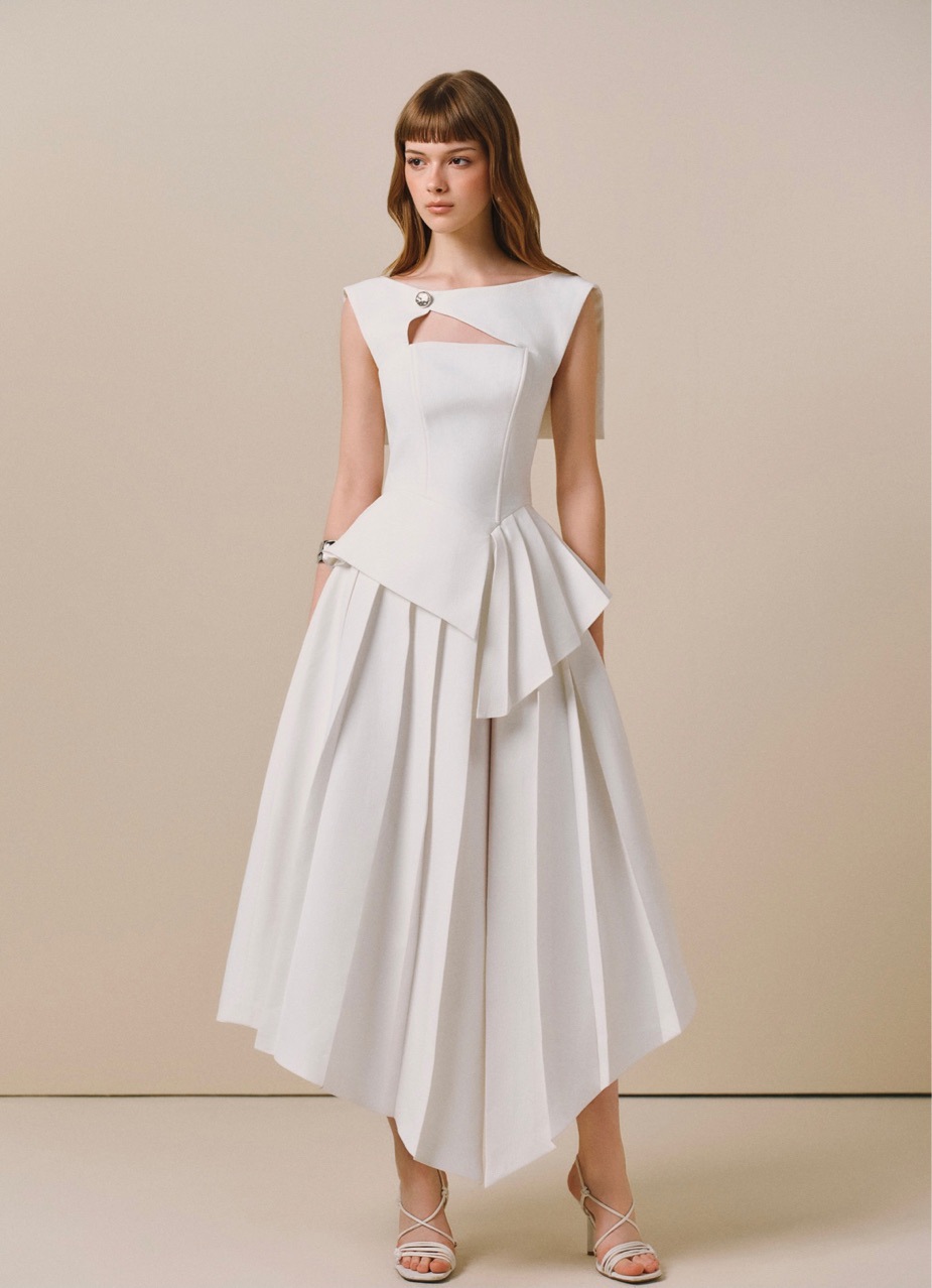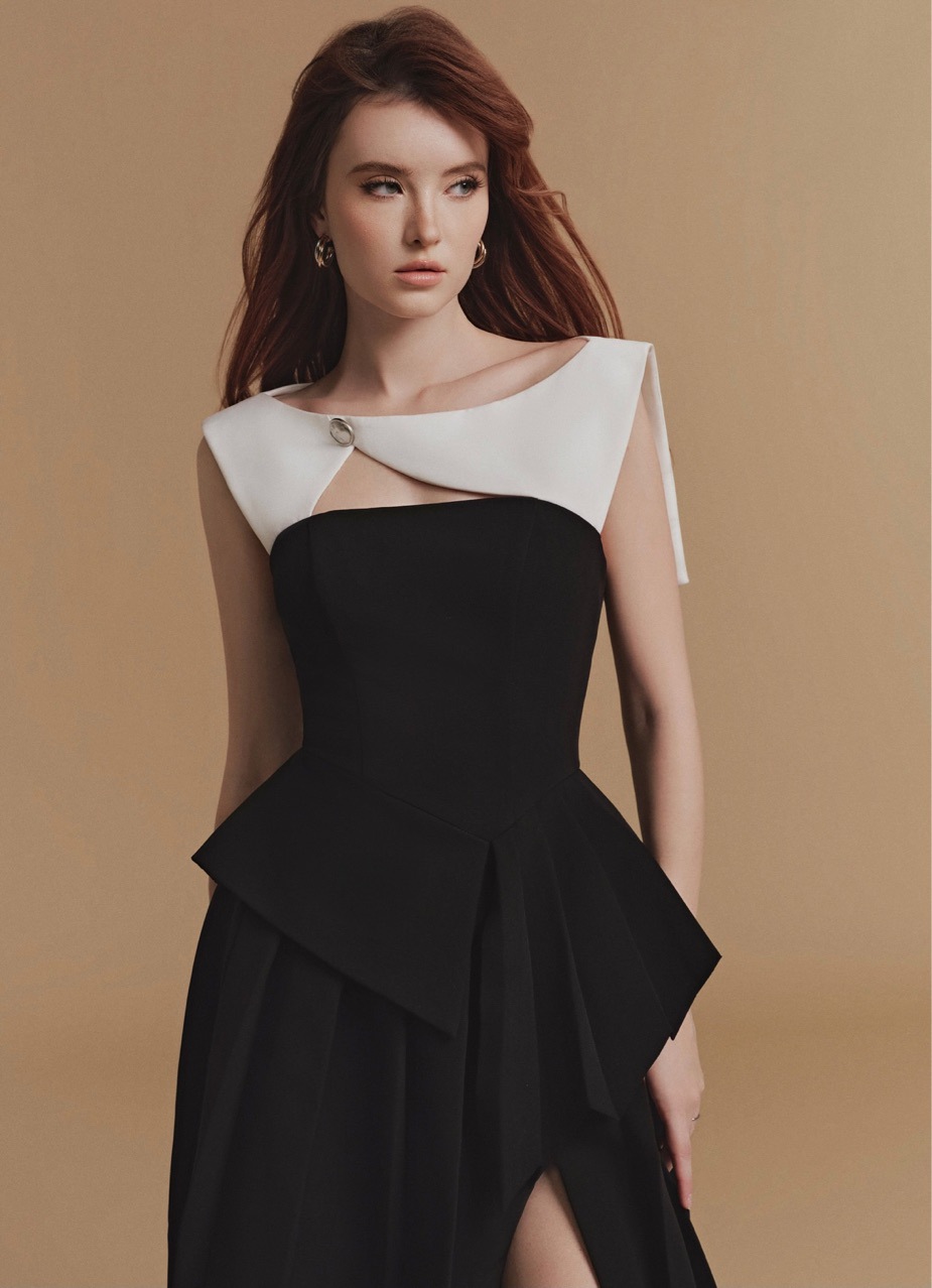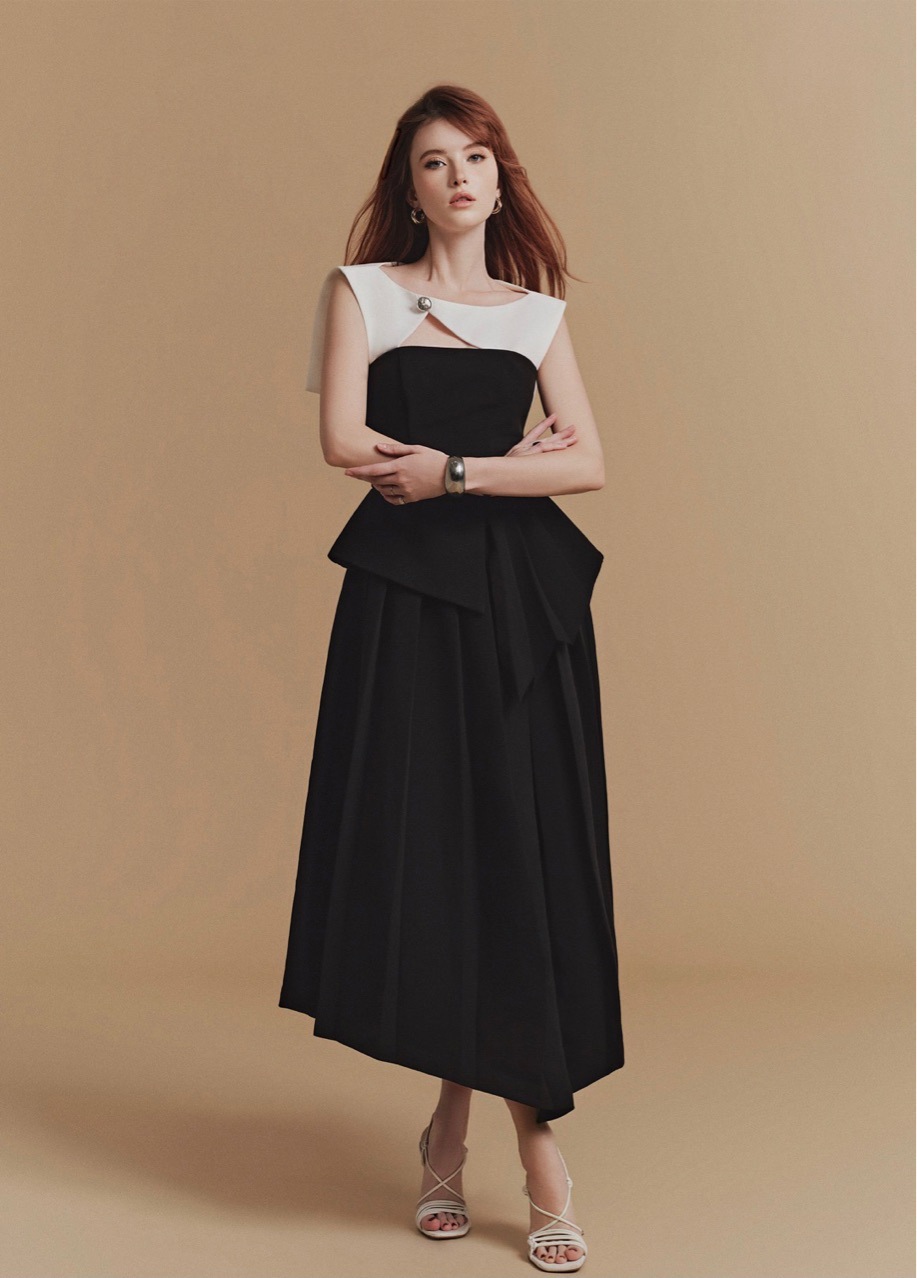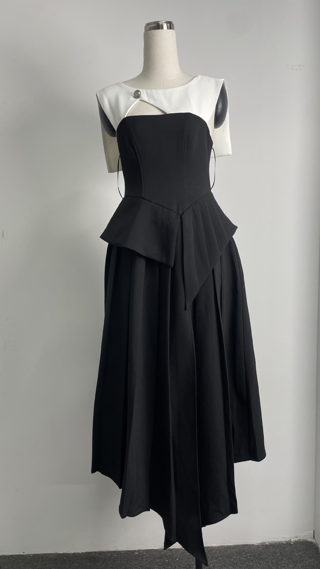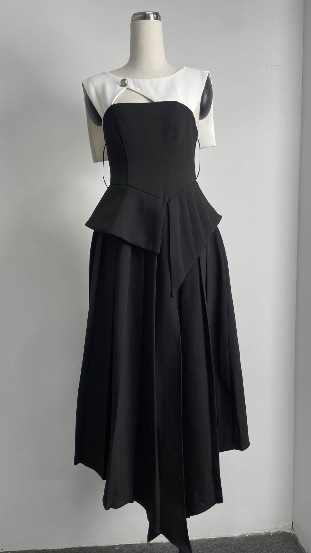 재고 있음, 독특한 디자인의 흑백 배색 불규칙 원피스, 레이스 숄, 투피스 스타일, 허리 조절 가능한 여성용 원피스