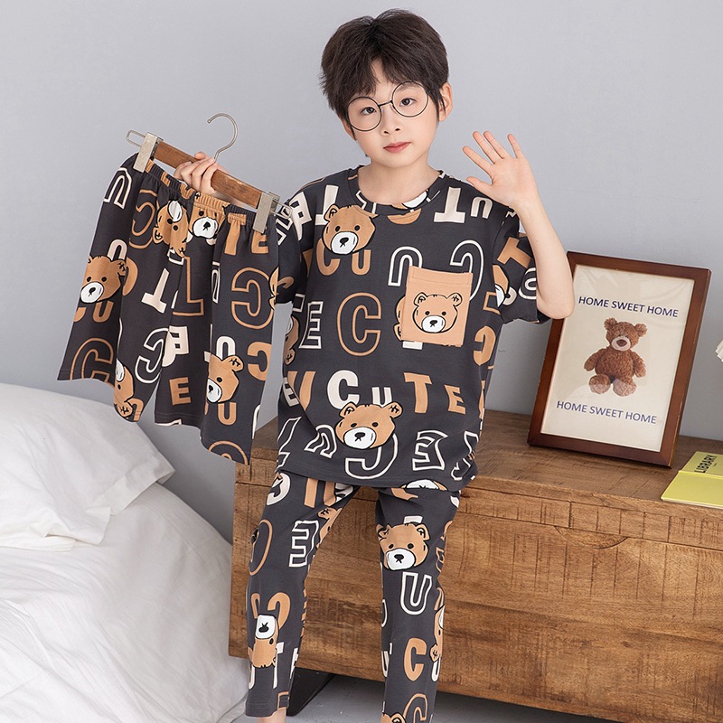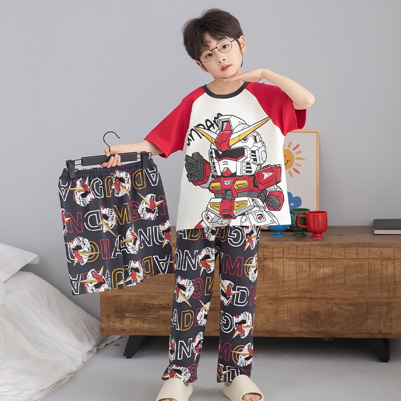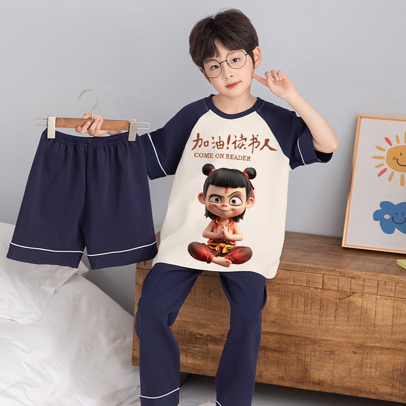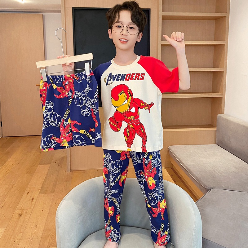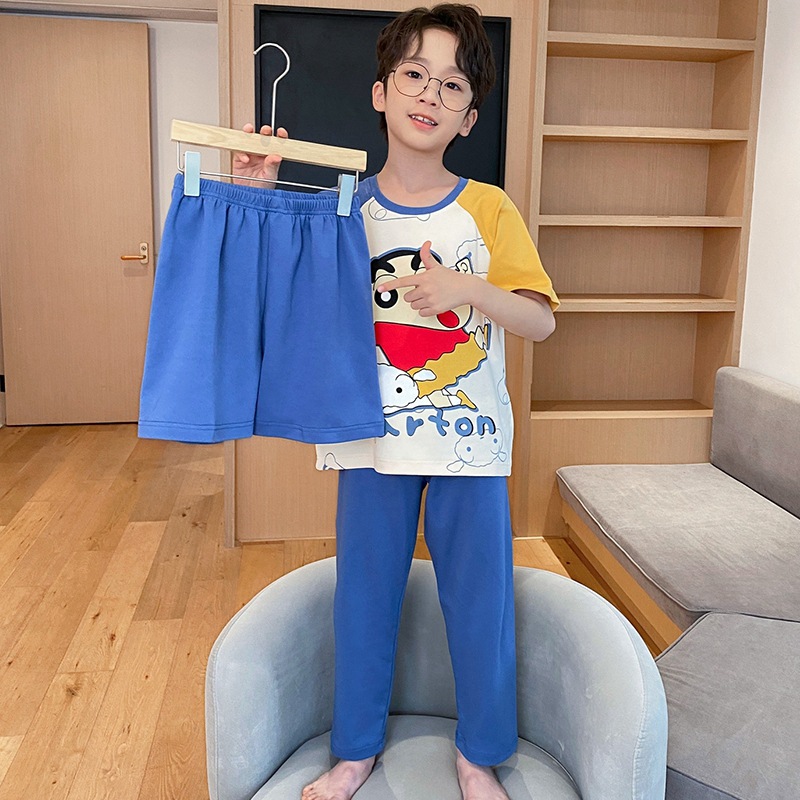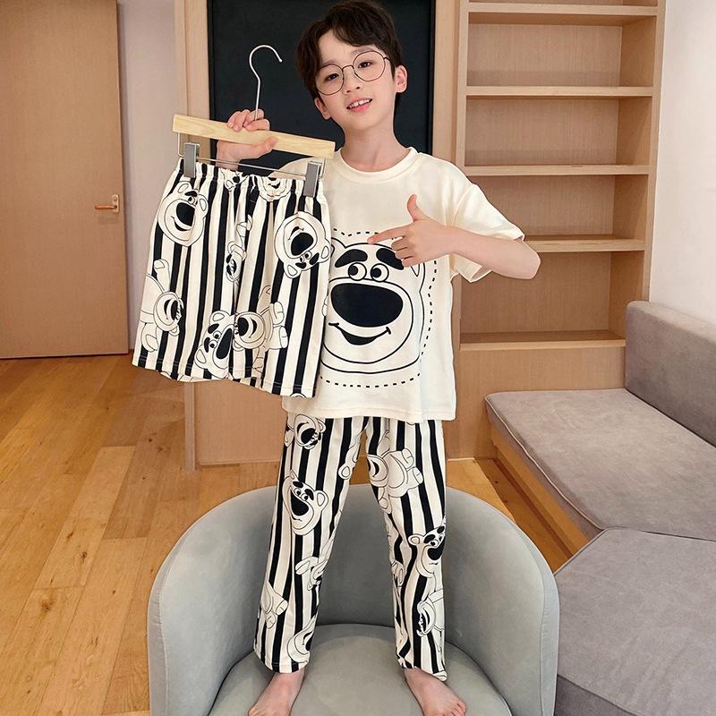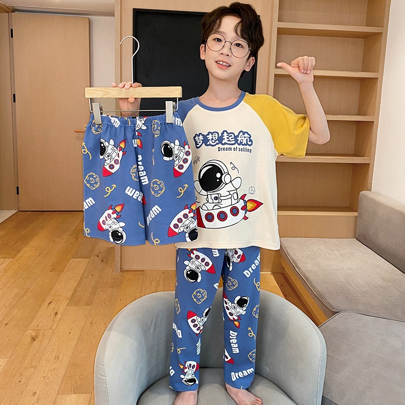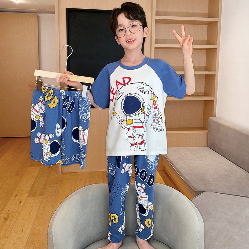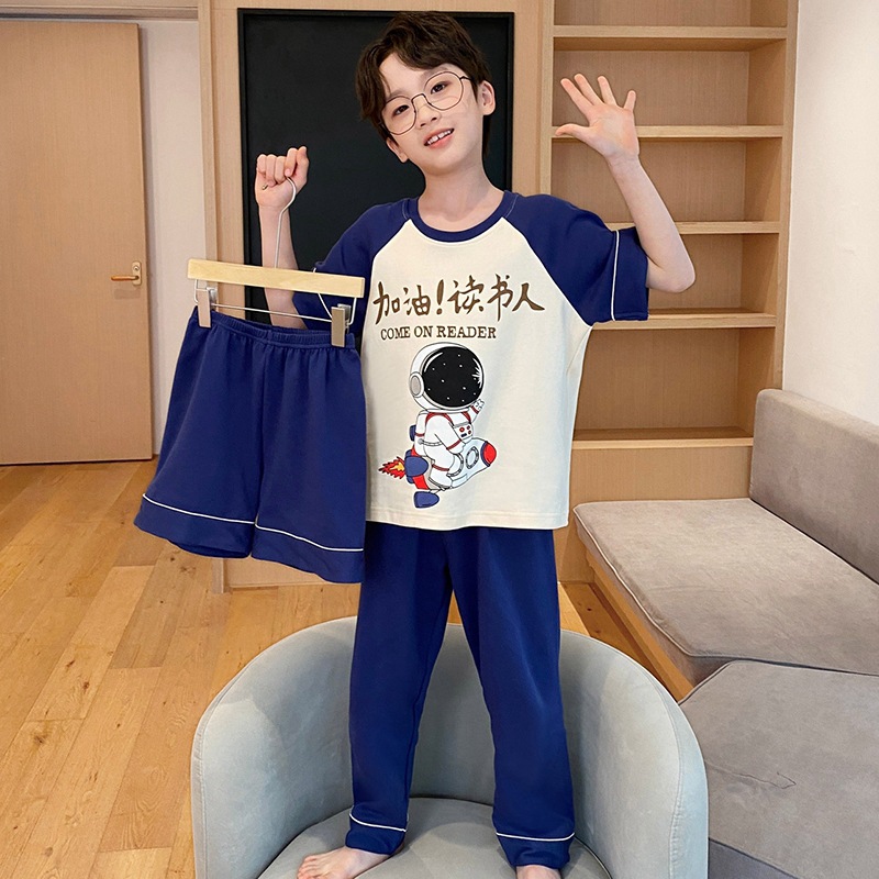 소년 잠옷 2025 새로운 여름 순면 얇은 3 피스 세트 어린이 소년 만화 큰 소년의 봄과 가을 가정 옷스토어 가기