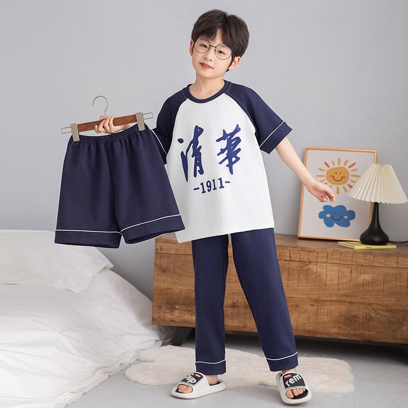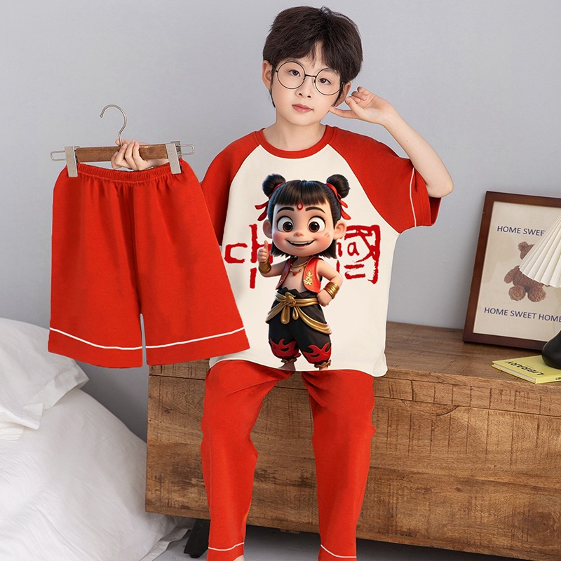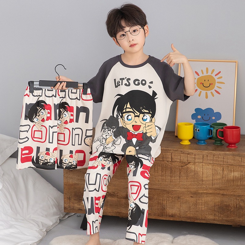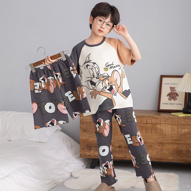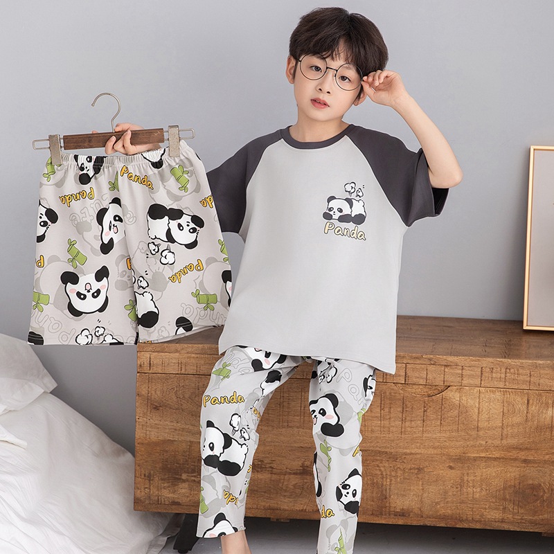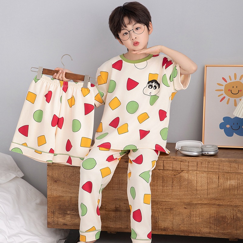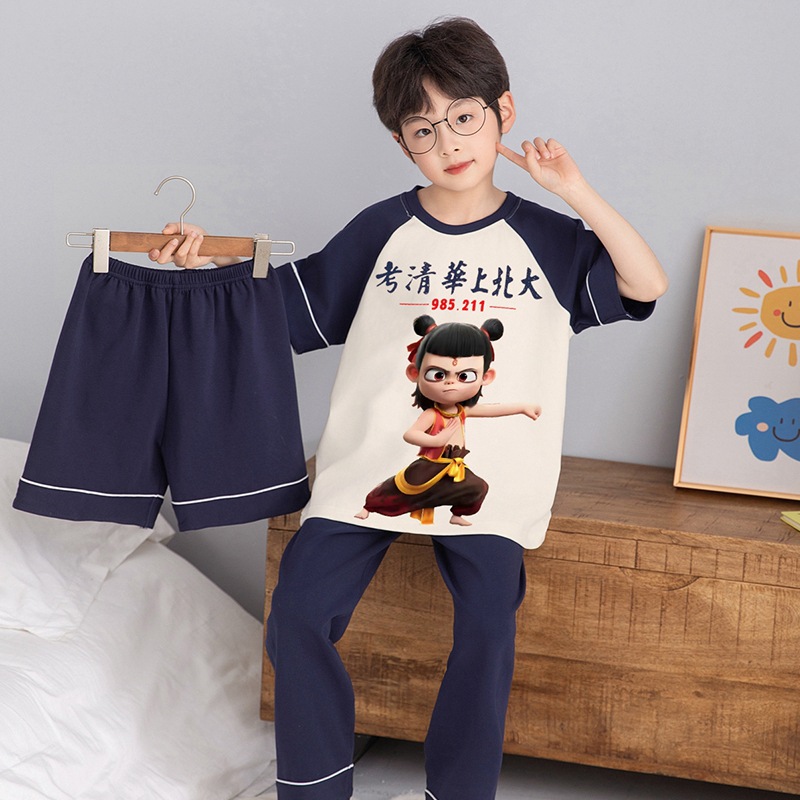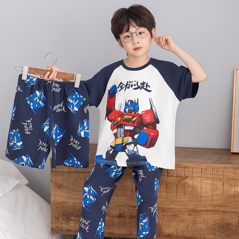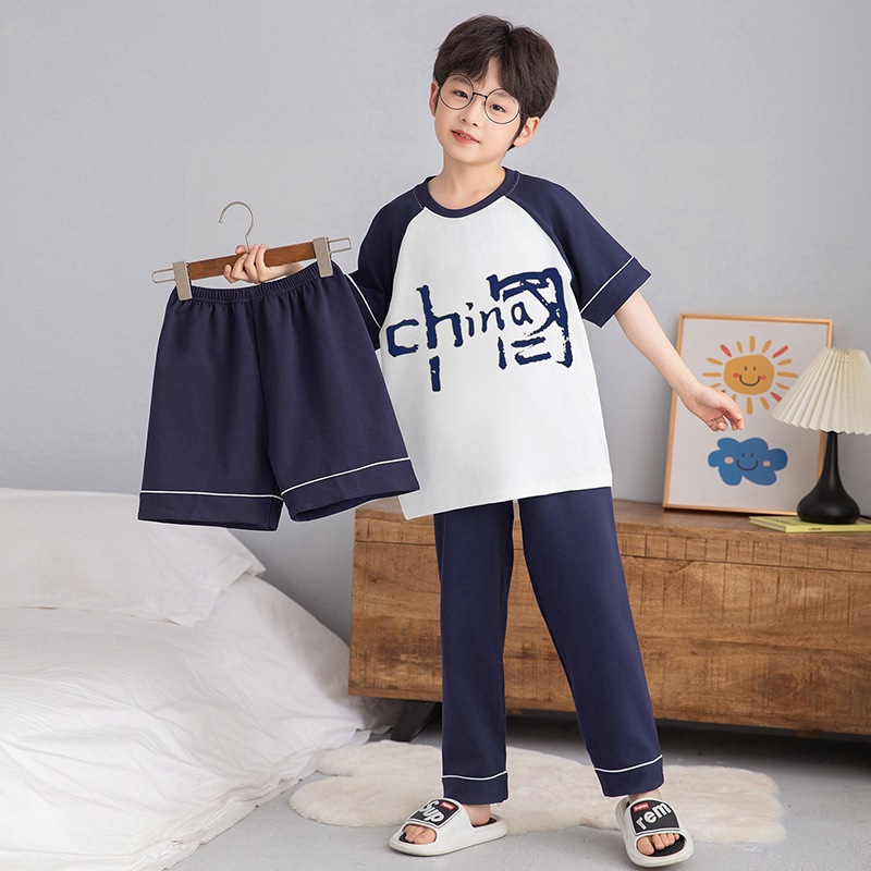 소년 잠옷 2025 새로운 여름 순면 얇은 3 피스 세트 어린이 소년 만화 큰 소년의 봄과 가을 가정 옷스토어 가기