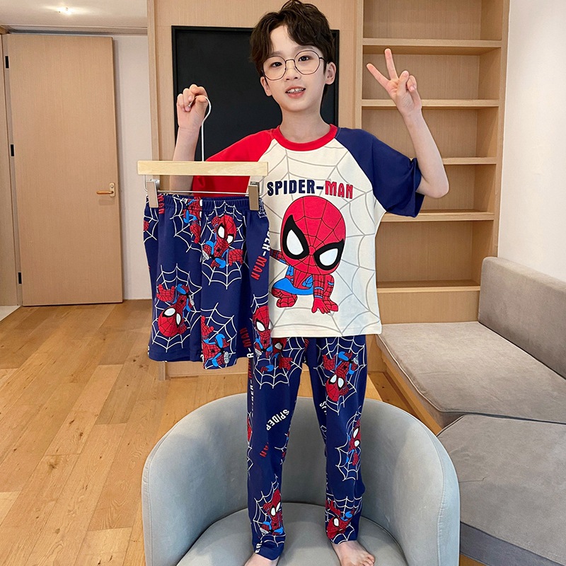 소년 잠옷 2025 새로운 여름 순면 얇은 3 피스 세트 어린이 소년 만화 큰 소년의 봄과 가을 가정 옷