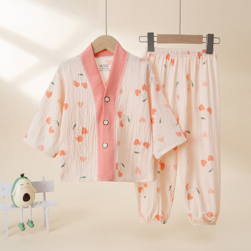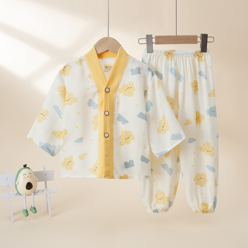 어린이 잠옷 여름 얇은 중소형 어린이 버튼 홈 옷 여자 아기 구름 면 7 점 세트 에어컨 옷스토어 가기