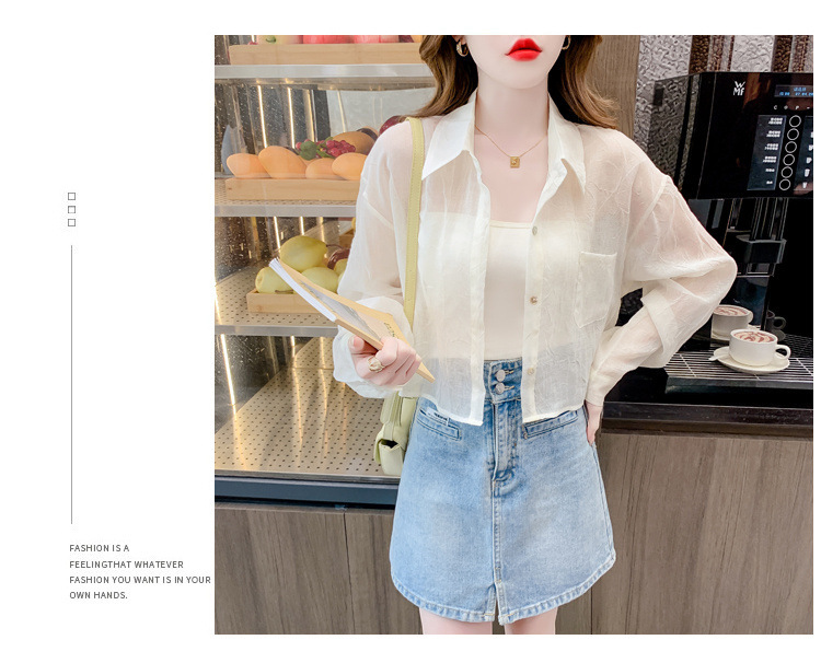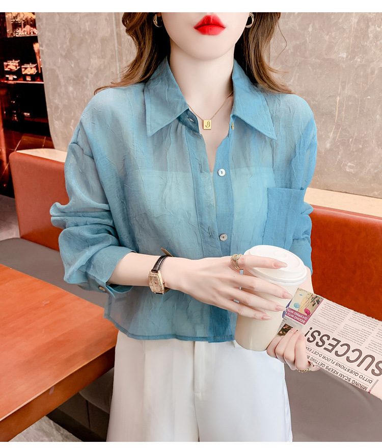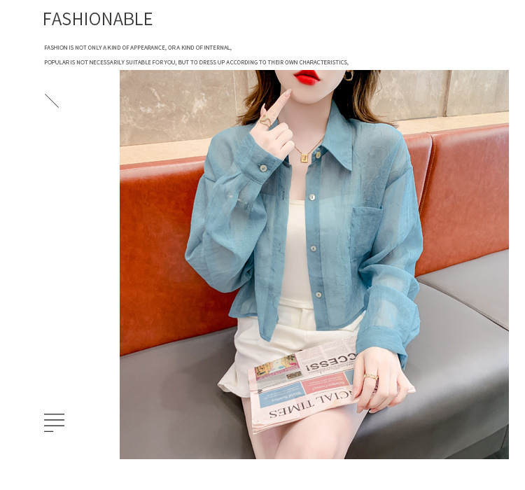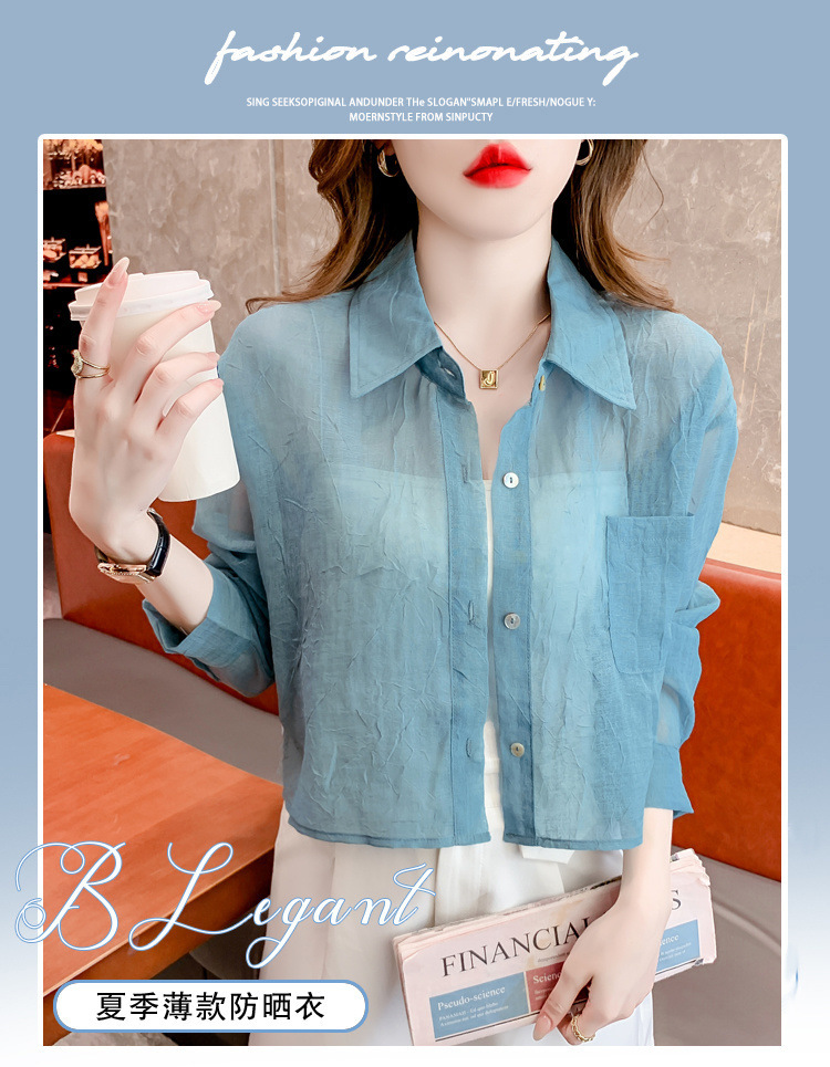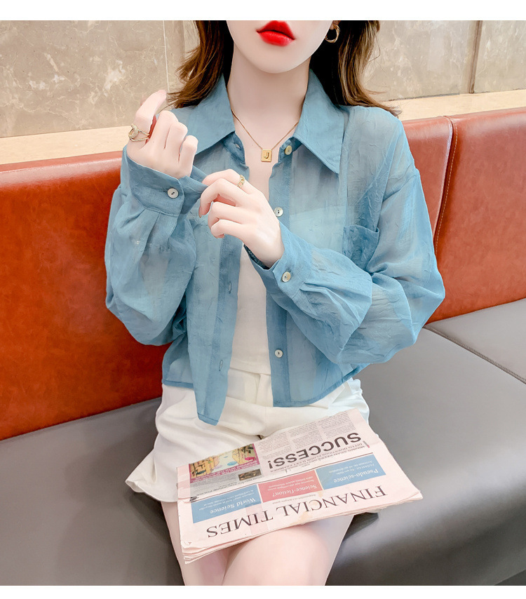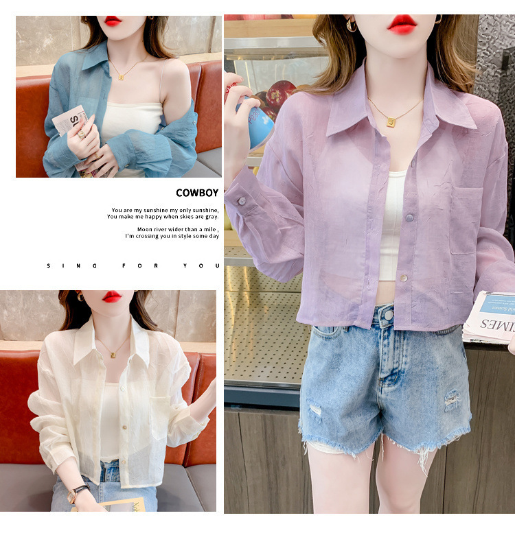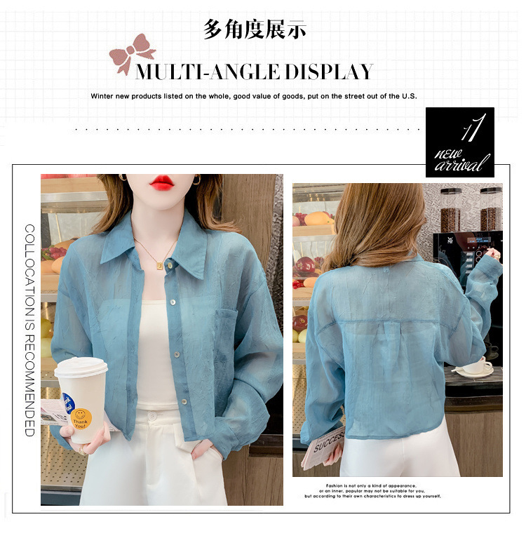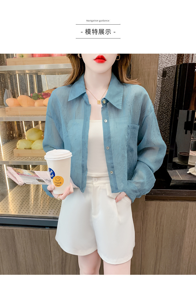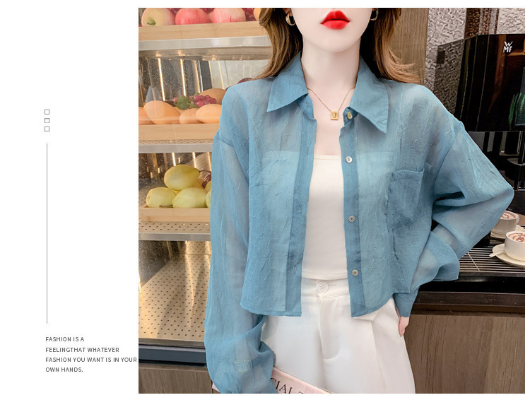 여성 선 스크린 의류 2024 새로운 여름 얇은 짧은 셔츠 재킷 패션 서양식 긴 소매 쉬폰 탑스토어 가기