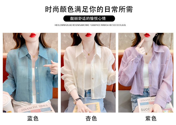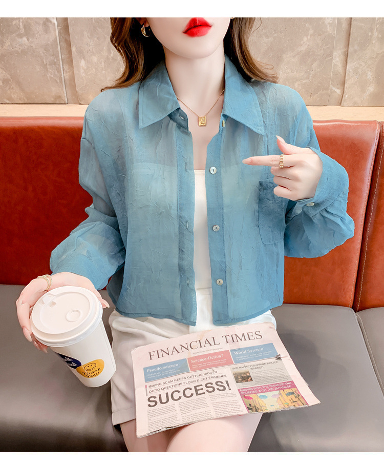 여성 선 스크린 의류 2024 새로운 여름 얇은 짧은 셔츠 재킷 패션 서양식 긴 소매 쉬폰 탑