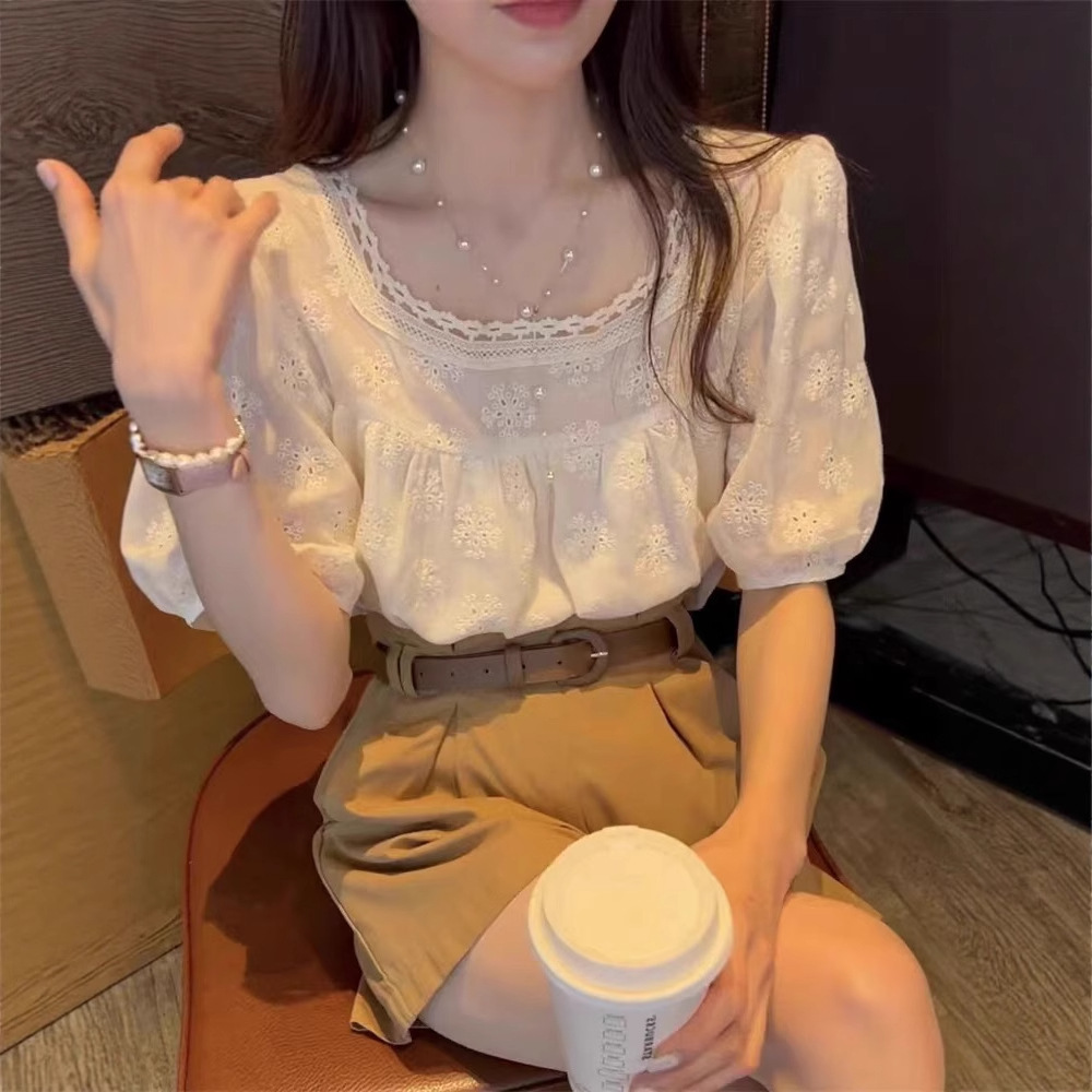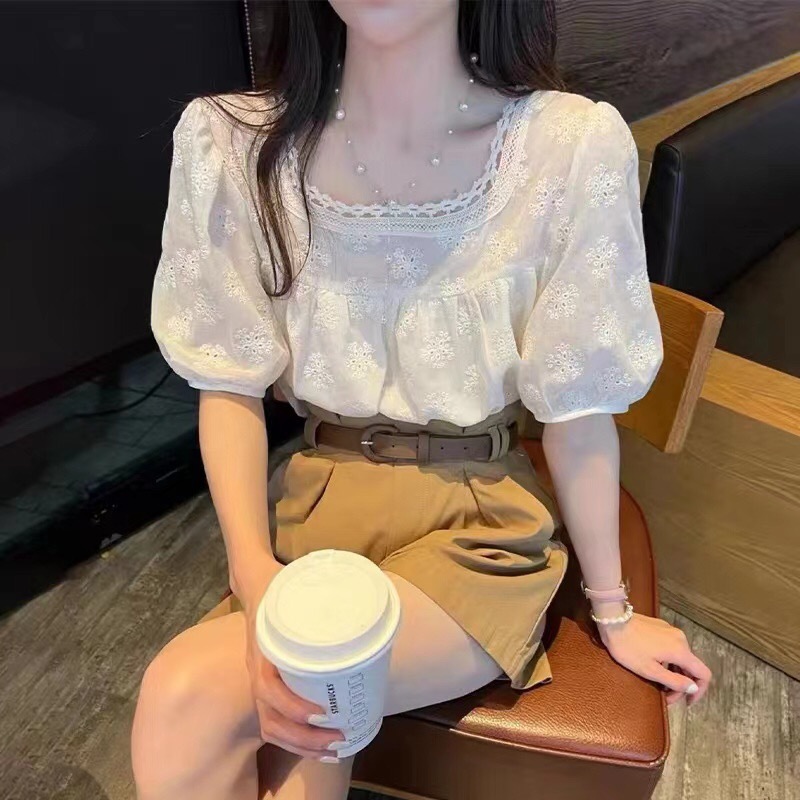 셔츠 인형 셔츠 여성 여름 쉬폰 셔츠 디자인 틈새 느슨한 배 커버 짧은 광장 칼라 퍼프 슬리브 탑스토어 가기