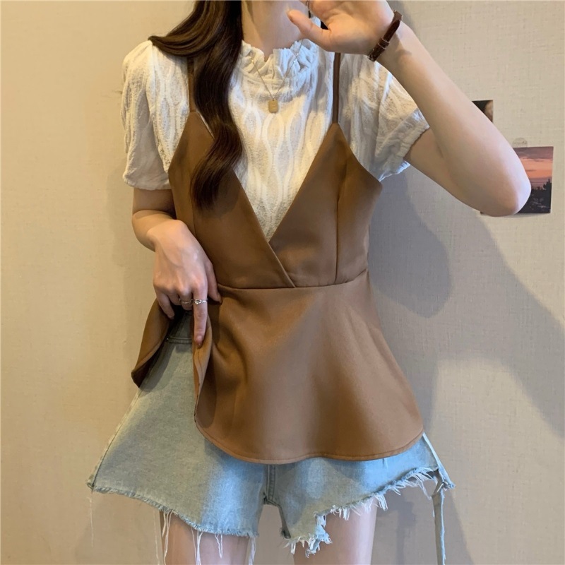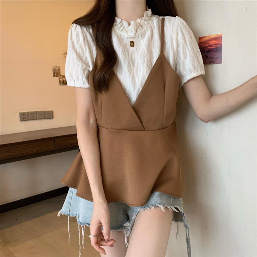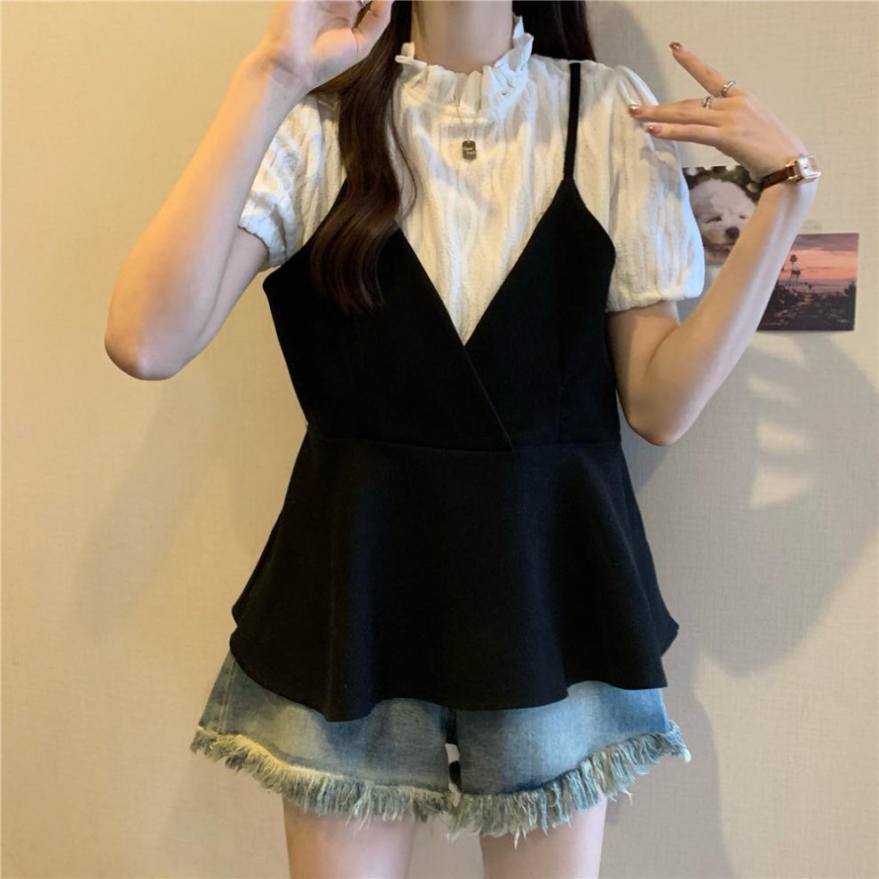 가짜 투피스 쉬폰 셔츠 여성용 여름 플러스 사이즈 통통녀 슬리밍 디자인 센스 인형 셔츠 탑 허리 스커트 작은 셔츠스토어 가기