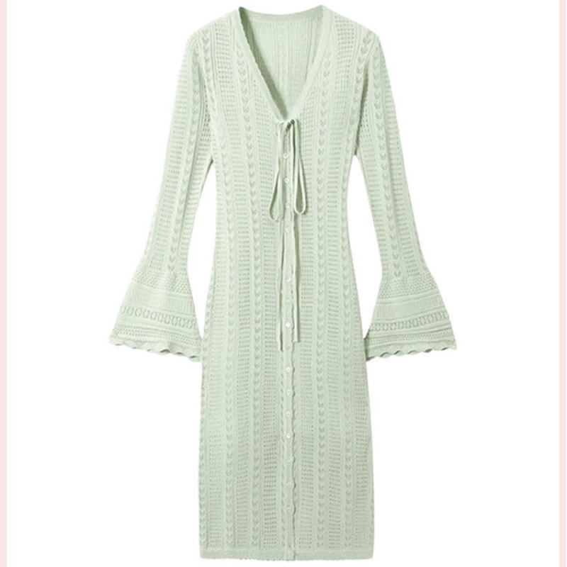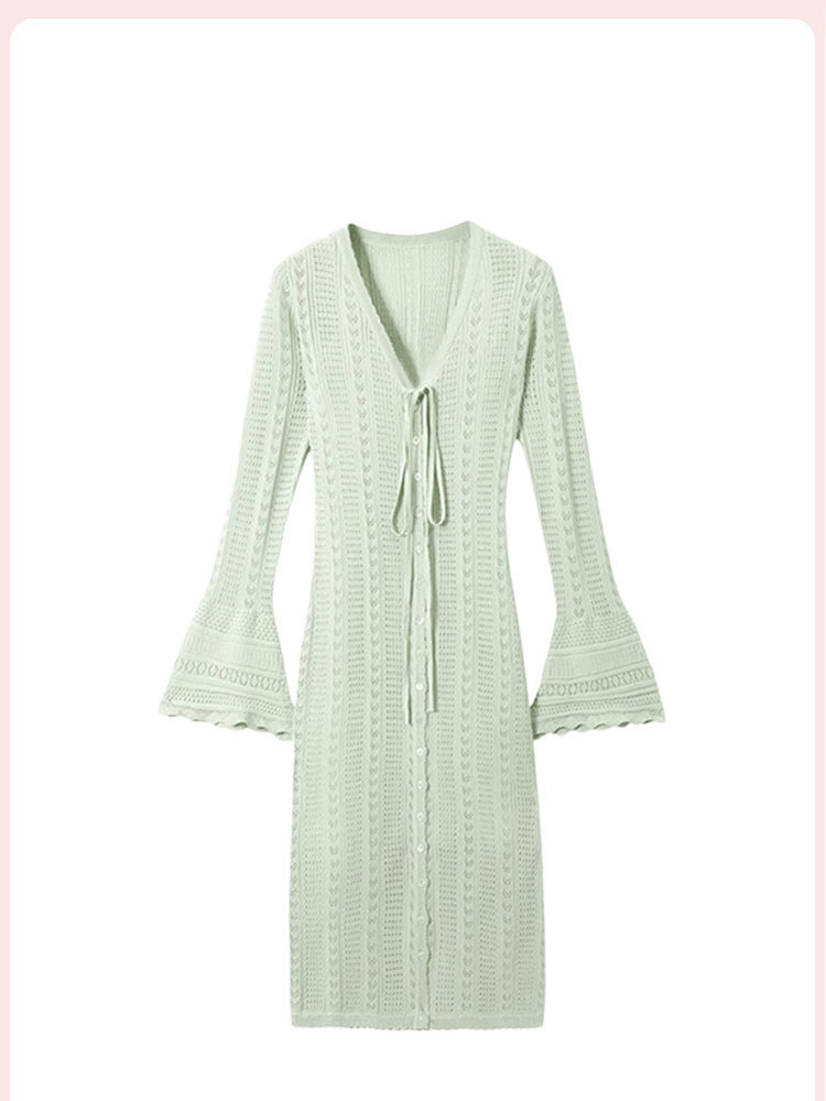 여름 새로운 분위기 V 넥 트럼펫 워터 슬리브 레이스 업 니트 카디건 아름다운 외부 여성