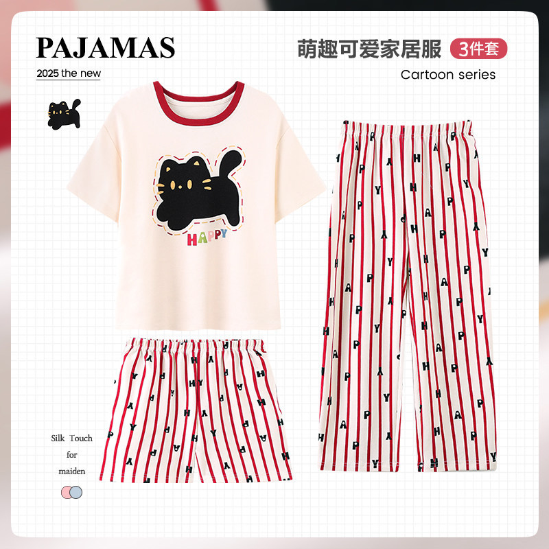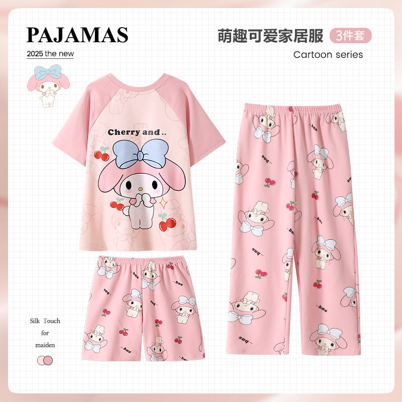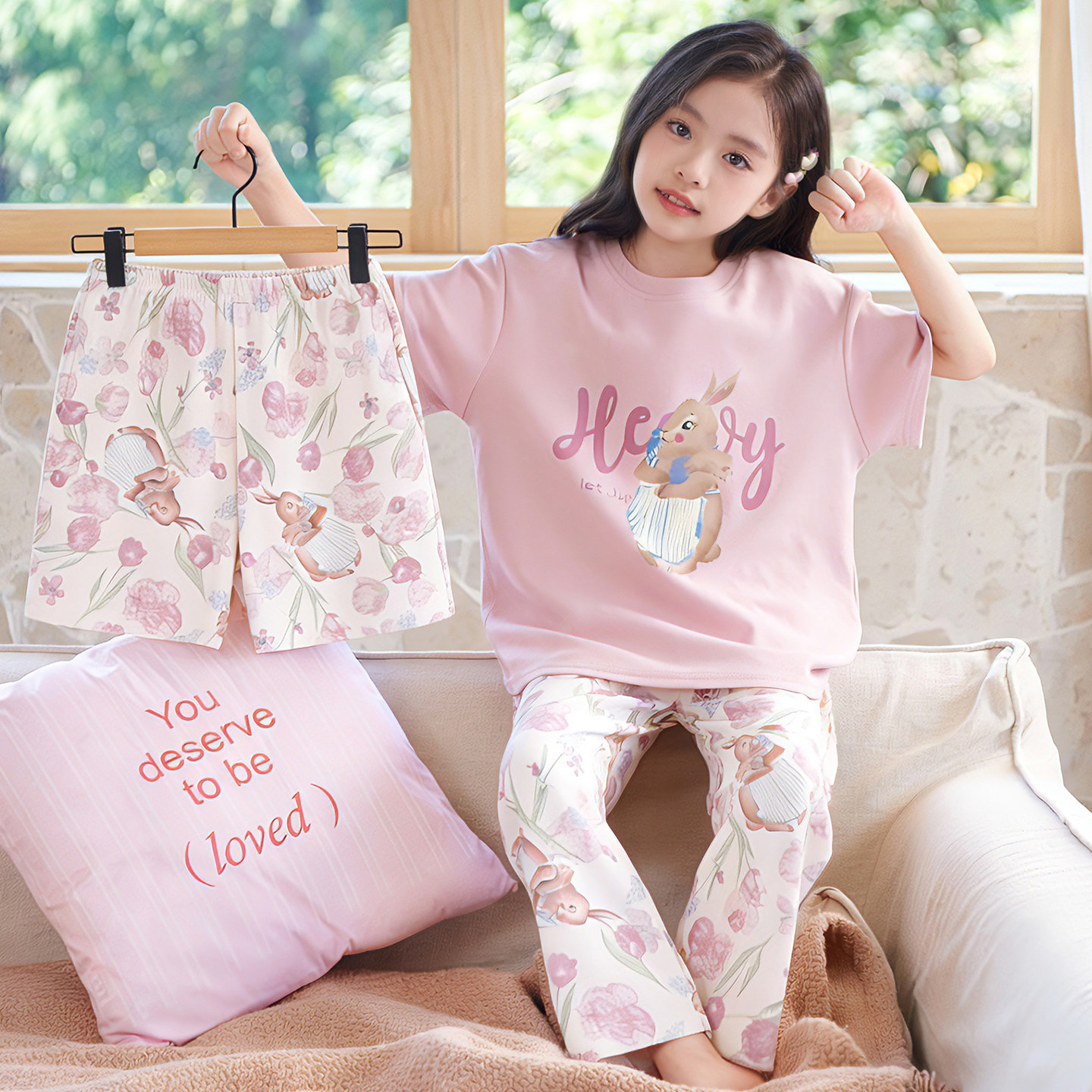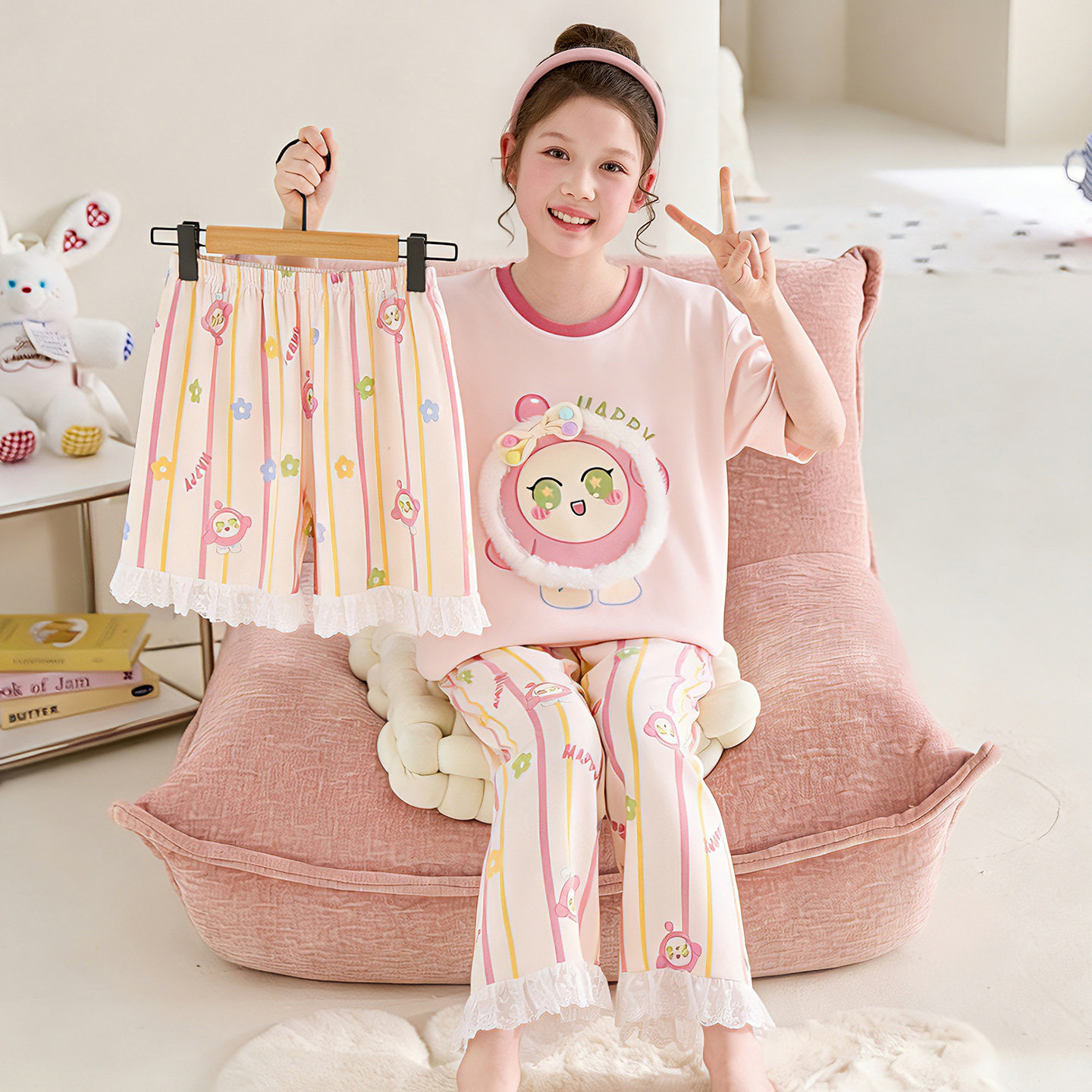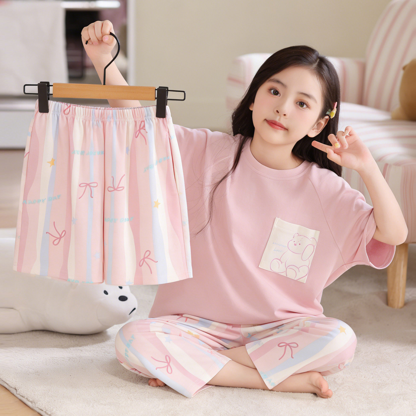 여아 잠옷 3종 세트 어린이 여름 순면 얇은 반팔 긴바지 여름 스타일 여아 홈웨어 2026 신상