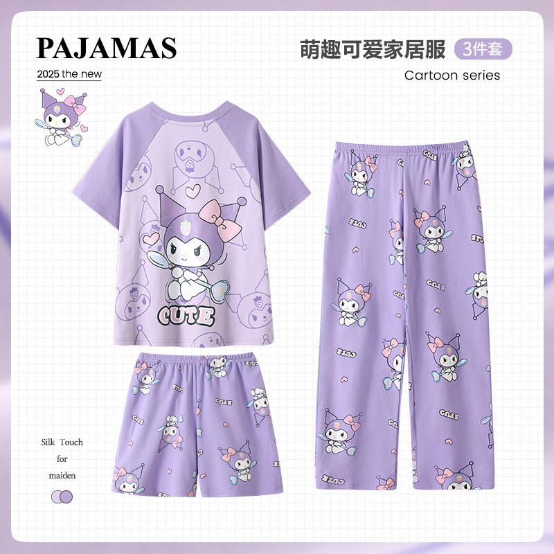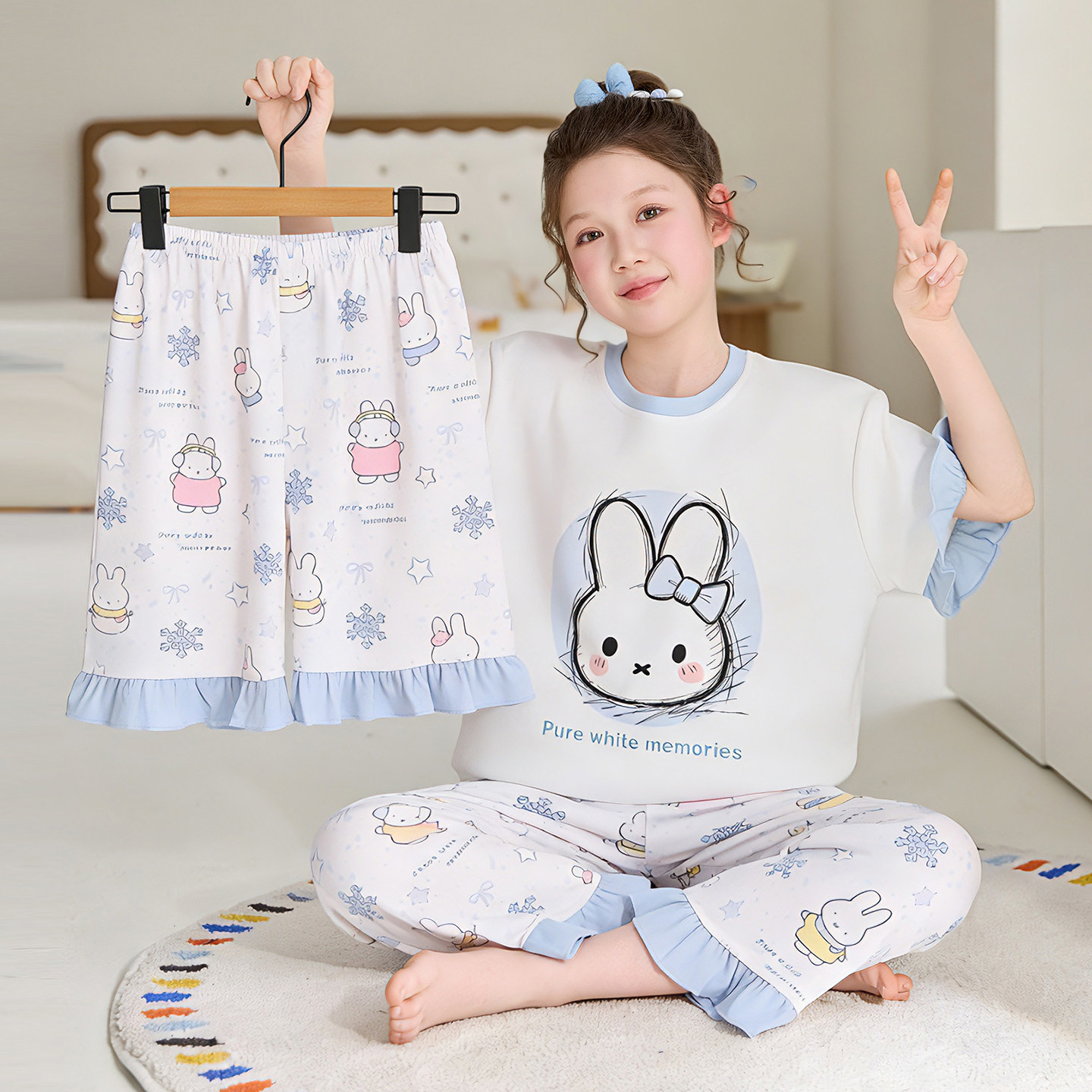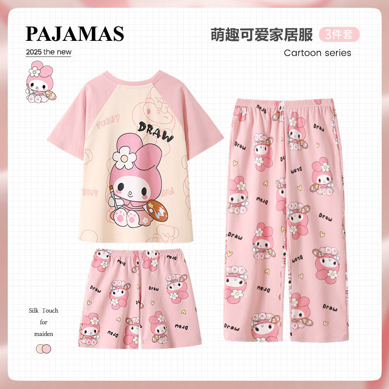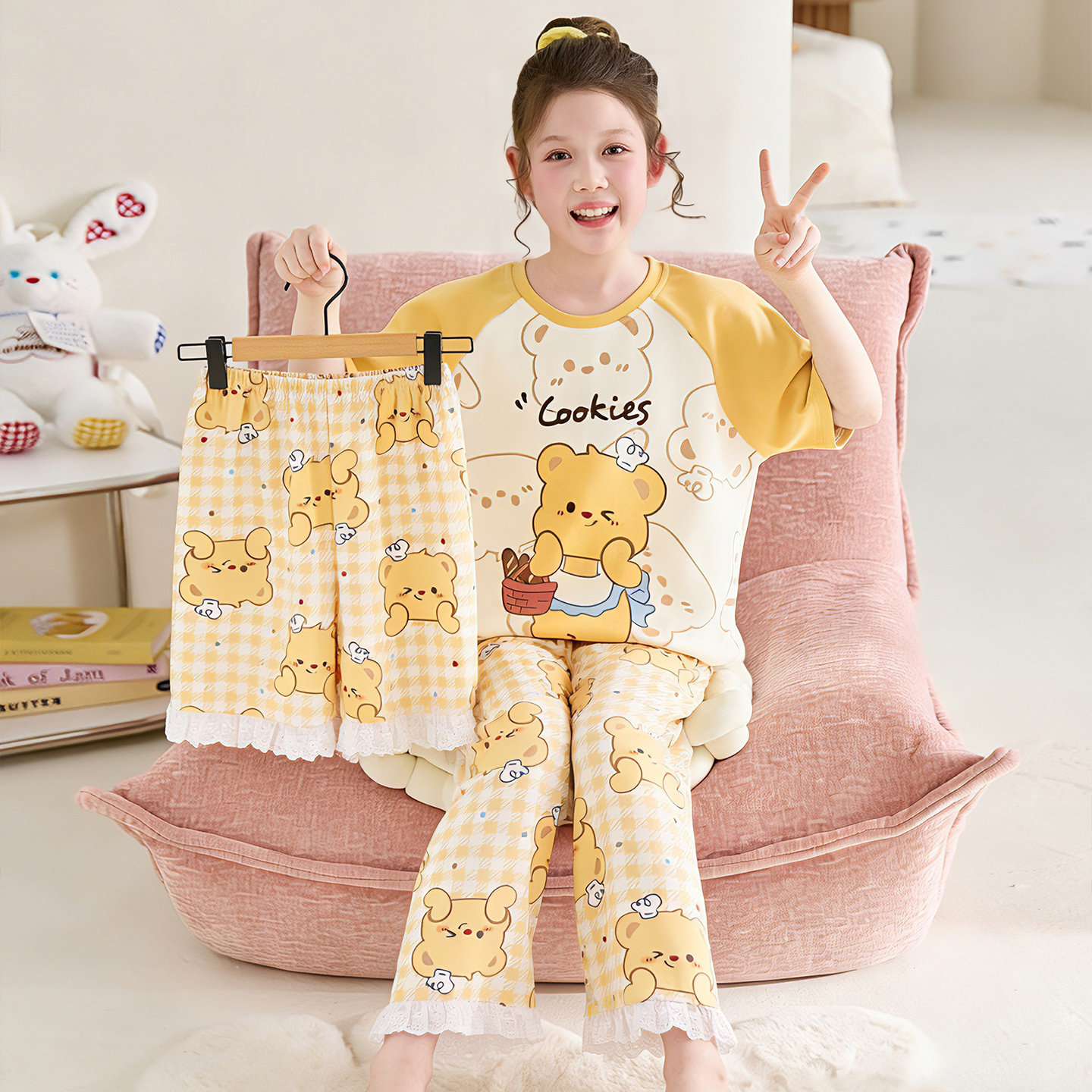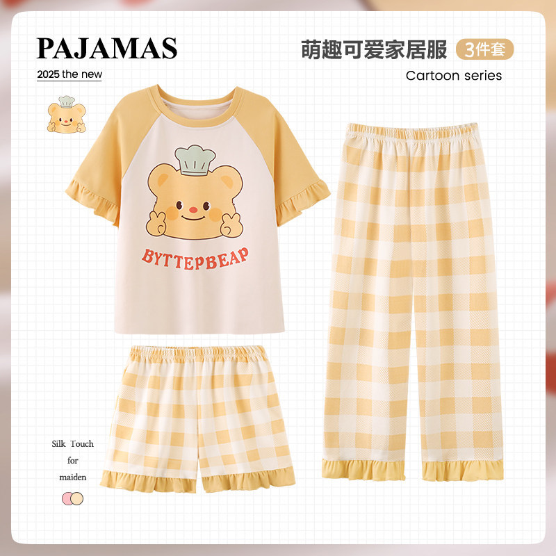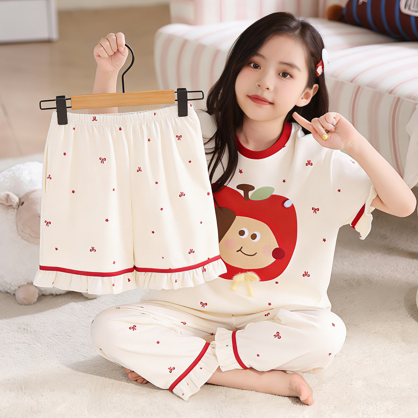 여아 잠옷 3종 세트 어린이 여름 순면 얇은 반팔 긴바지 여름 스타일 여아 홈웨어 2026 신상