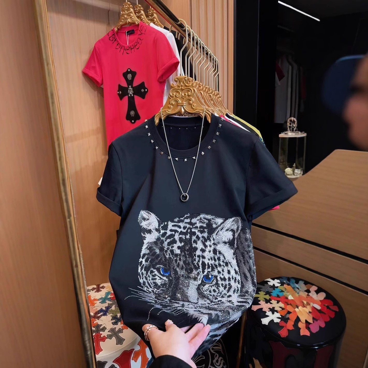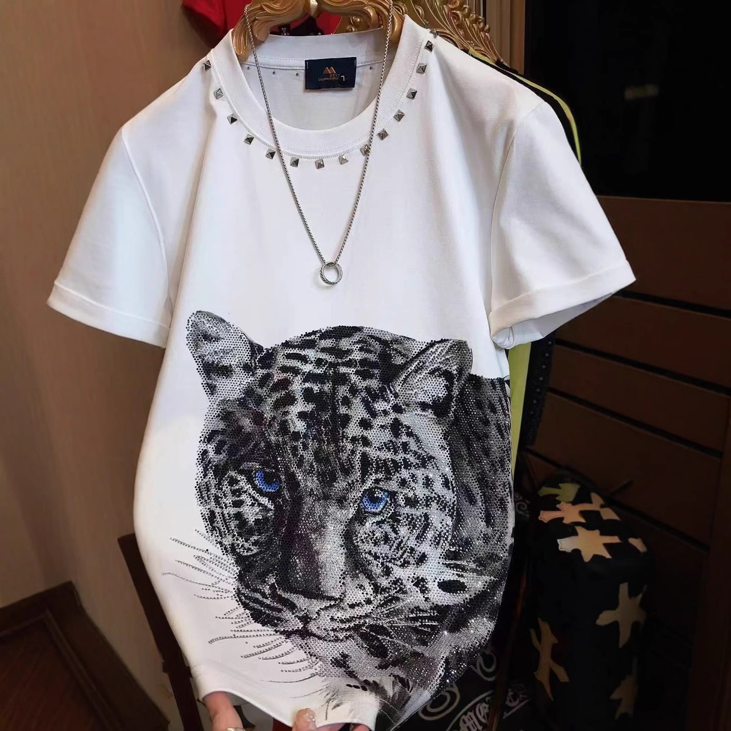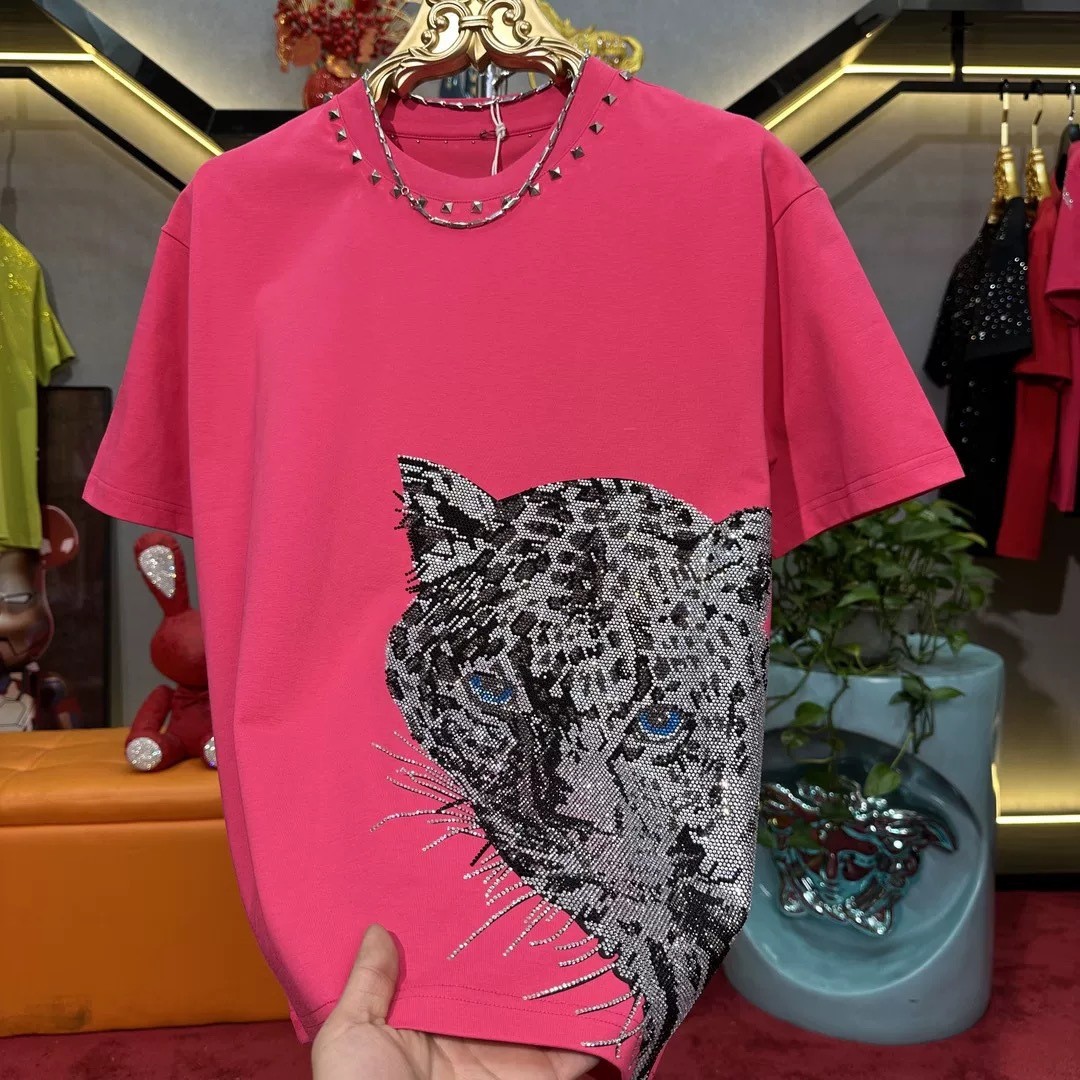 51065 새로운 패션 칼라 리벳 티셔츠 남성용 패션 간단한 핫 드릴링 하프 슬리브 핸섬 올 매치 쇼트 슬리브스토어 가기