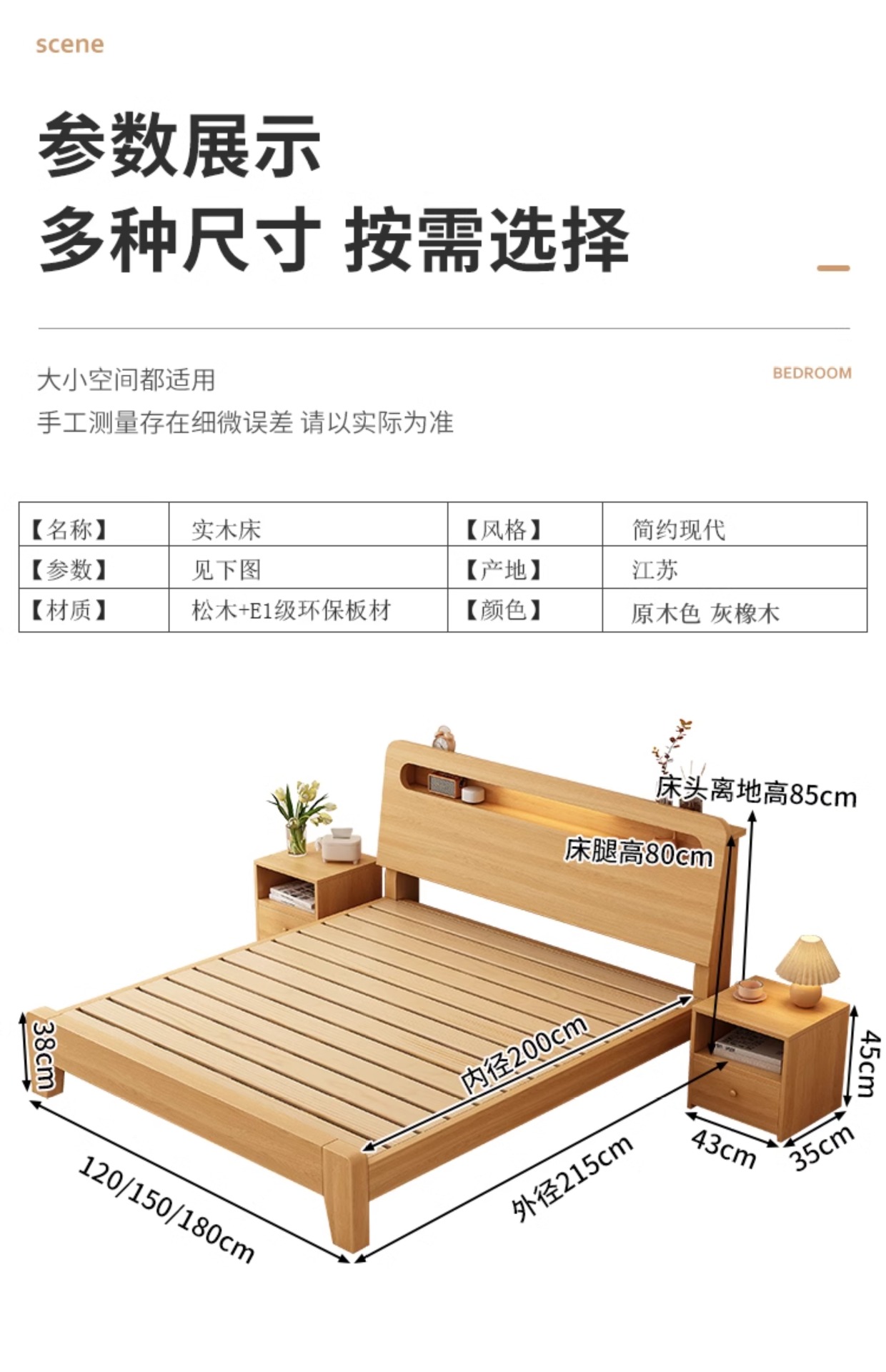 • 두꺼운 그레이 오크 침대 + 20cm 매트리스 + 침대 옆 테이블 * 1 [위층 포함]