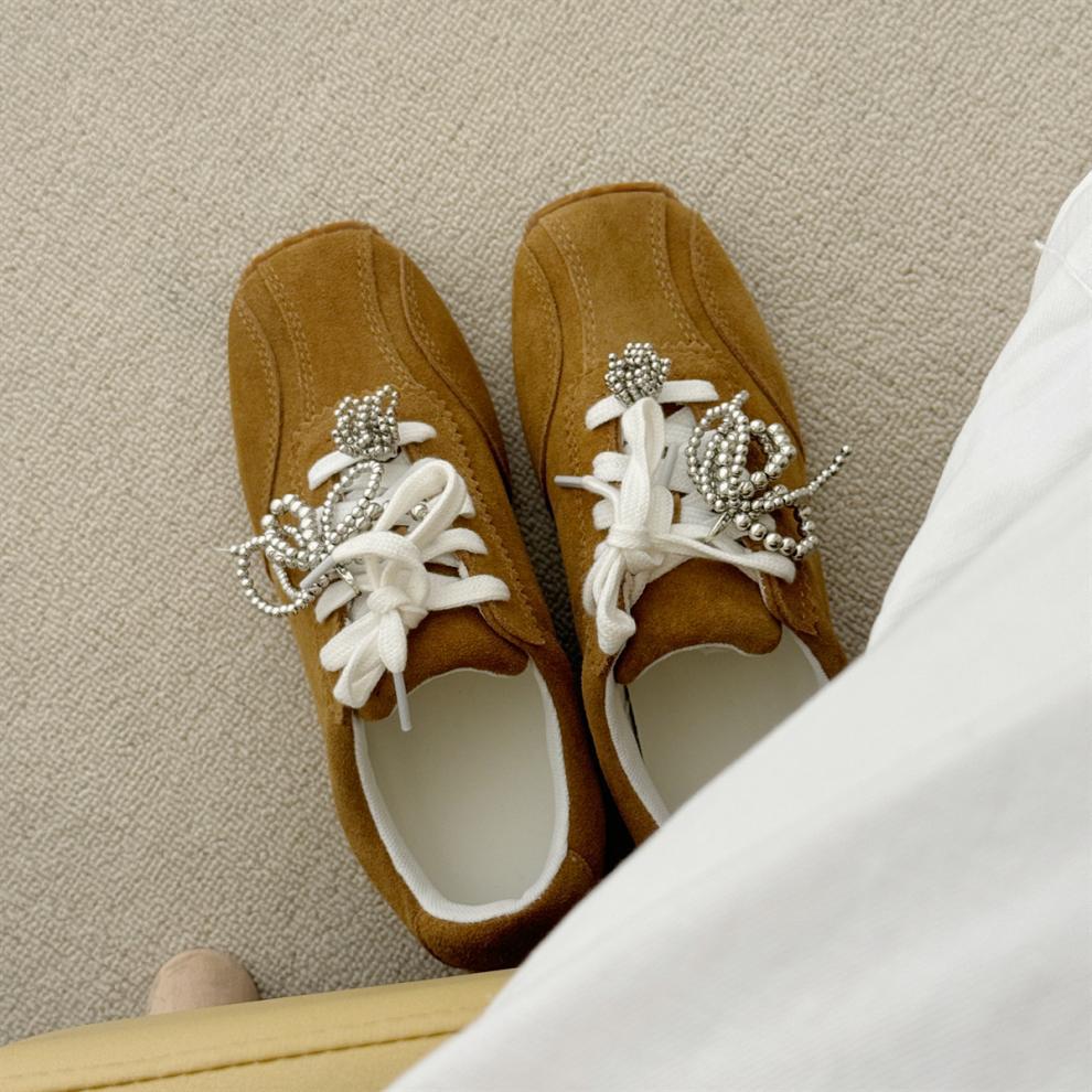 Cowhide 에디션 ~ 진주 활 액세서리 캐주얼 독일 훈련 신발 여성의 2025 새로운 내부 높이 가죽 스포츠 신발