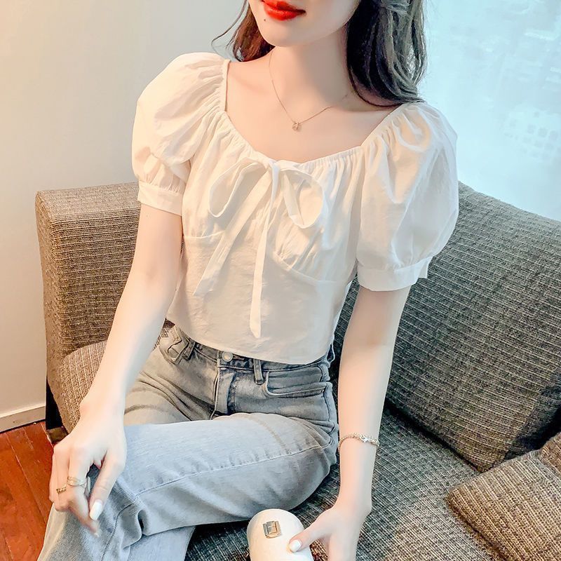 여름 작은 셔츠 우아한 스키니 웨스턴 스타일 쉬폰 셔츠 활 2025 어깨 새로운 스타일 우아한 스타일 짧은 소매 탑