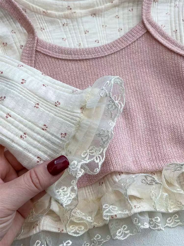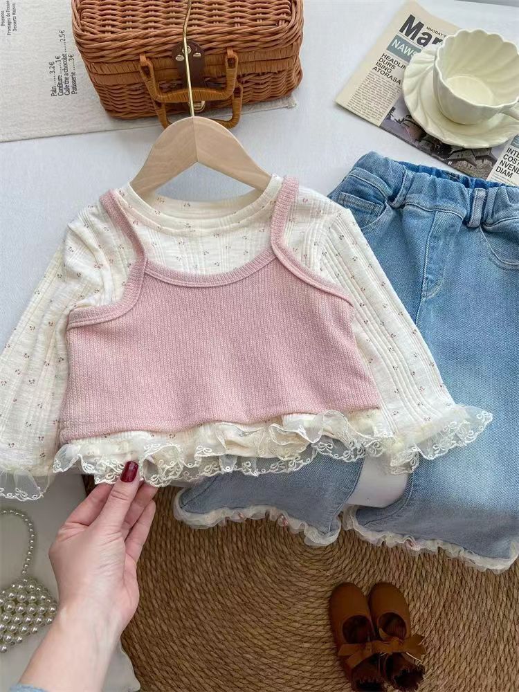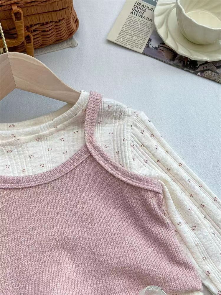 소녀의 봄 2025 새로운 세련된 꽃 셔츠 봄과 가을 패션 긴 소매 티셔츠 슬링 투피스 탑