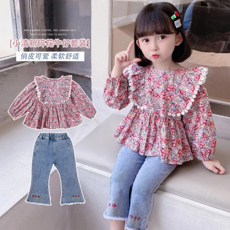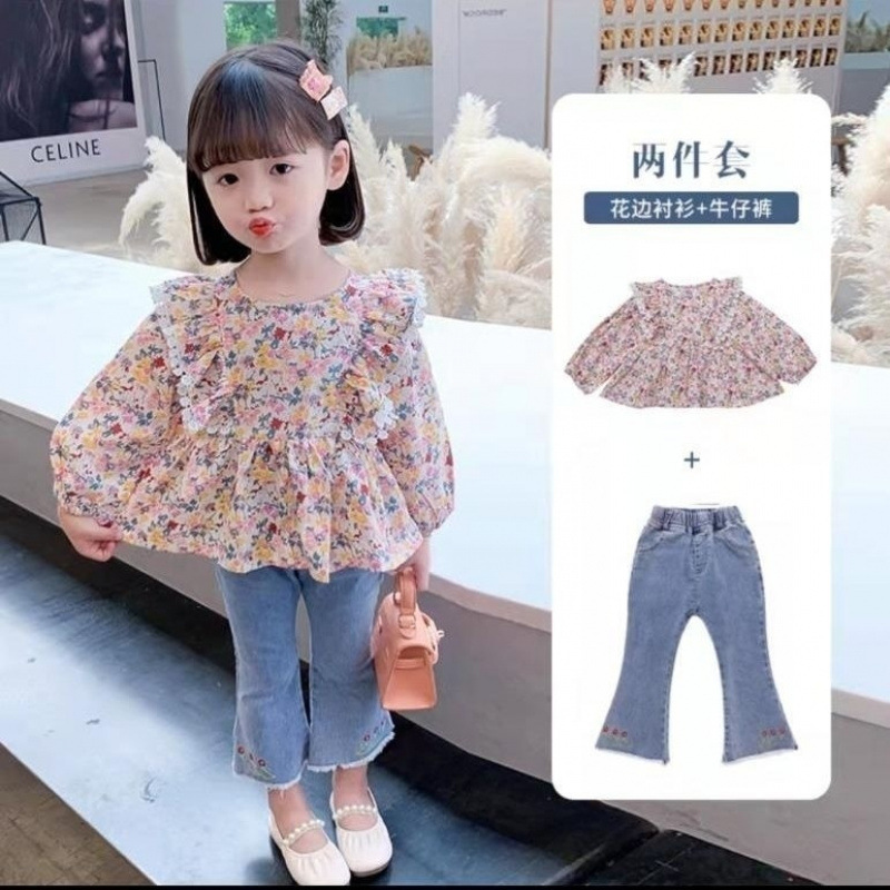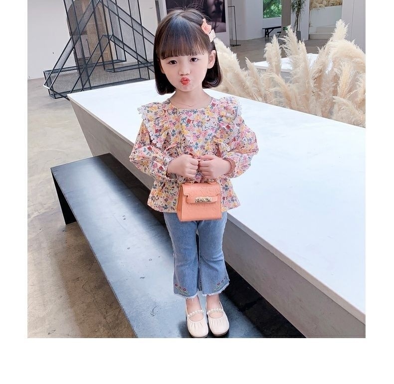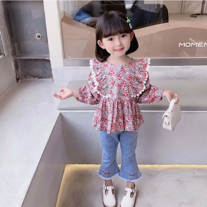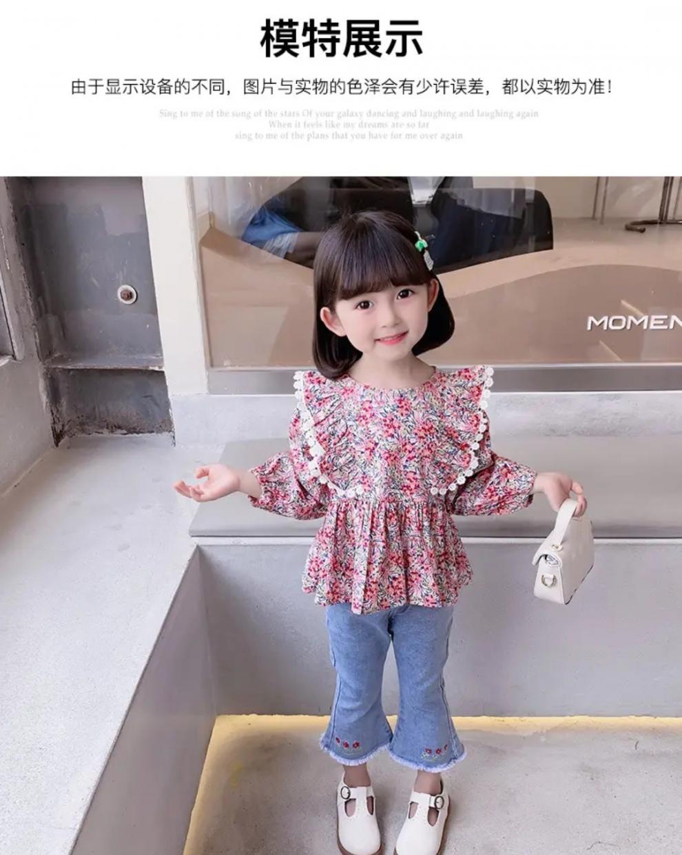[2025 새] 여자 봄 셔츠 2025 새 소녀 그물 붉은 꽃 탑 어린이 유행 암소