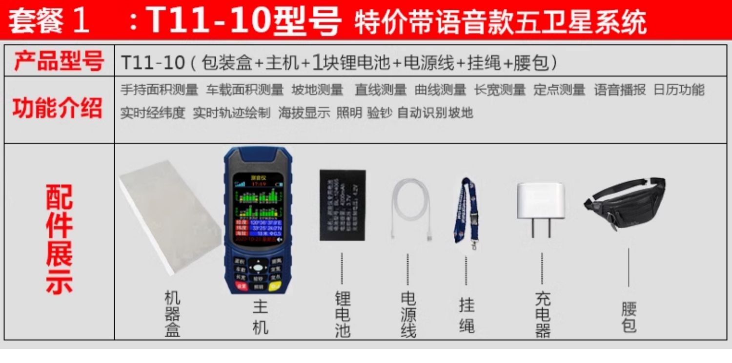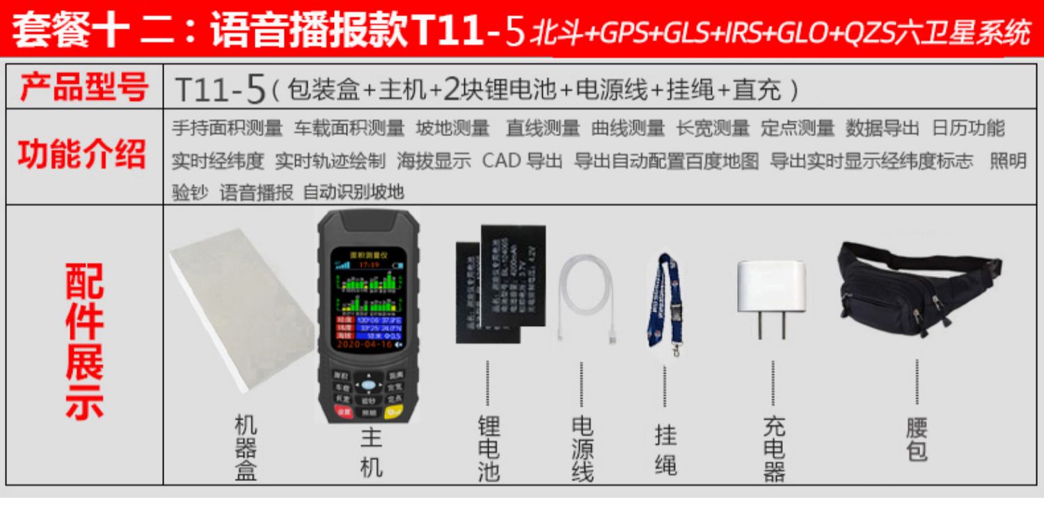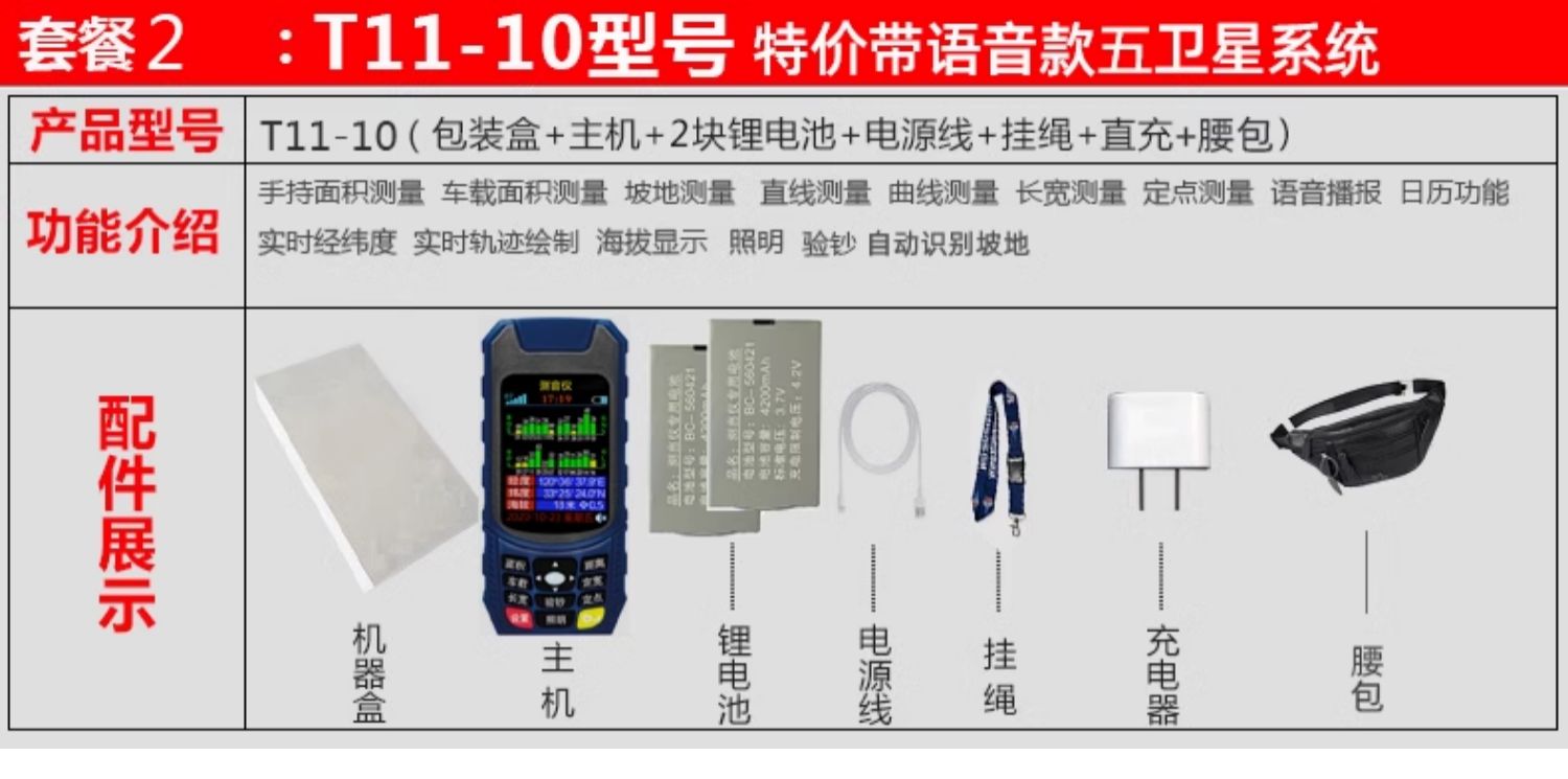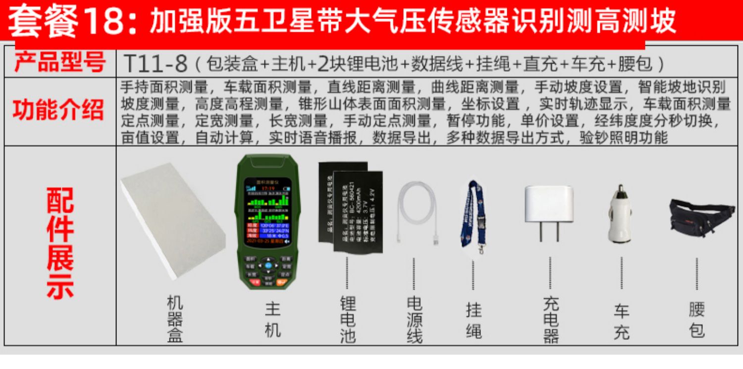 • 18: T11-8 5개 위성 시스템, 배터리 2개 및 충전기 1개 + 자동 경사 + 기압 높이 측정 및 경사 측정