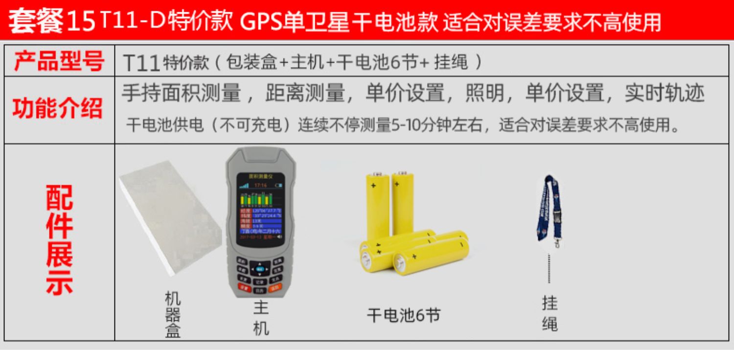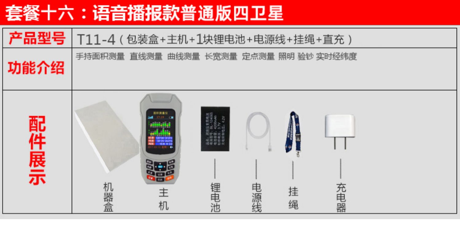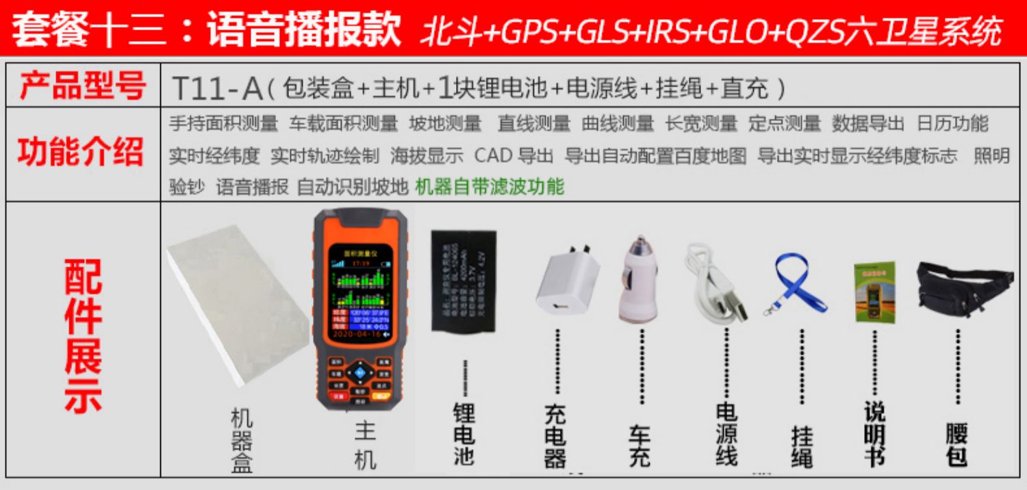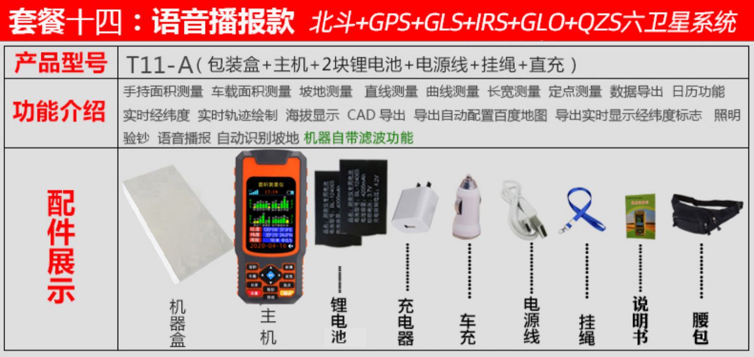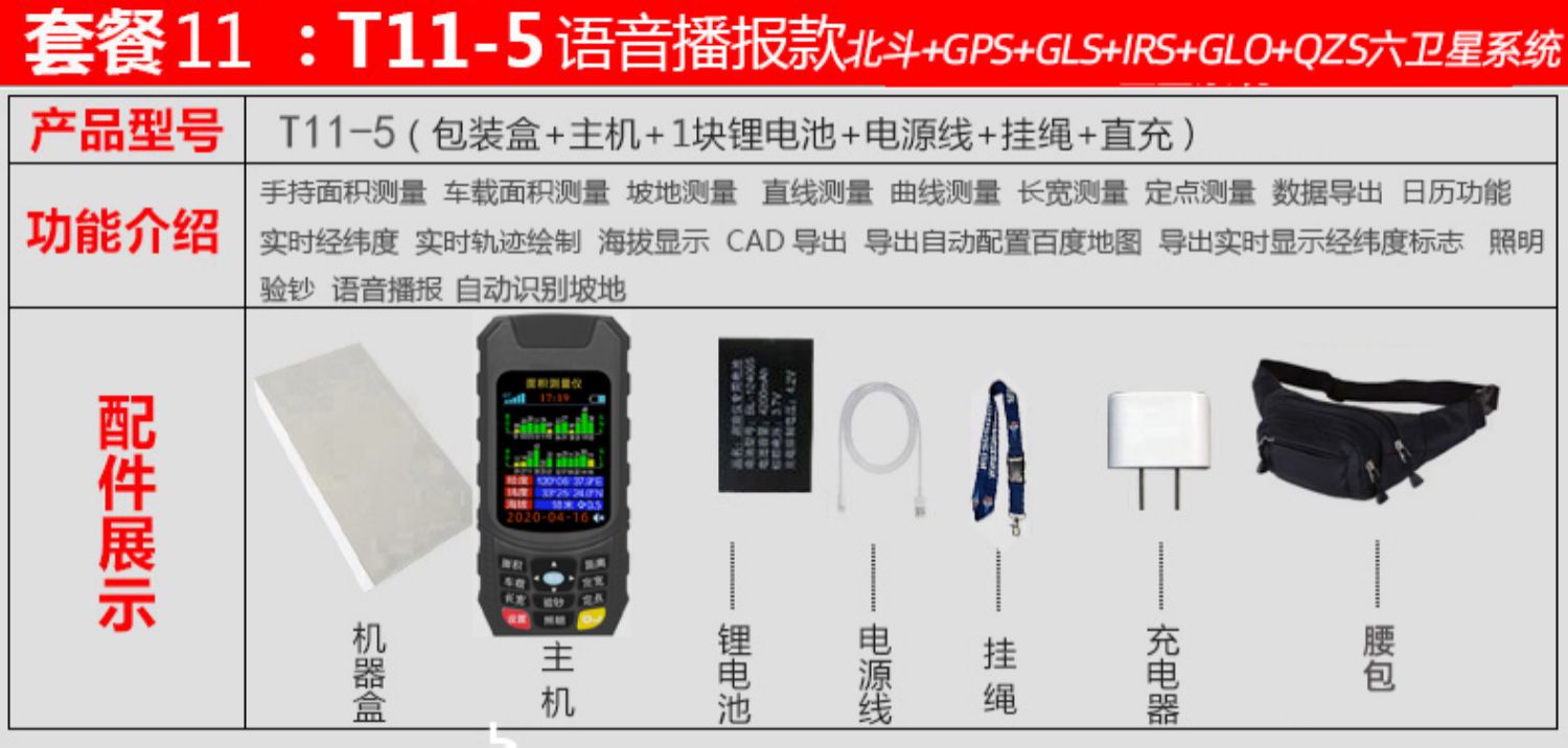 • 18: T11-8 5개 위성 시스템, 배터리 2개 및 충전기 1개 + 자동 경사 + 기압 높이 측정 및 경사 측정