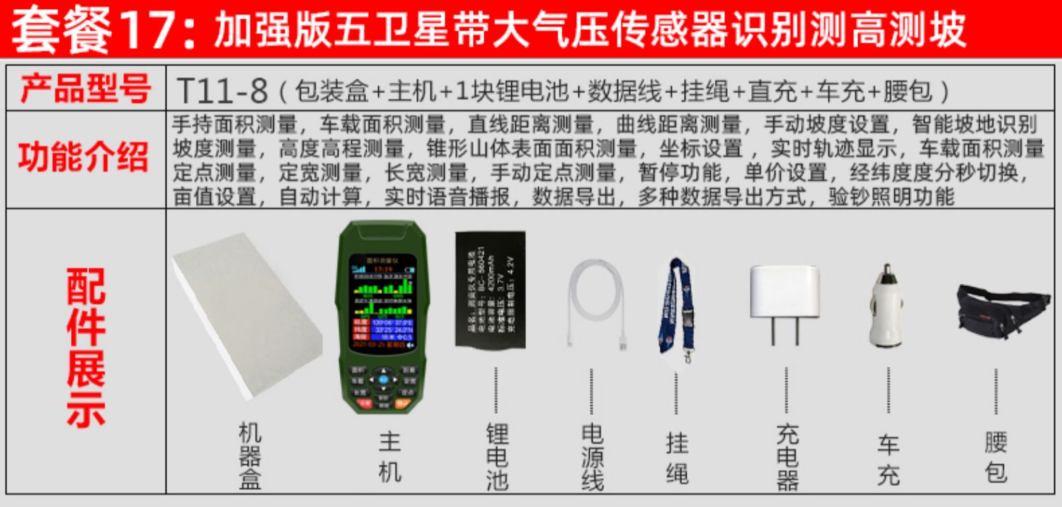 • 17: T11-8 5개 위성 시스템, 1회 충전 및 1회 충전 + 자동 경사 + 기압 높이 측정 및 경사 측정