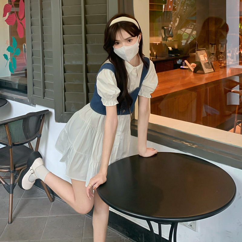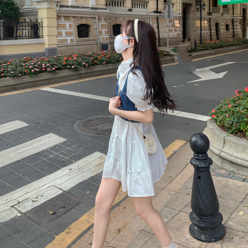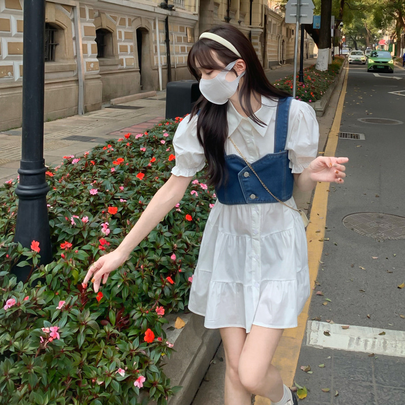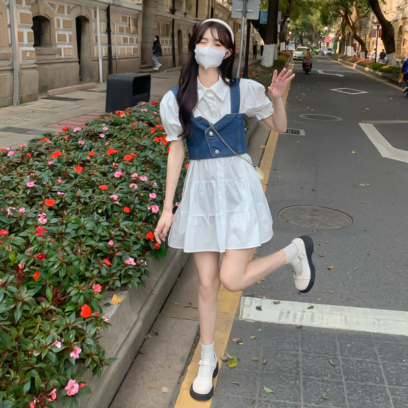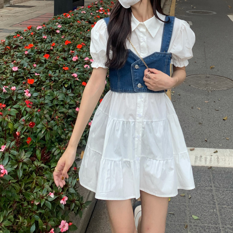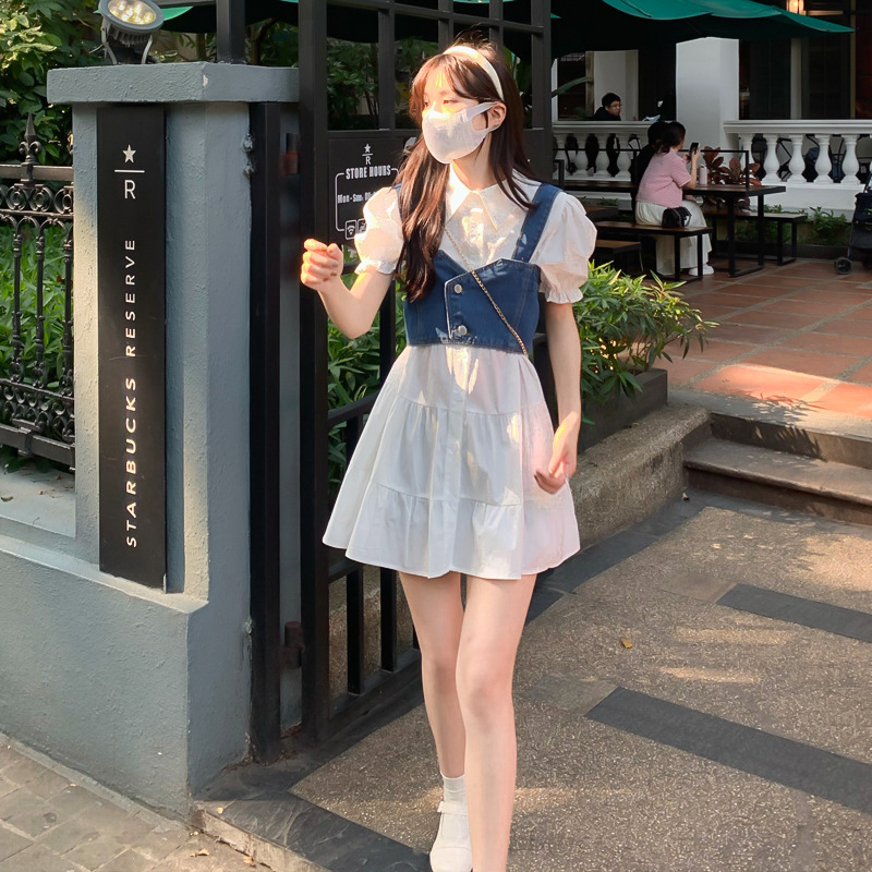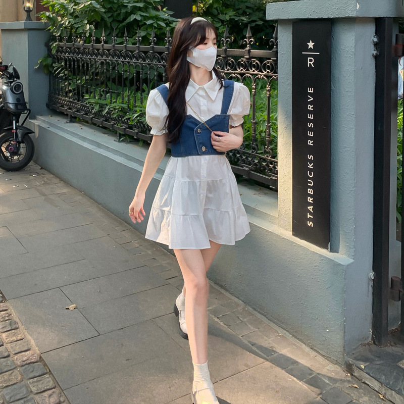 2025 년 여름 투피스 여성의 새로운 한국식 허리 데님 스트랩 여신 팬 버블 슬리브 원피스 세트 스커트스토어 가기