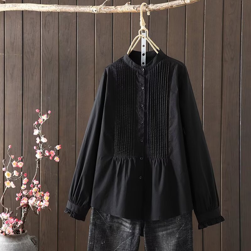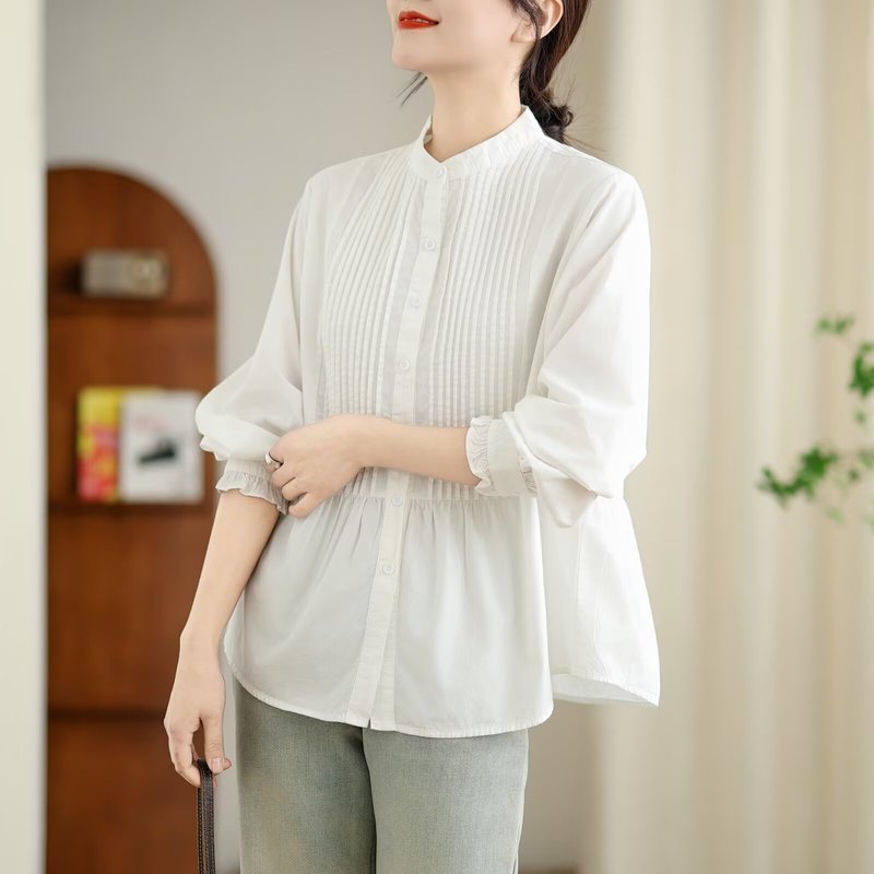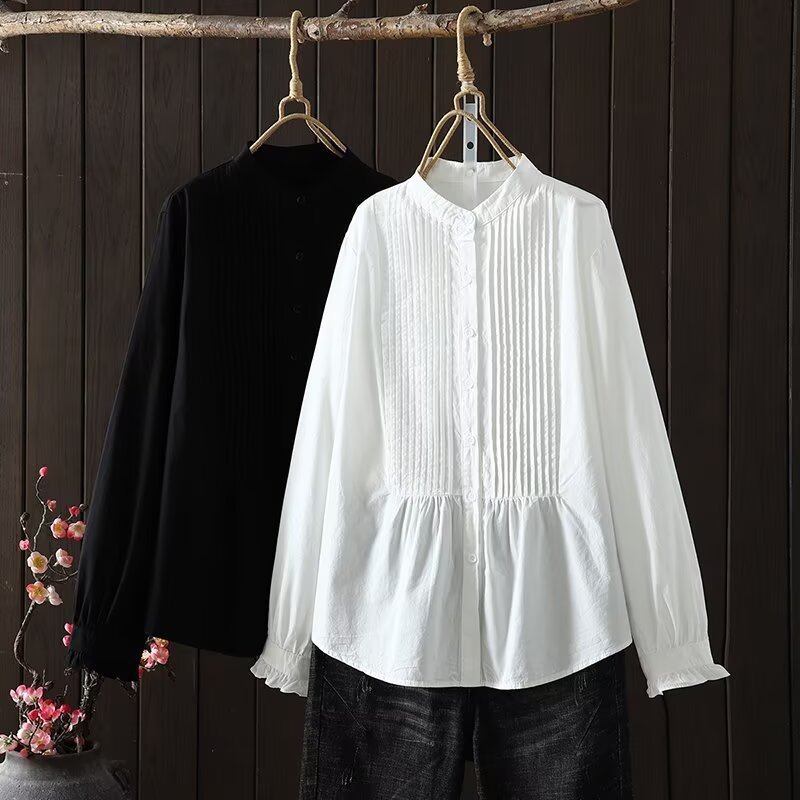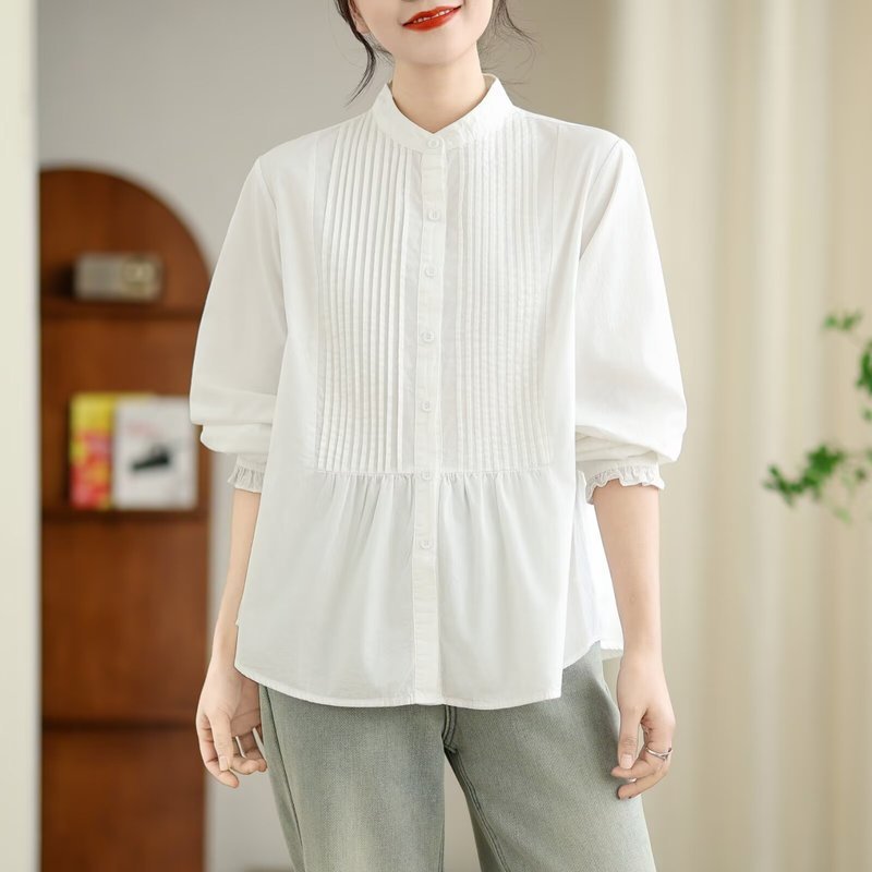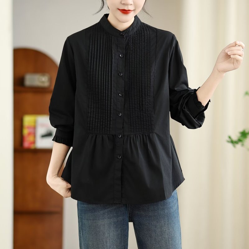 새로운 라운드 넥 주름 단색 여성 긴팔 카디건 셔츠 도매 조류의 한국어 버전