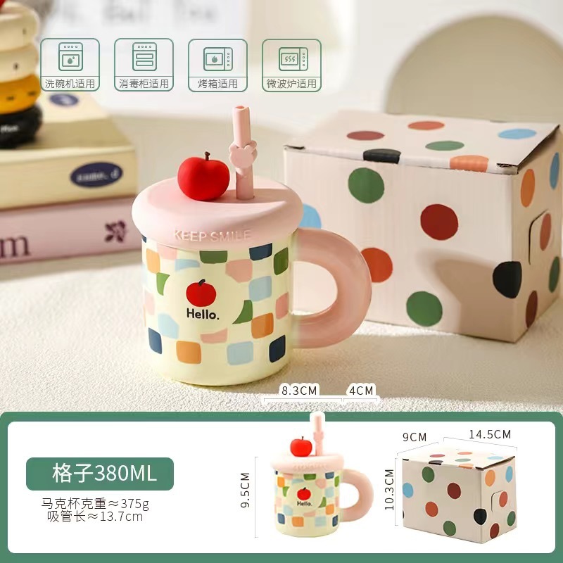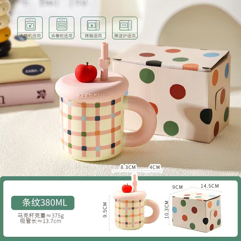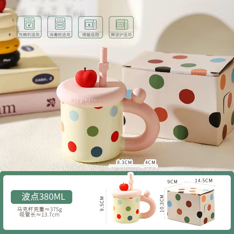 귀여운 세라믹 머그잔 가정용 폴카 도트 소녀 뚜껑 높은 색상 가치 창조적 인 컵 워터 컵 아침 식사 밀짚