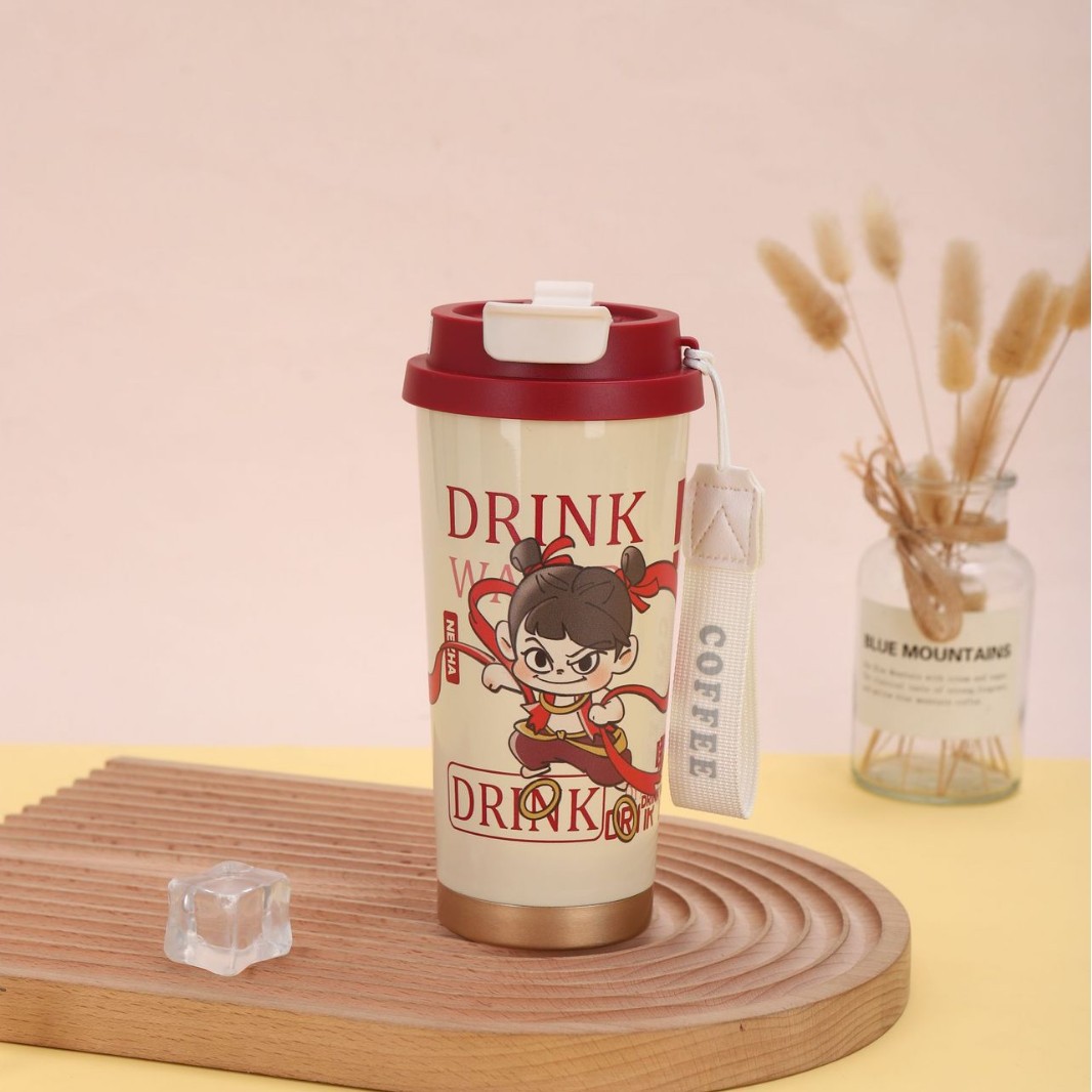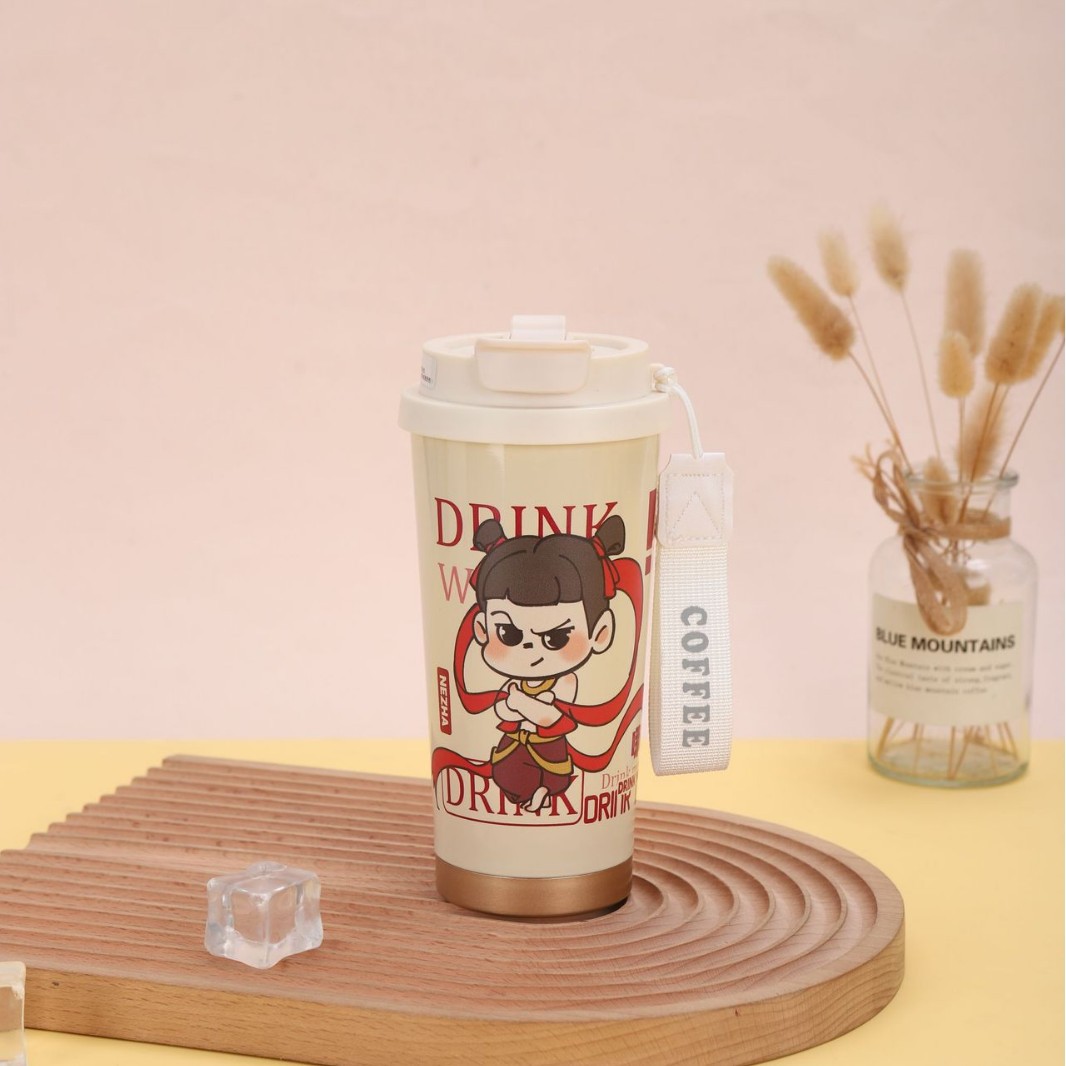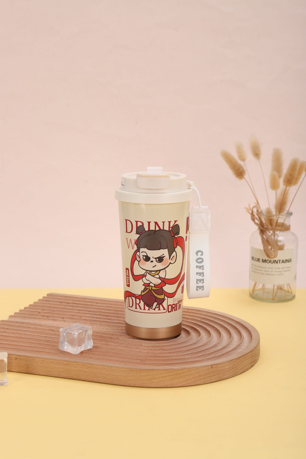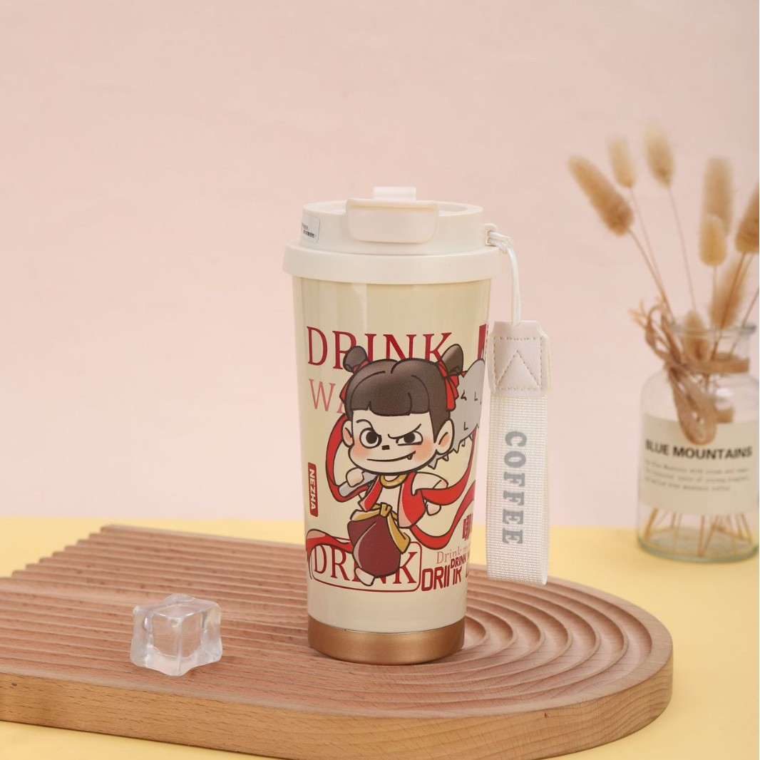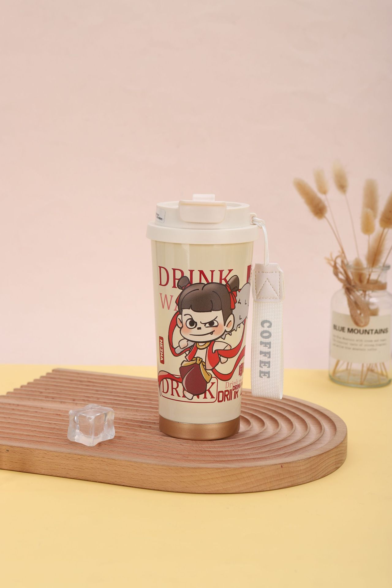 국경 간 Nezha 물 컵 316 스테인레스 스틸 보온병 컵 높은 색상 가치 만화 더블 마시는 밀짚 커피 컵