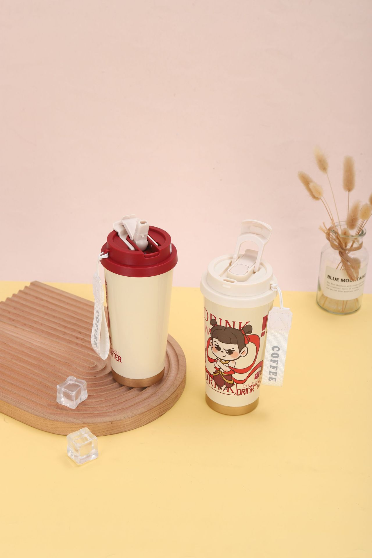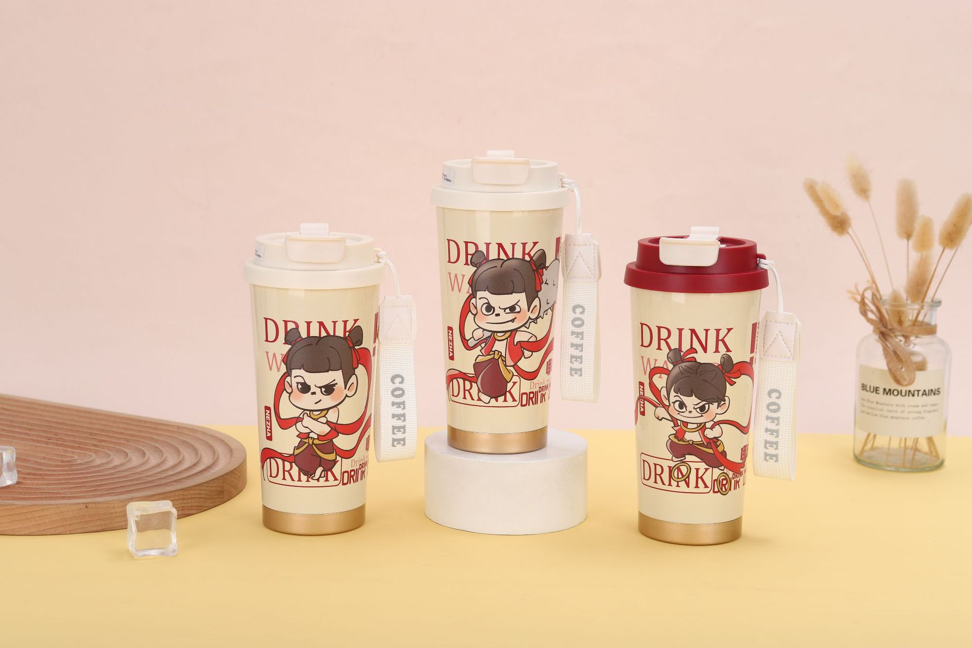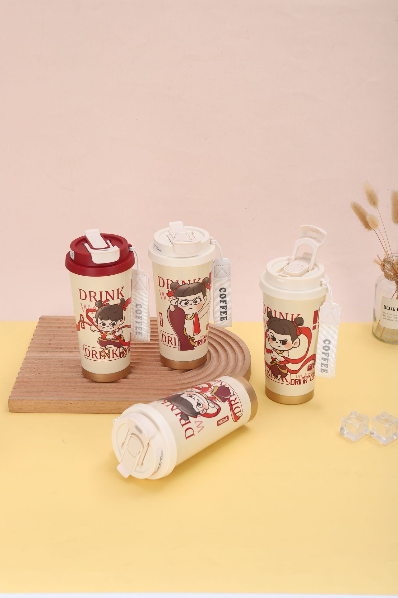국경 간 Nezha 물 컵 316 스테인레스 스틸 보온병 컵 높은 색상 가치 만화 더블 마시는 밀짚 커피 컵스토어 가기