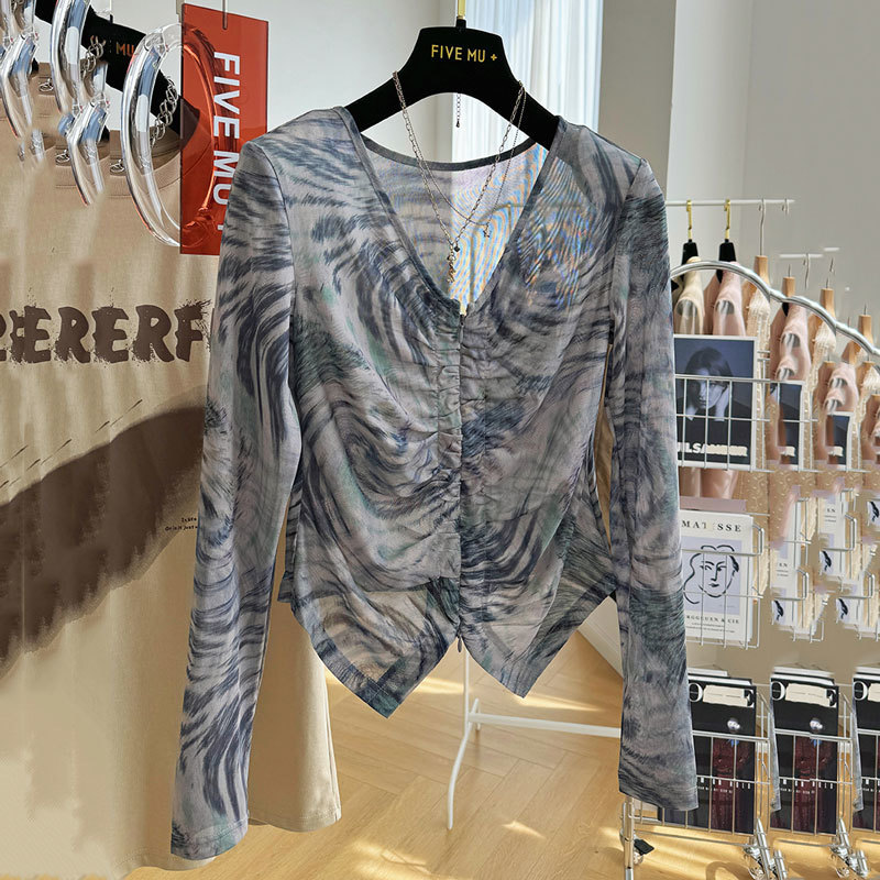 인쇄 된 메쉬 슬림 핏 칼라 베이스 셔츠 여성의 2025 년 여름 새로운 한국 스타일 아이스 실크 건조 의류스토어 가기