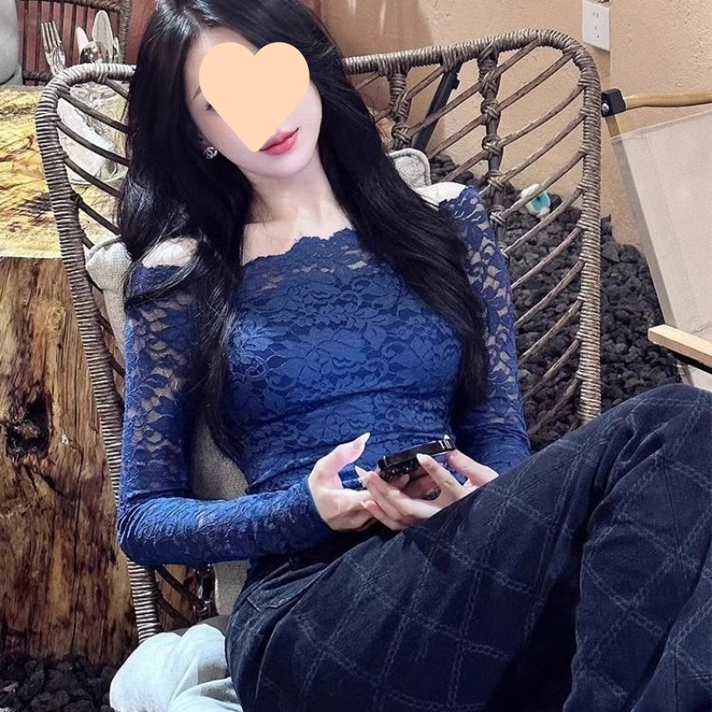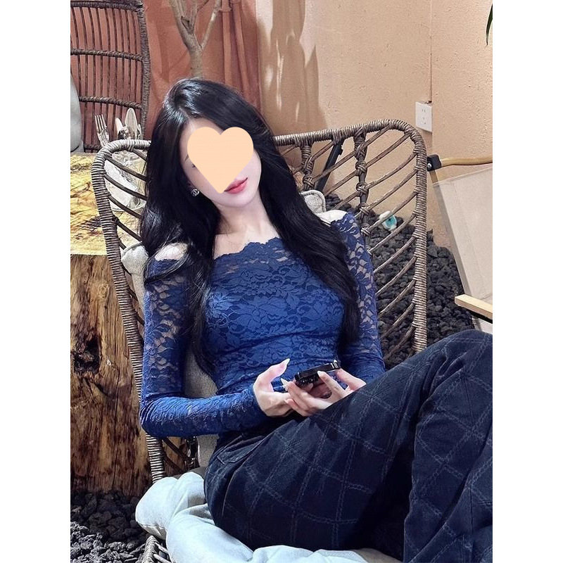2025 가을과 겨울 새로운 독특한 세련된 칼라 쇄골 최고 고급 블루 레이스 내베이스 셔츠스토어 가기