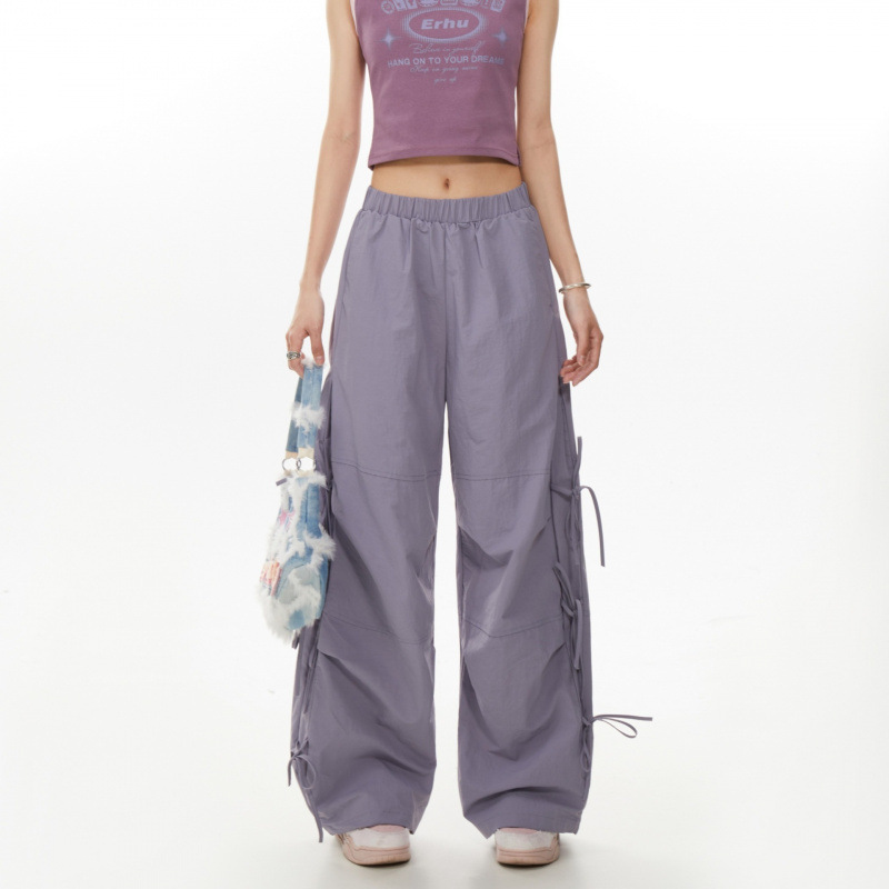 보라색 활 스트랩 여성용 여름 얇은 넓은 다리 캐주얼 바지 디자인 감각 느슨한 슬리밍 스트레이트 바지스토어 가기