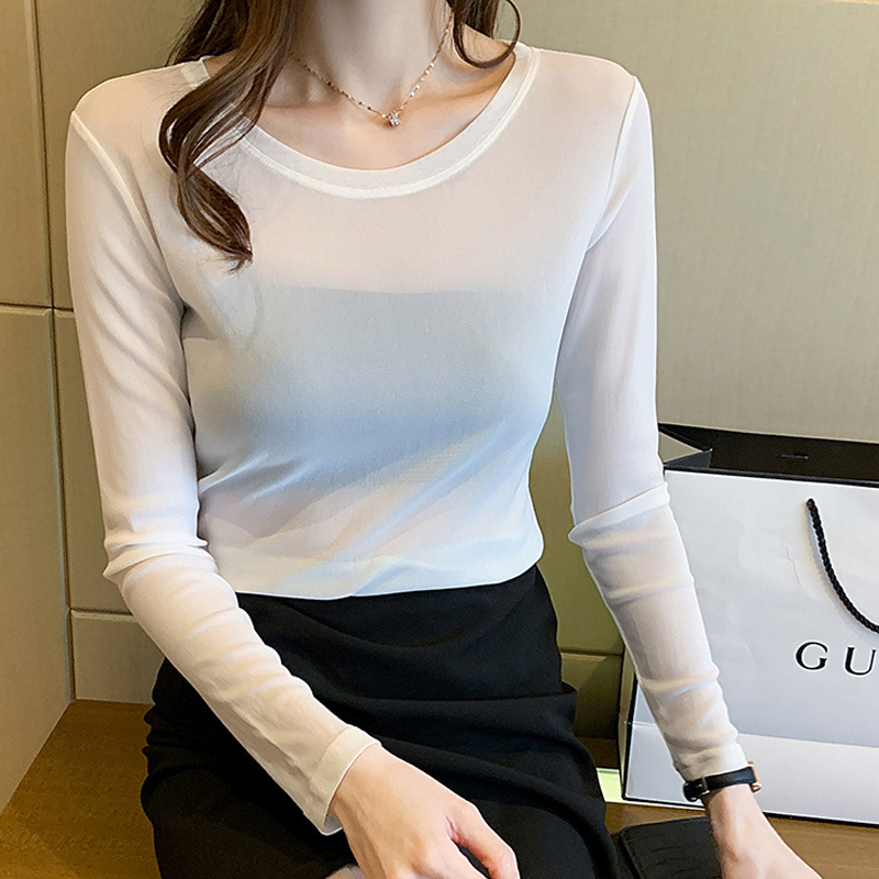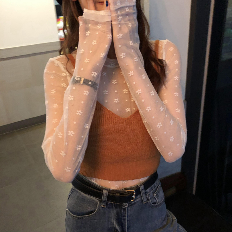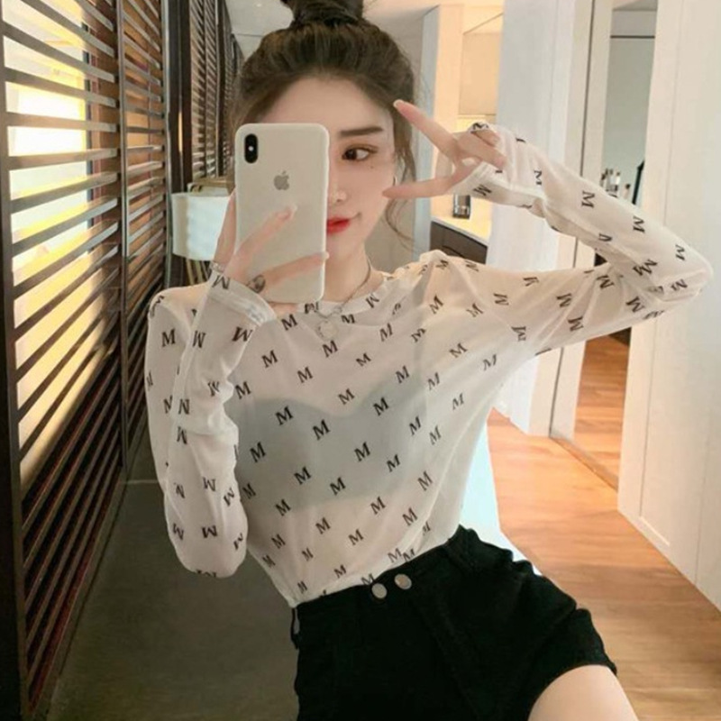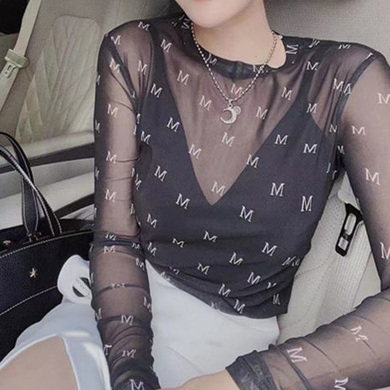 얇은 선 스크린 블라우스 최고 여성의 긴 소매 아이스 실크 티셔츠 단단한 내부 투명 툴레 인쇄 메쉬베이스 셔츠