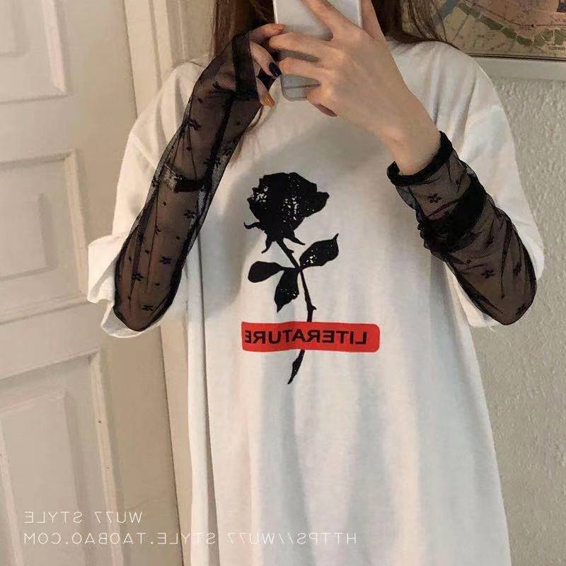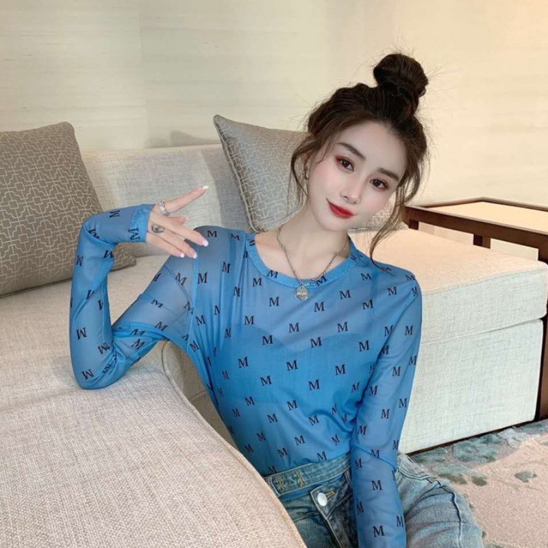 얇은 선 스크린 블라우스 최고 여성의 긴 소매 아이스 실크 티셔츠 단단한 내부 투명 툴레 인쇄 메쉬베이스 셔츠스토어 가기