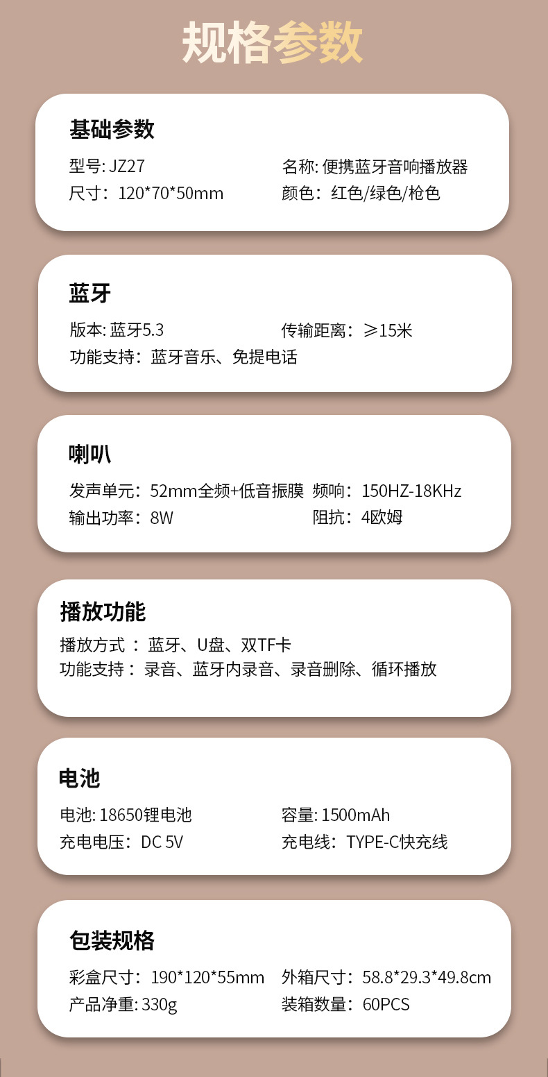 Jinzheng JZ27 무선 블루투스 스피커 휴대용 야외 홈 오디오 자동차 오버 웨이트 서브 우퍼 내부 녹음