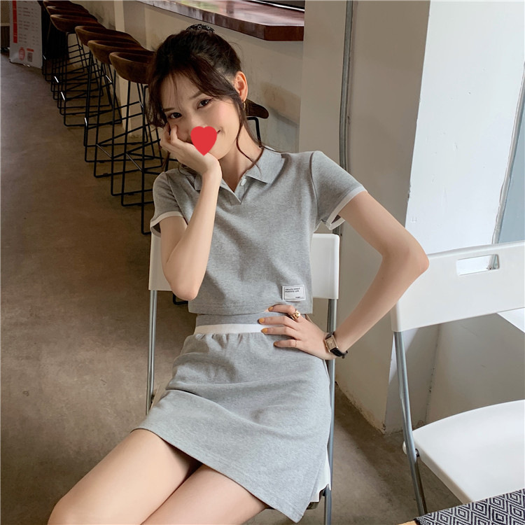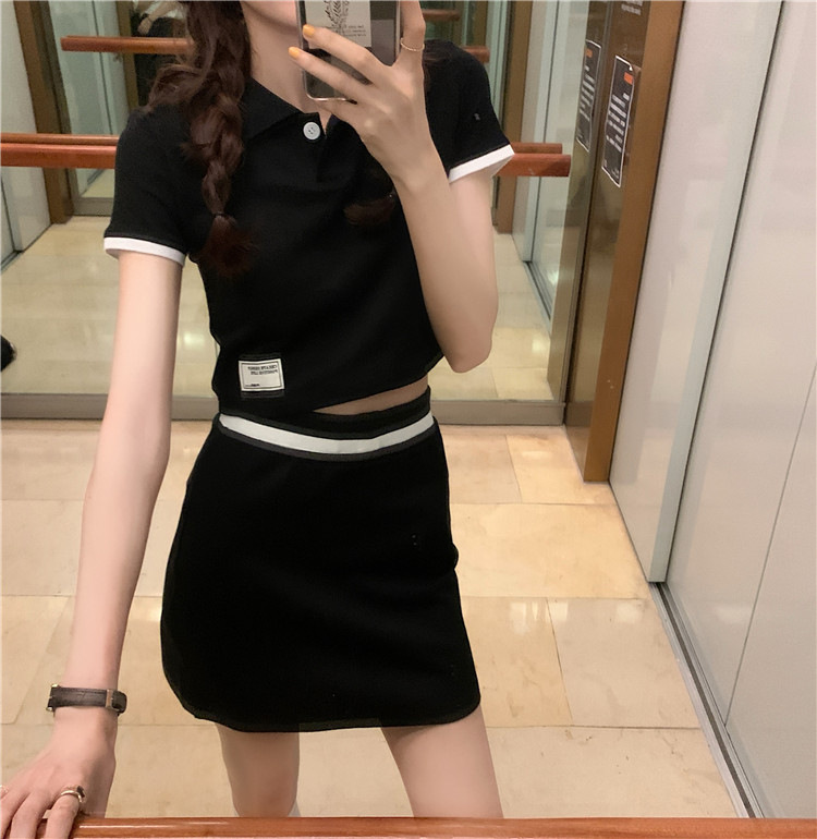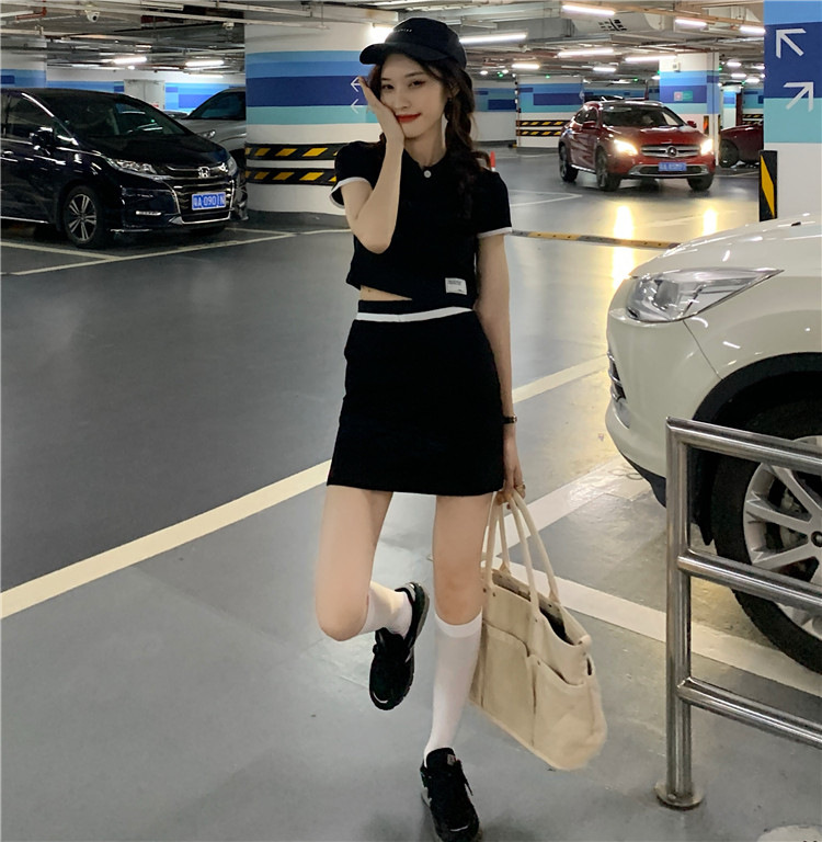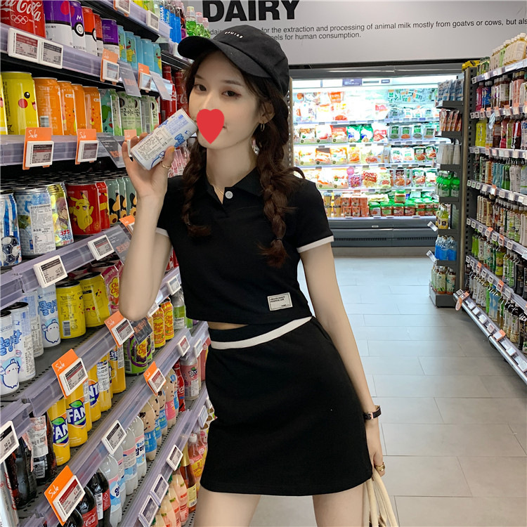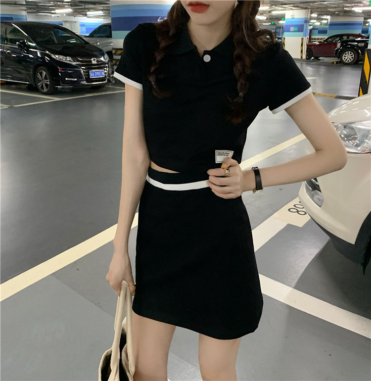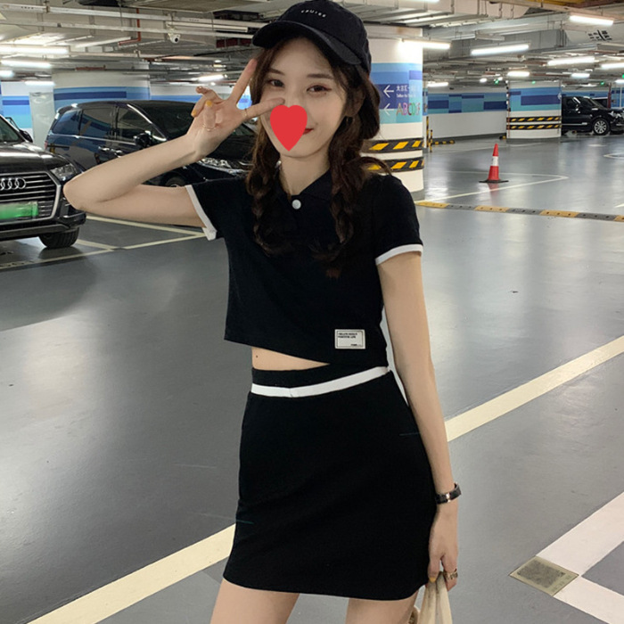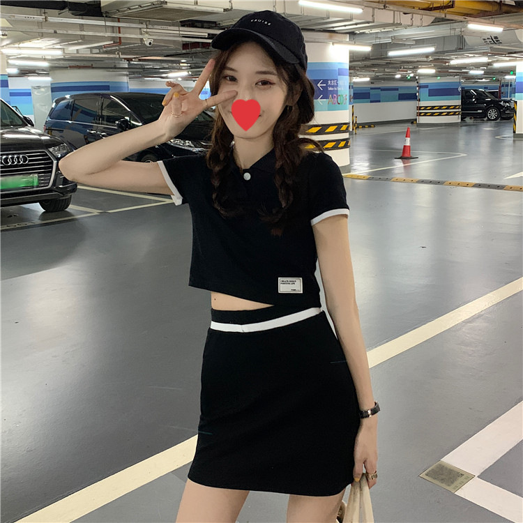인터넷 축하 폭발 여름 슬림 폴로 칼라 쇼트 탑 하이 웨이스트 힙 스커트 컬러 투피스 세트 여성 패션스토어 가기