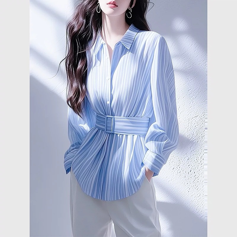 2025 이른 봄 새로운 블루 스트라이프 쉬폰 셔츠 Qi Hao Mi No.6 가게 프랑스 우아한 허리 전문 셔츠