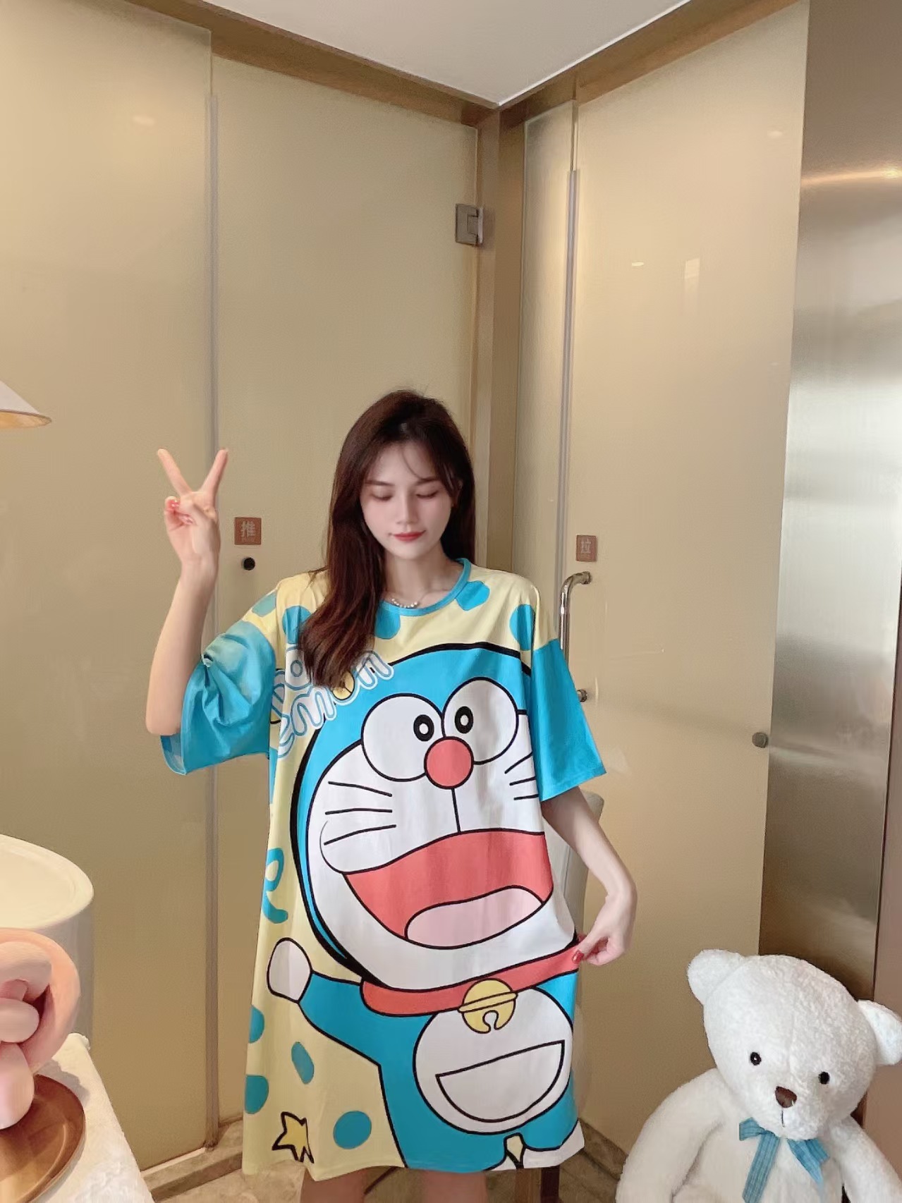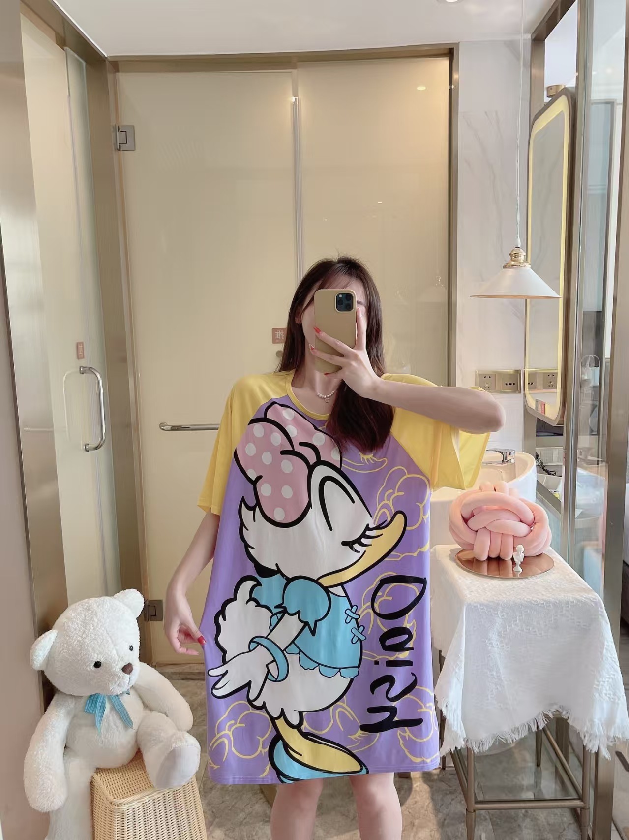 [국경 간] 게으른 스타일 플러스 사이즈 여성 잠옷 반팔 느슨한 둥근 목 귀여운 만화 인쇄 홈 옷스토어 가기