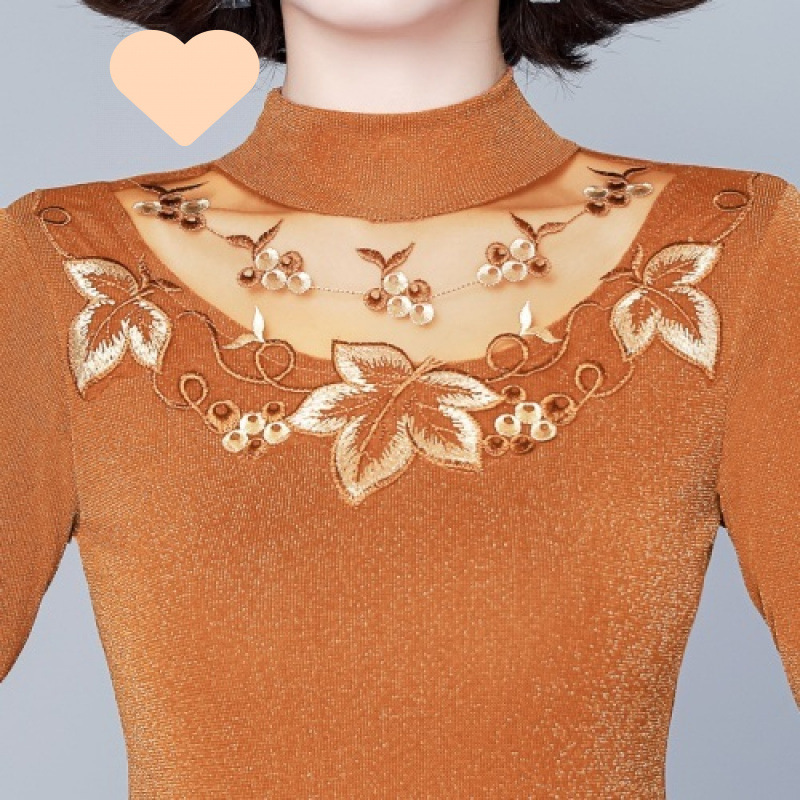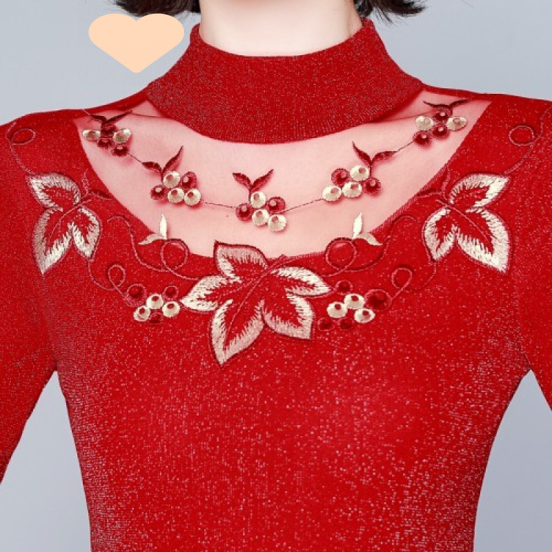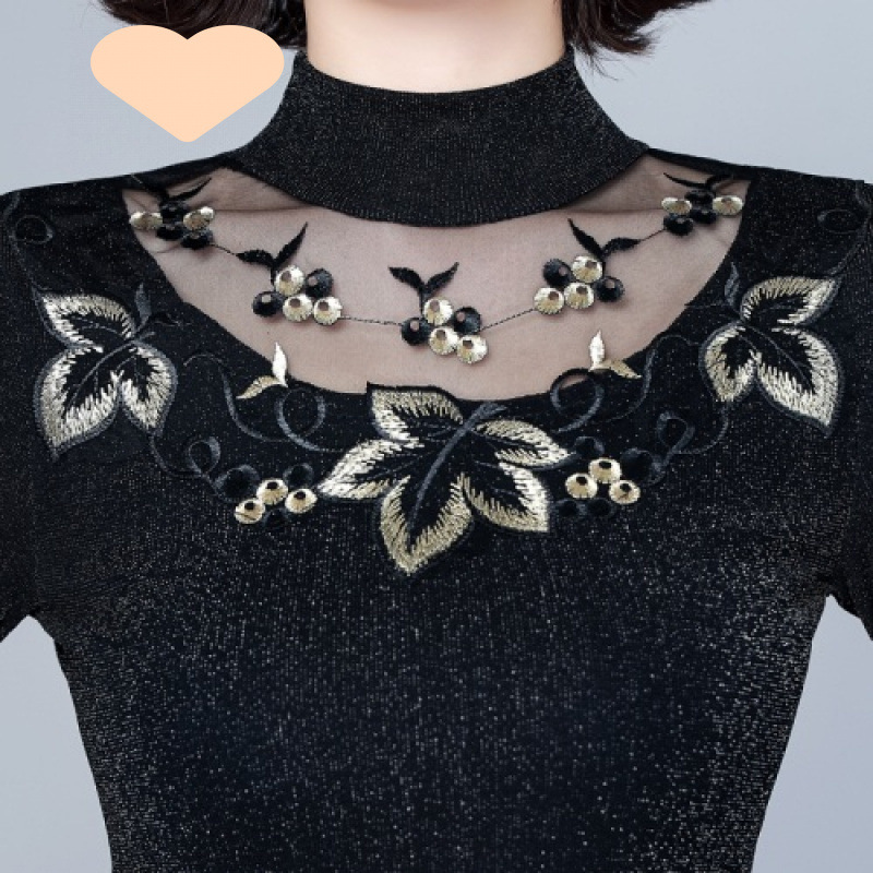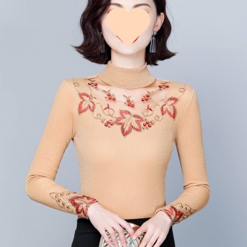 반 높이 칼라 세련된 레이스베이스 셔츠 여성의 가을과 겨울 새로운 유행 슬림핏 내부 자수 밝은 실크 메쉬 탑