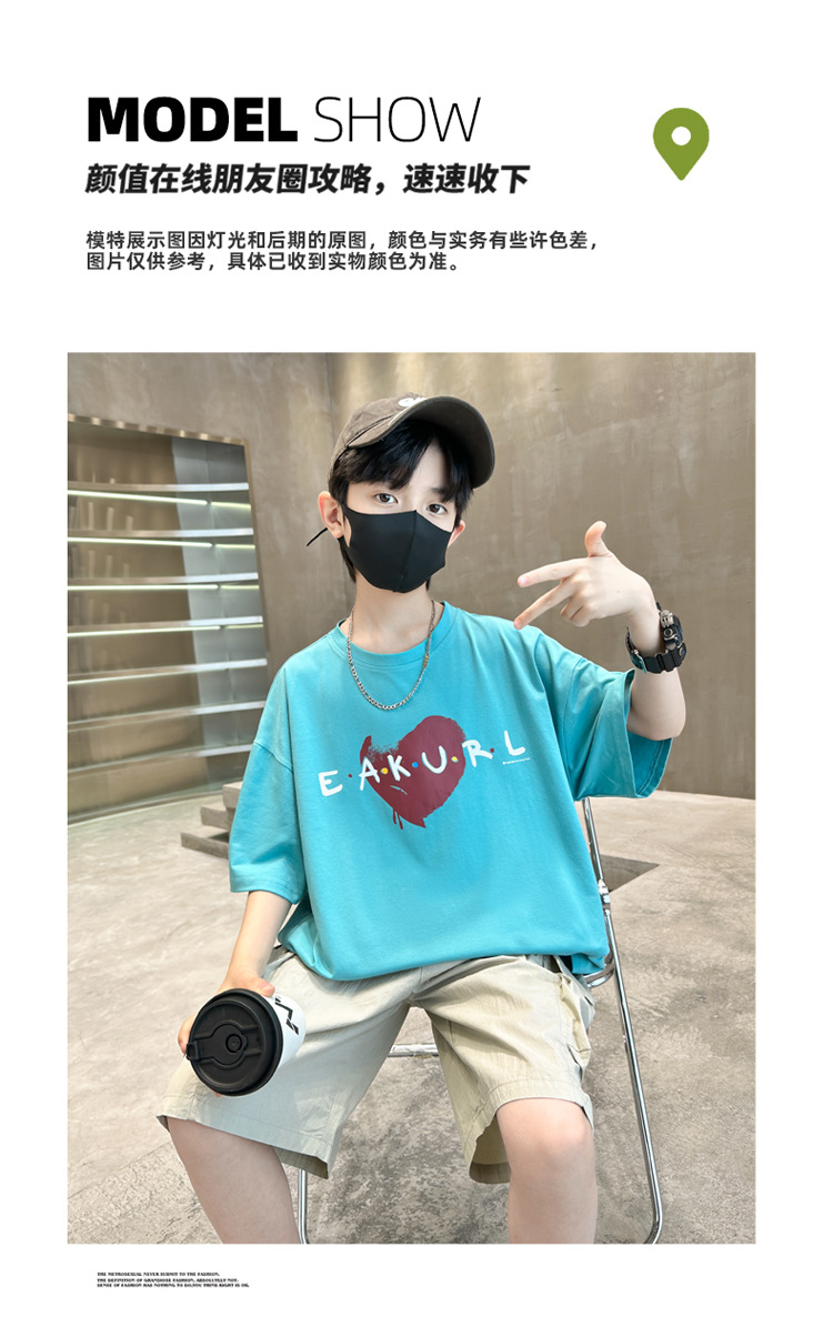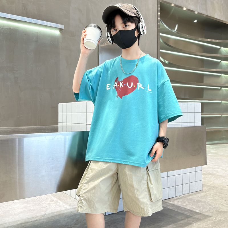 소년 여름 세트 2025 새로운 어린이 캐주얼 느슨한 사랑 인쇄 반팔 티셔츠 짧은 투피스 세트스토어 가기
