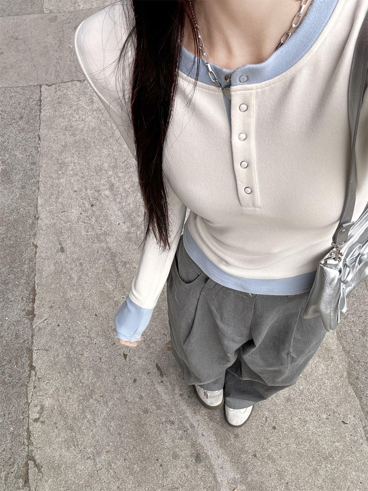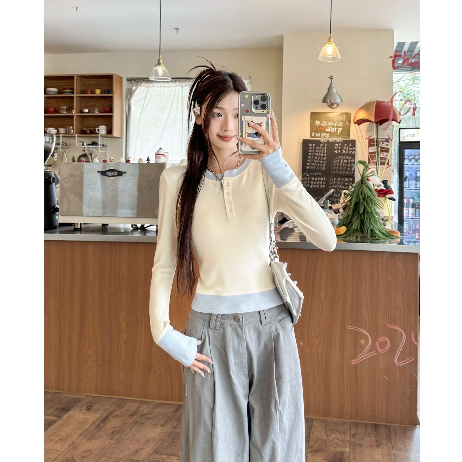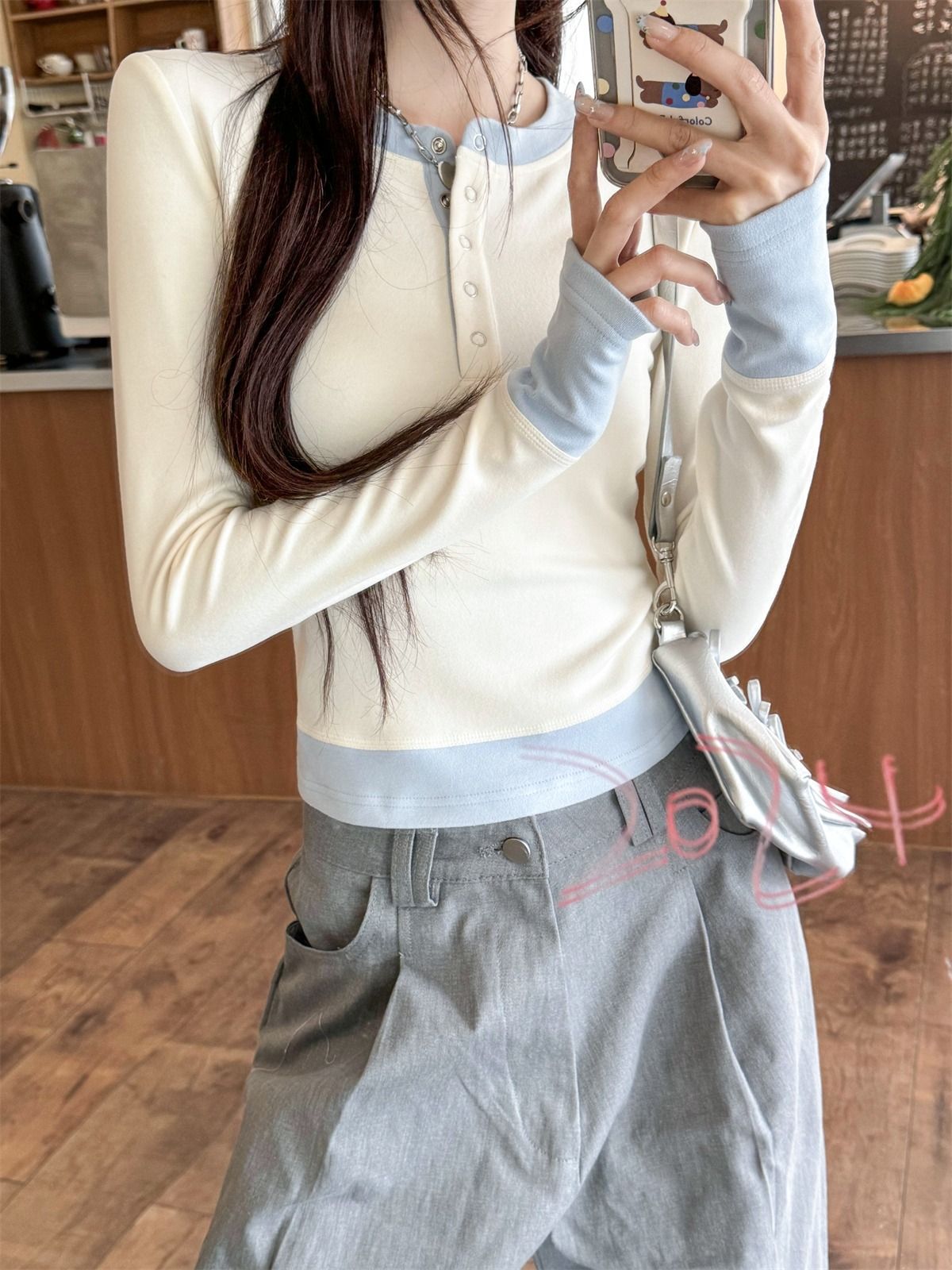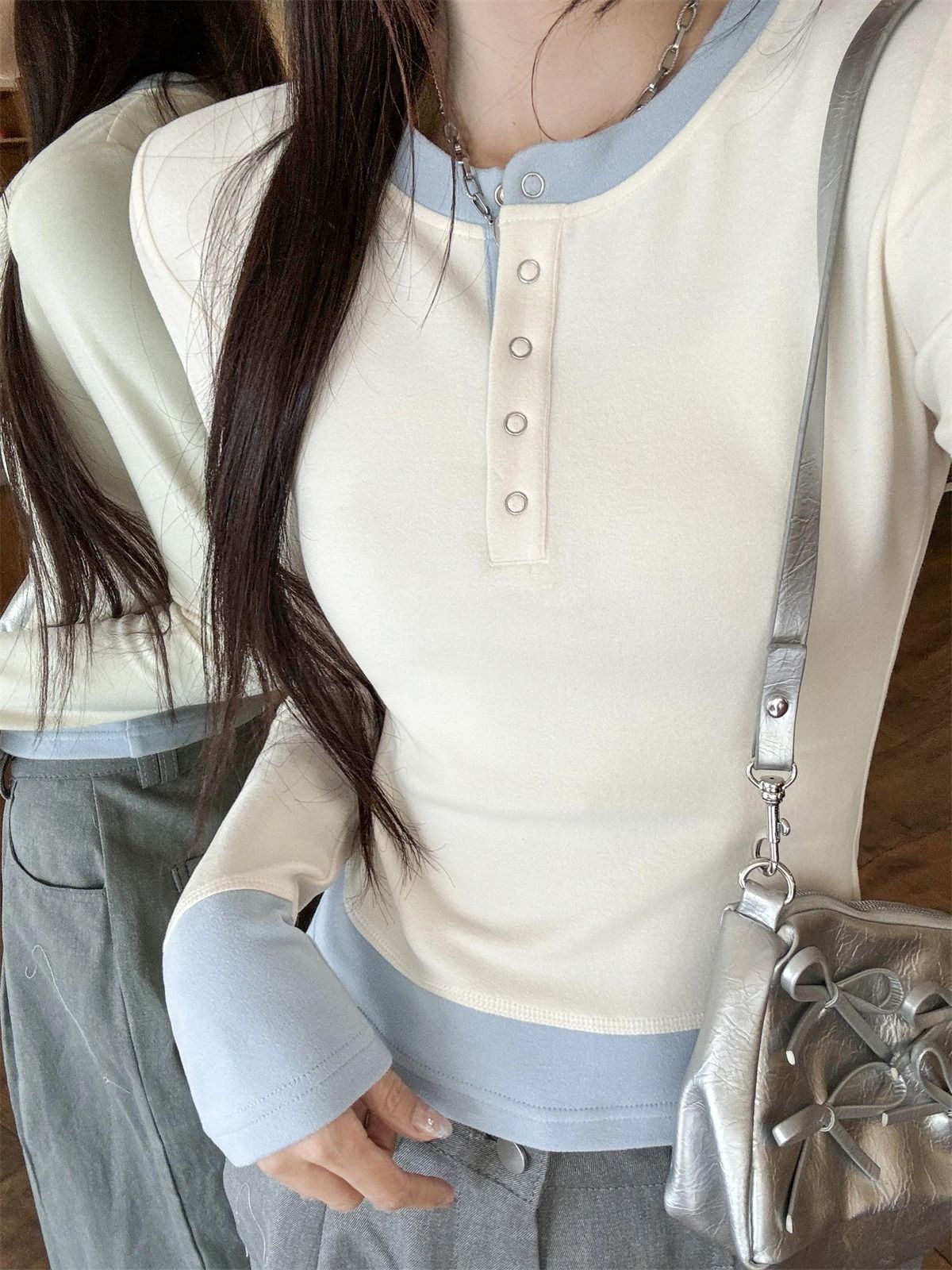 화이트베이스 셔츠 이너 탑 여자 이른 봄 새로운 슬림 핏 탑 크루 넥 가짜 투피스 긴팔 티셔츠스토어 가기