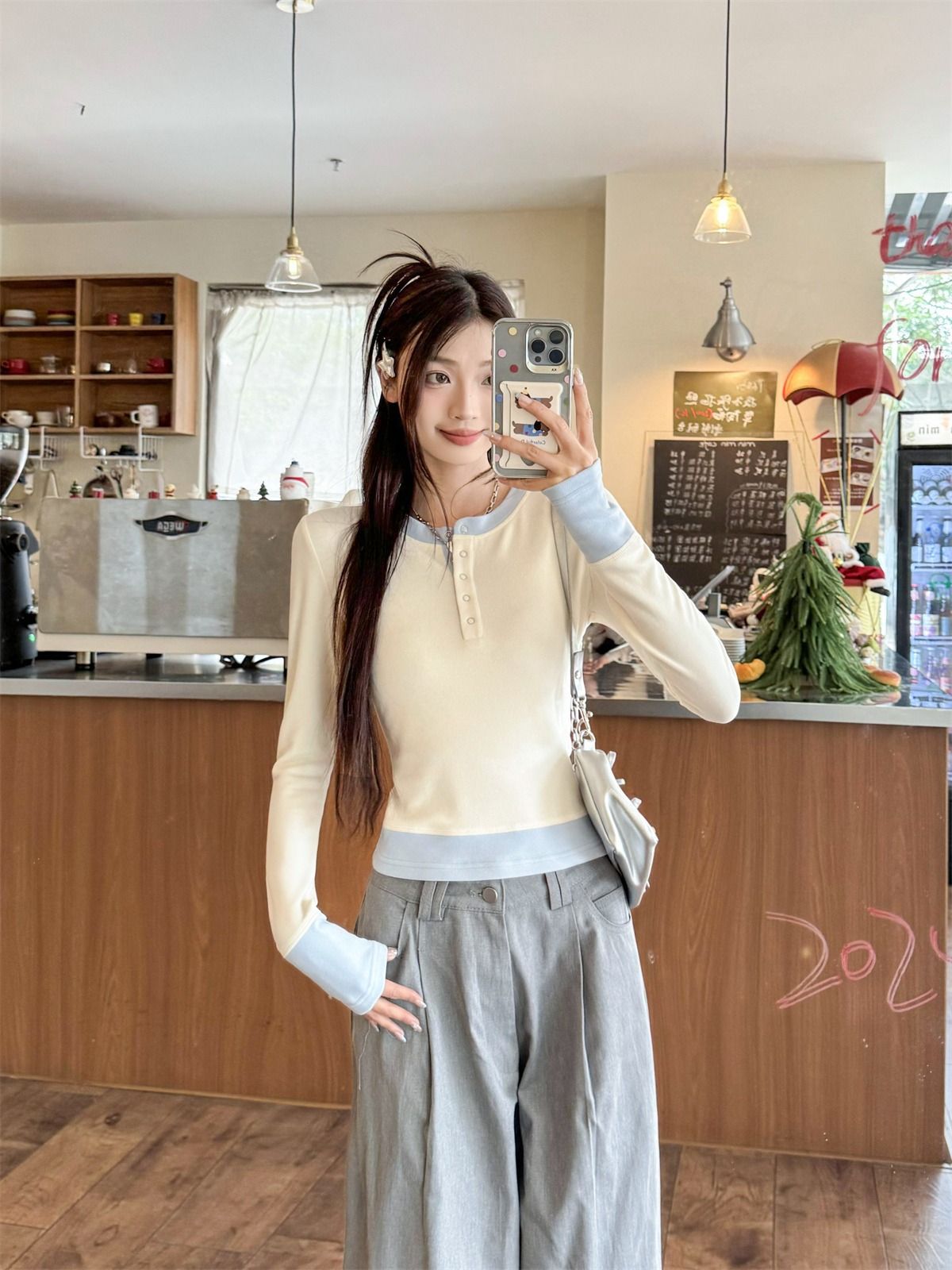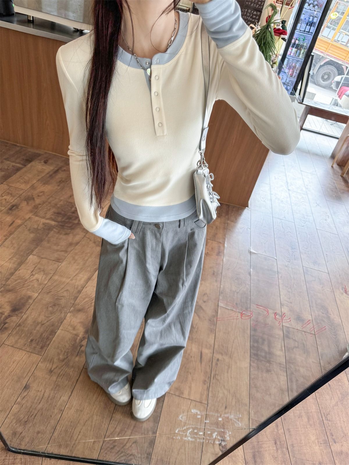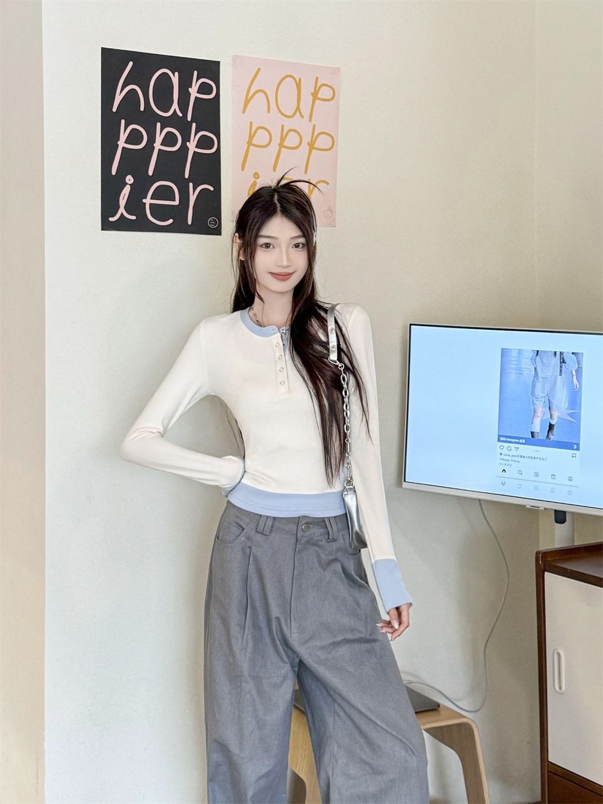 화이트베이스 셔츠 이너 탑 여자 이른 봄 새로운 슬림 핏 탑 크루 넥 가짜 투피스 긴팔 티셔츠스토어 가기