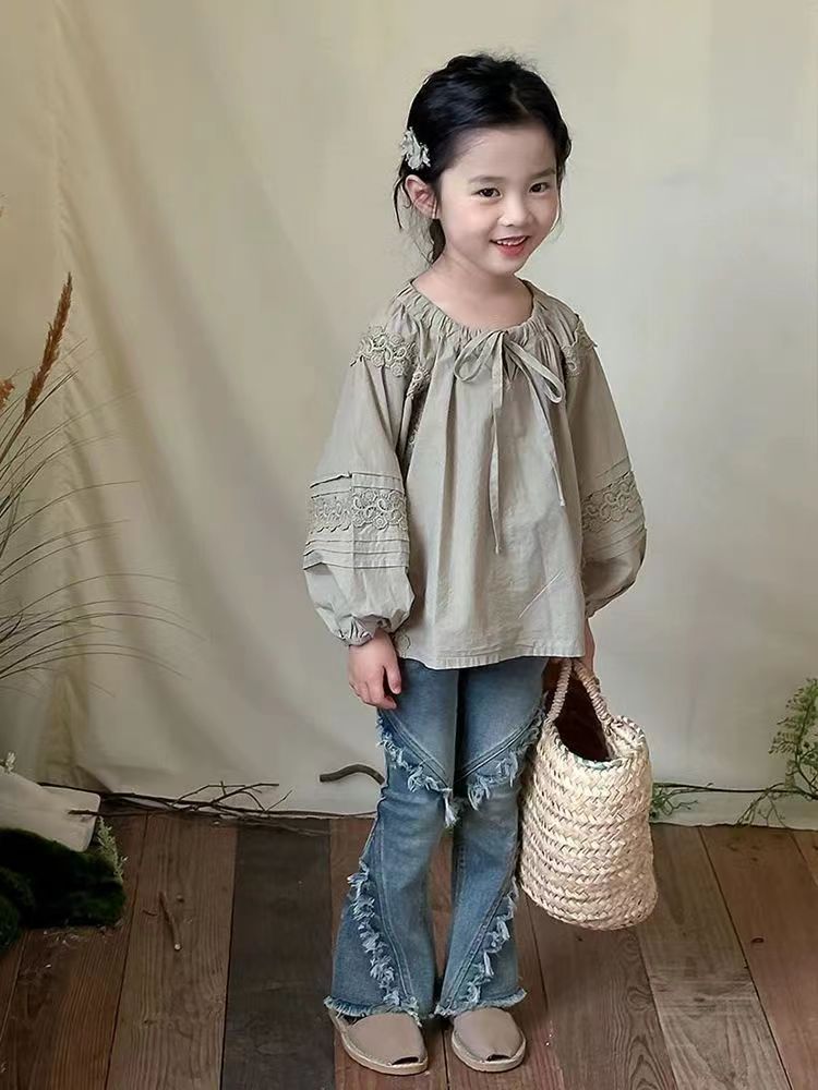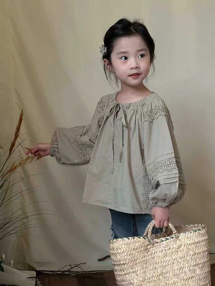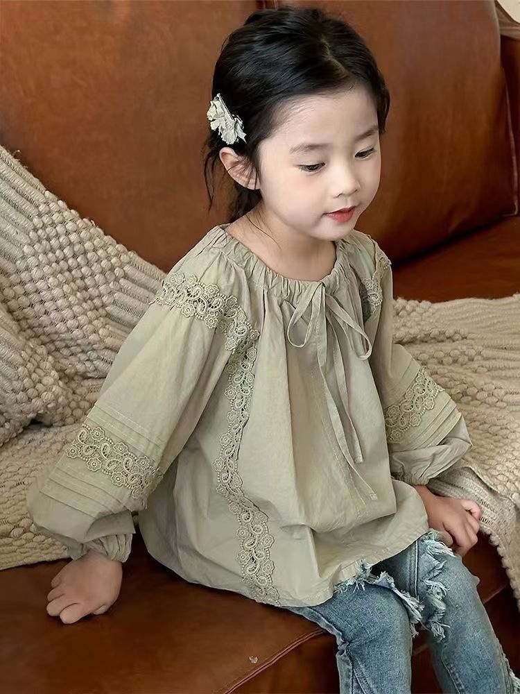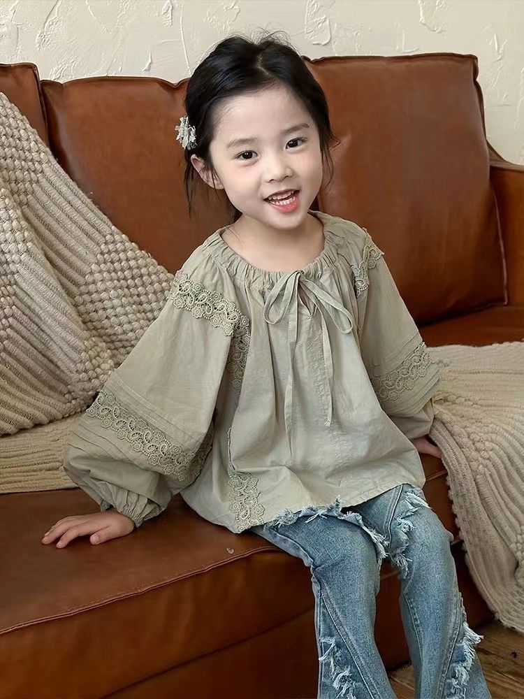여자 모리 인형 셔츠 2025 봄 새로운 어린이 복고풍 레이스 셔츠 아기의 이른 봄 탑 한국 스타일