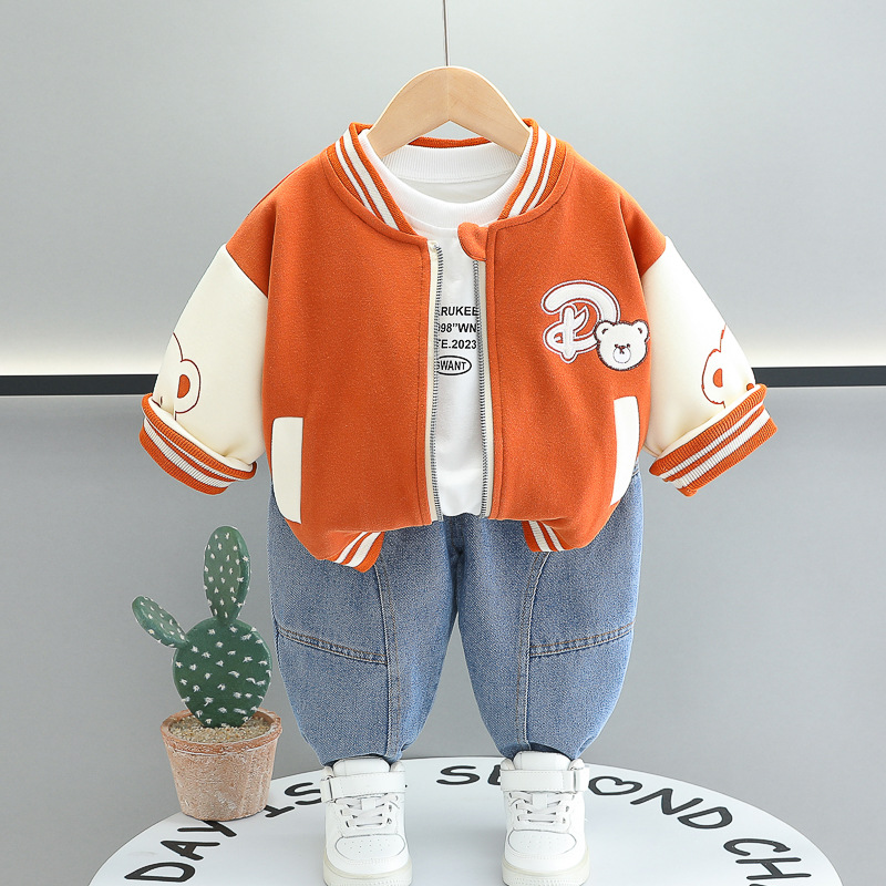 소년의 봄 세트 2025 봄과 가을 새로운 어린이 만화 곰 야구 세트 재킷 서양식 어린이 3 피스 세트
