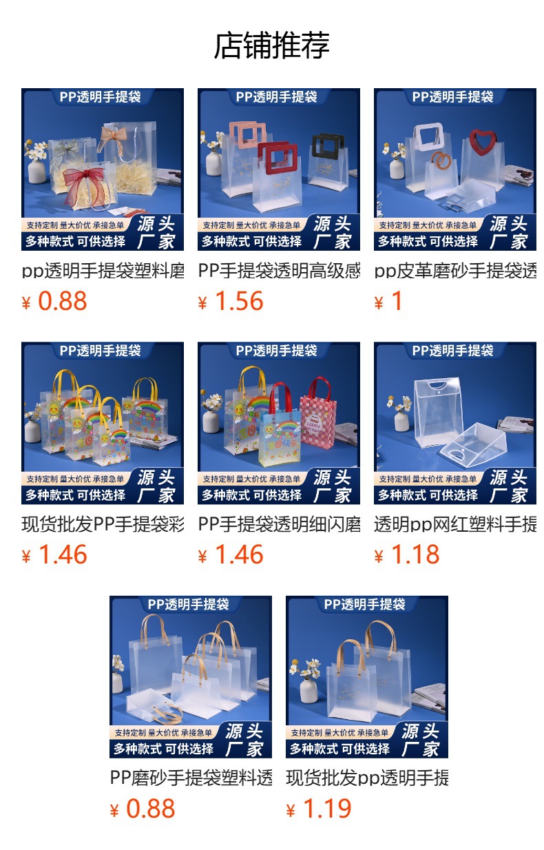 PP 투명 핸드백, 맞춤형 플라스틱 반투명 선물 가방, 기념품 가방, 고급 재고 도매, 인쇄 가능스토어 가기