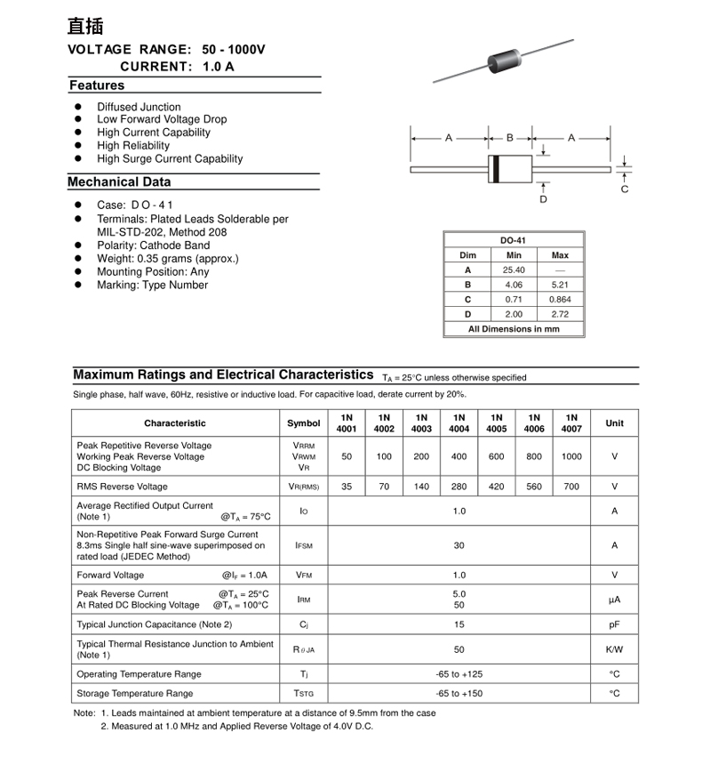 1 N4007 5819 5408 5401 5404 5822 6A10A10 IN4001 정류기 다이오드 인라인
