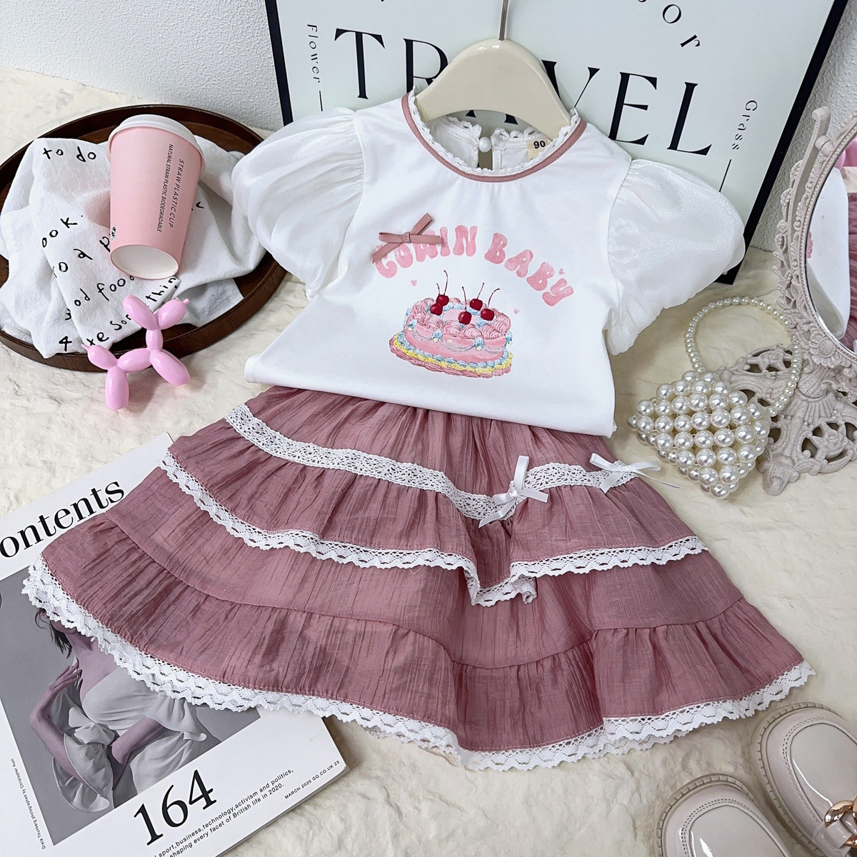 소녀 로리타 세트 여름 새로운 어린 소녀 레이스 투투 원피스 짧은 소매 탑 투피스 세트스토어 가기