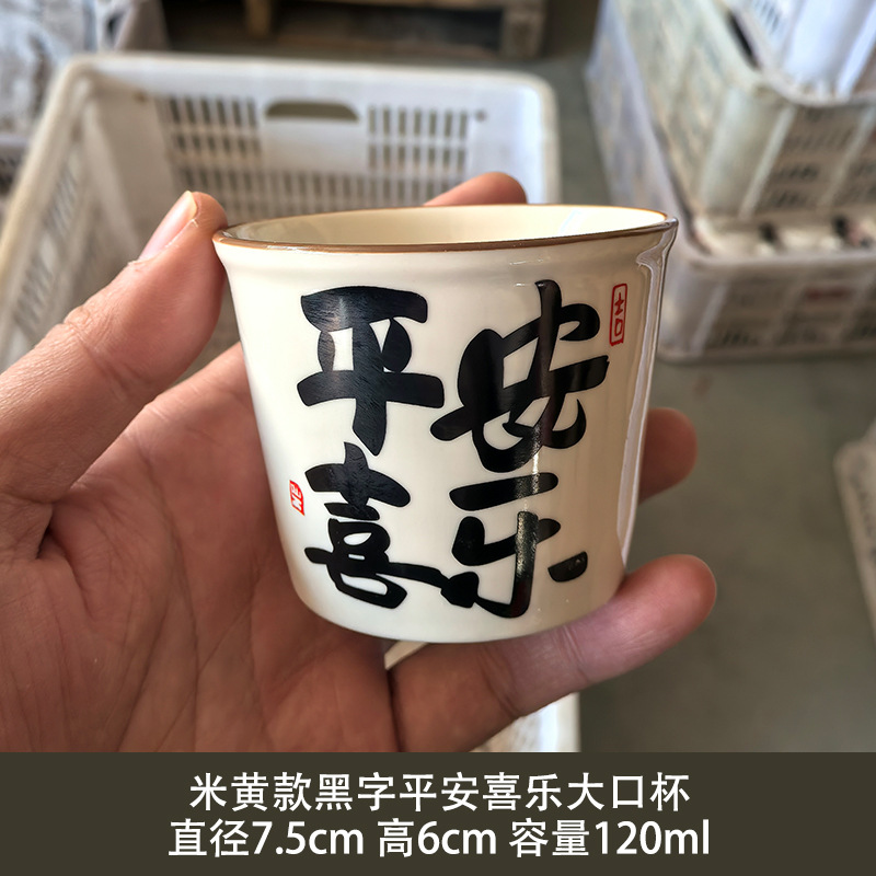 • 베이지색과 검정색 글자가 있는 해피 싱글 컵