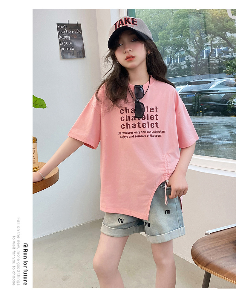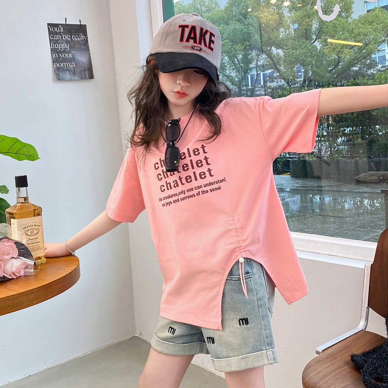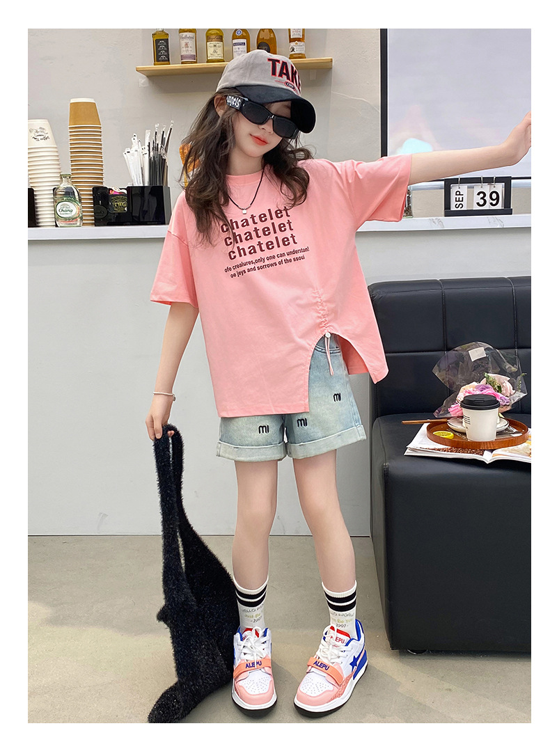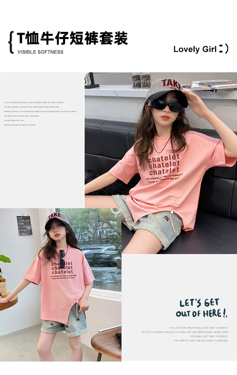 오렌지 타이거 걸스 여름 반팔 티셔츠 세트 2025 신소녀 여름 데님 반바지 어린이 유행스토어 가기