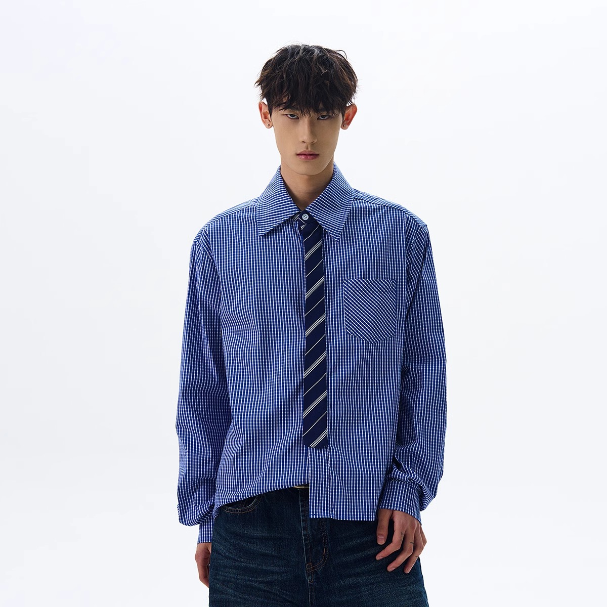 라이트 블루 격자 무늬 셔츠 남자 일본식 레트로 세트 내부 긴 소매 셔츠 하이 엔드 스프링 웨어 재킷